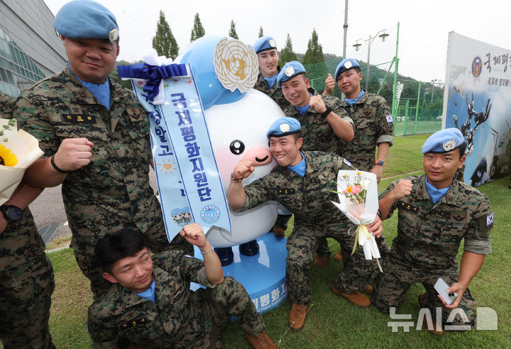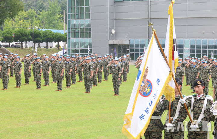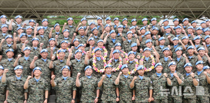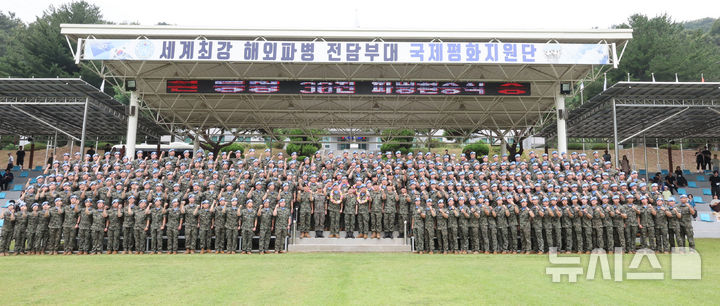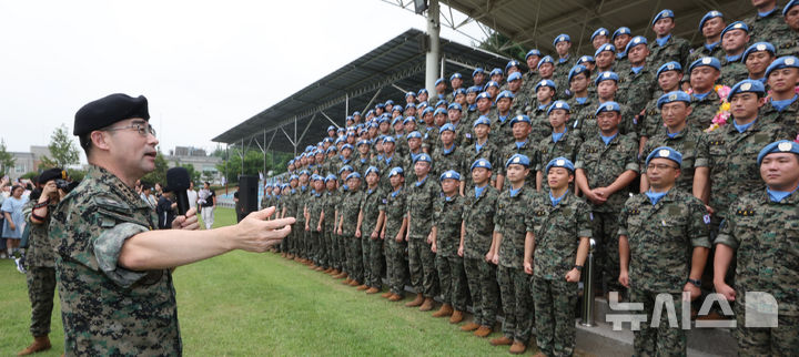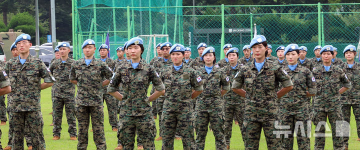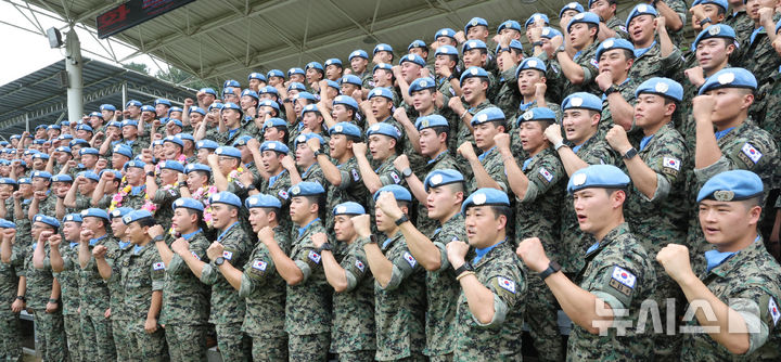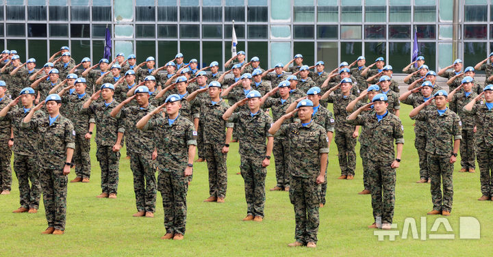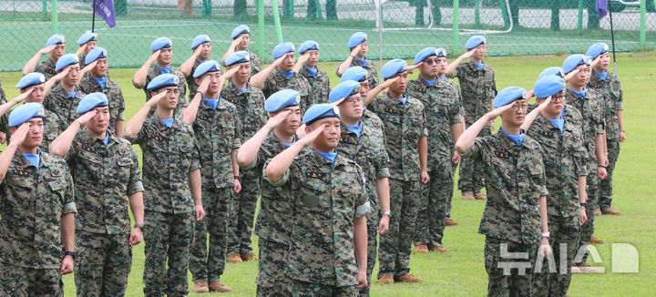 【NEWSIS】レバノン平和維持団「東明部隊」第30陣の将兵らが26日午前、仁川市桂陽区の国際平和支援団で開かれた派兵歓送式で、派兵申告を行っている様子。