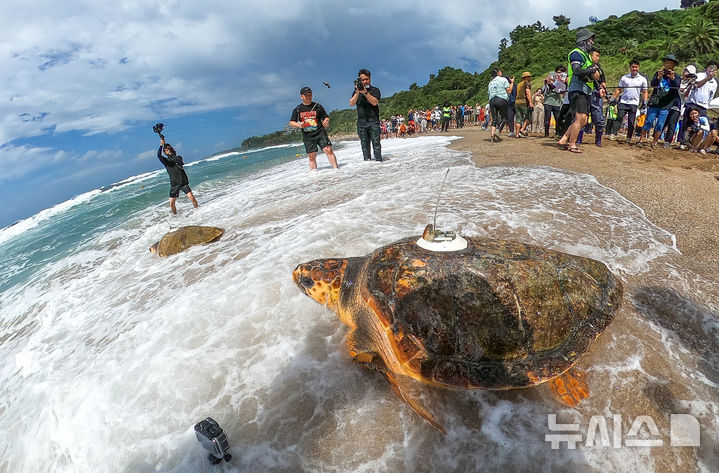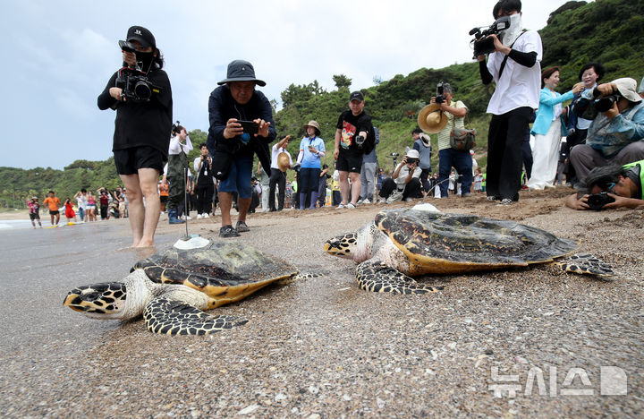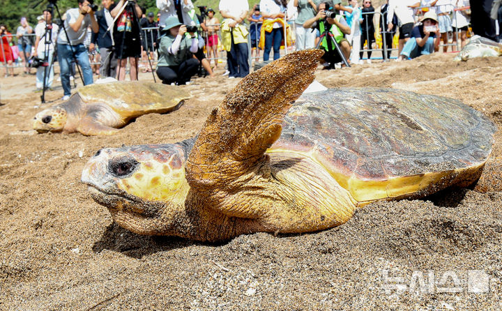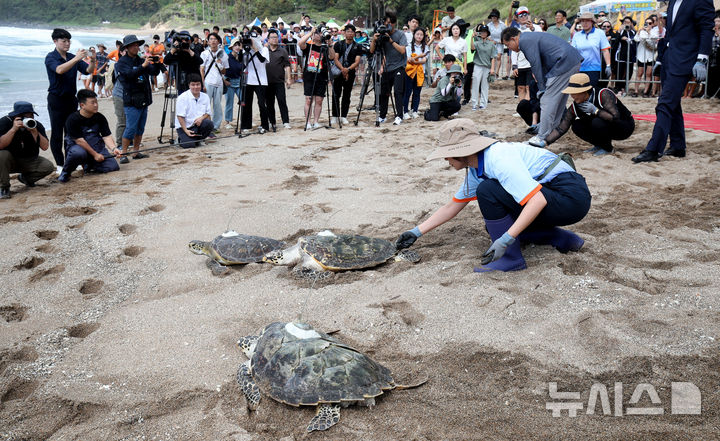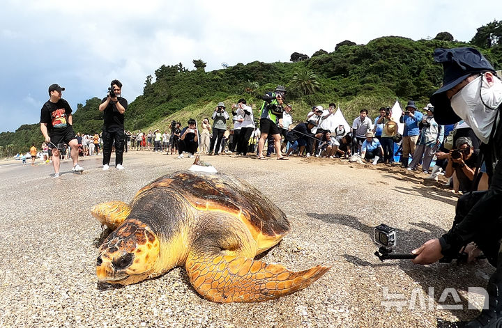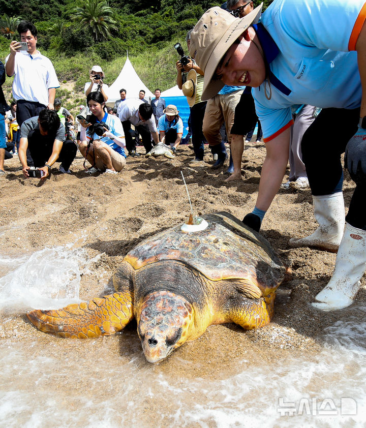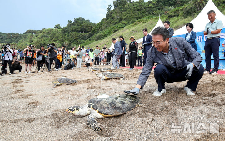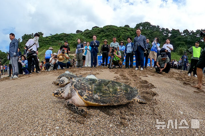 済州・西帰浦市中文の穡達海辺で28日午前、海洋水産部(省に相当)主催のウミガメの自然放流イベントが開かれた。ウミガメは世界的に個体数が減少しており、全ての種が国際自然保護連合(IUCN)の「レッドリスト」にも載っている。