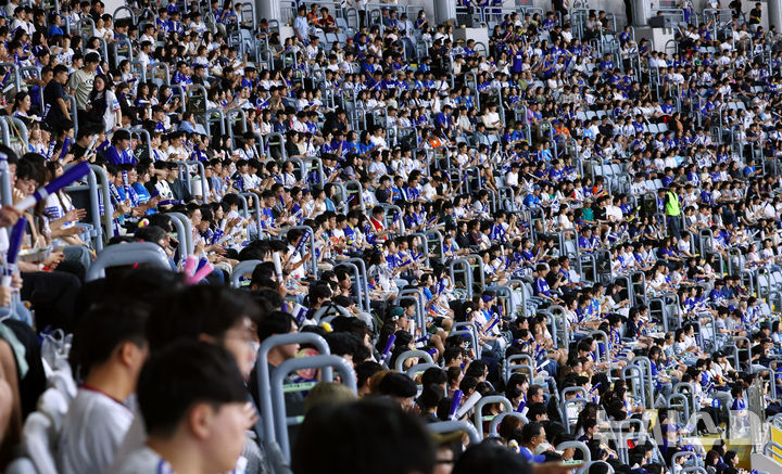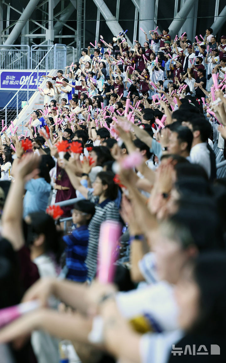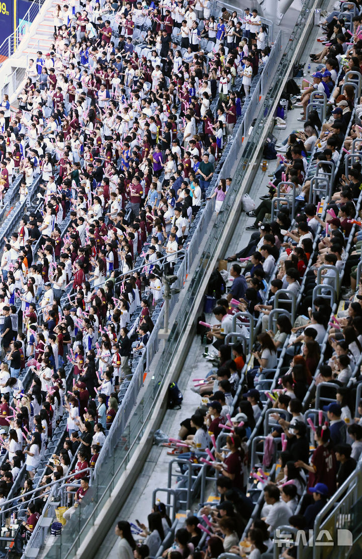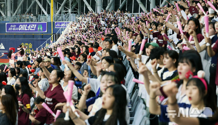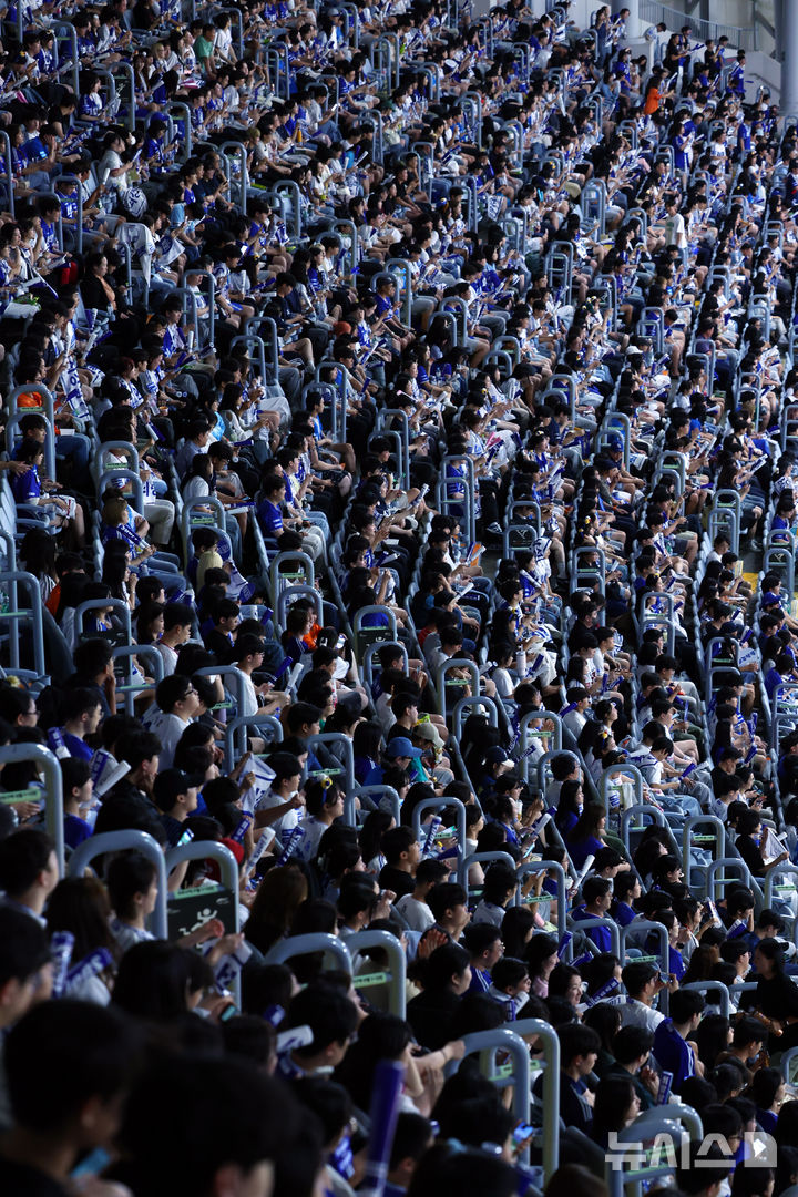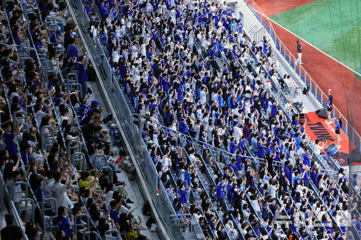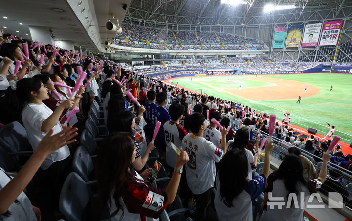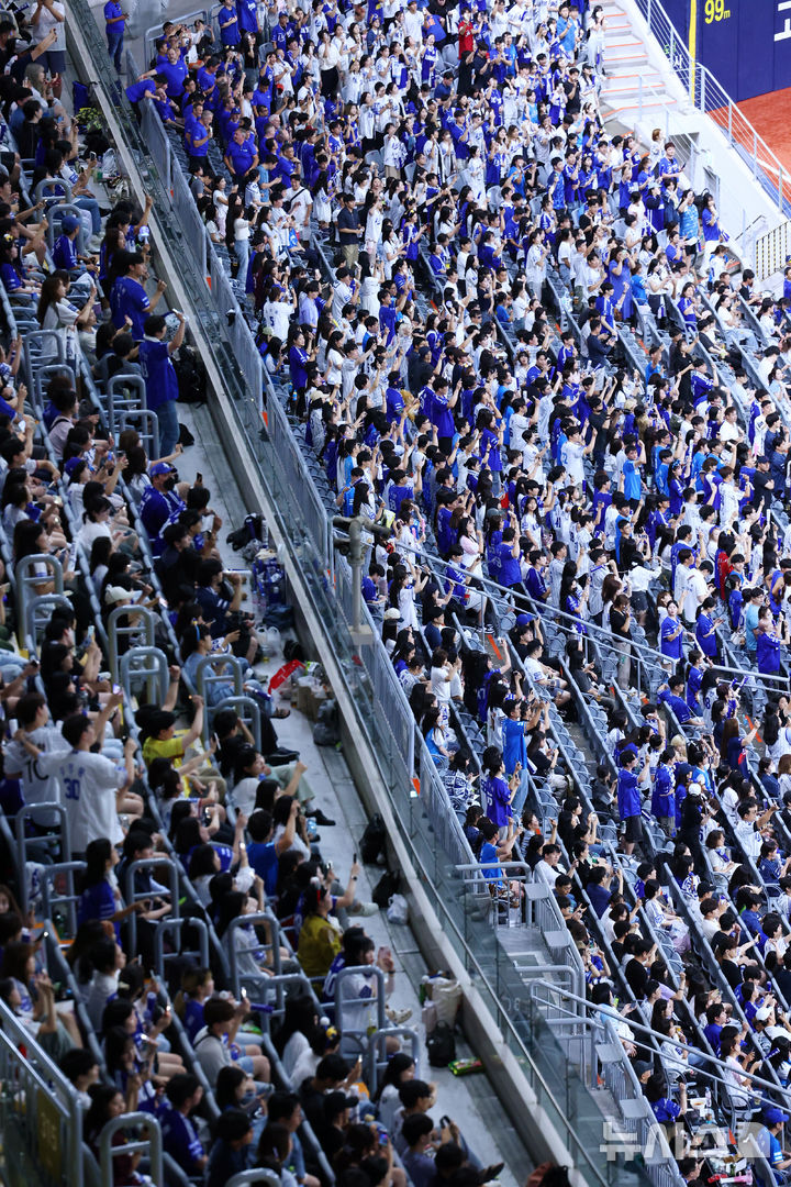 【NEWSIS】入場者数の新記録を連日更新している韓国プロ野球。今季の入場者数は韓国プロ野球史上初めて900万人に達した。写真は28日、ソウル市九老区の高尺スカイドームで行われた2024 KBO(韓国プロ野球)リーグのサムスン・ライオンズ対キウム・ヒーローズ戦で、声援を送る観客たち。