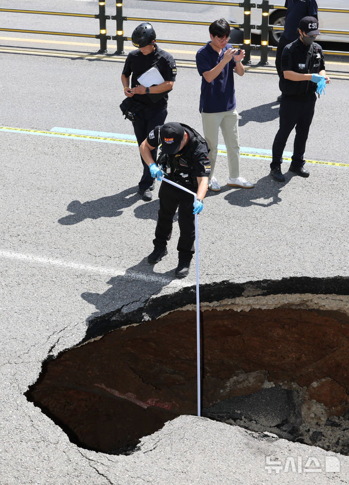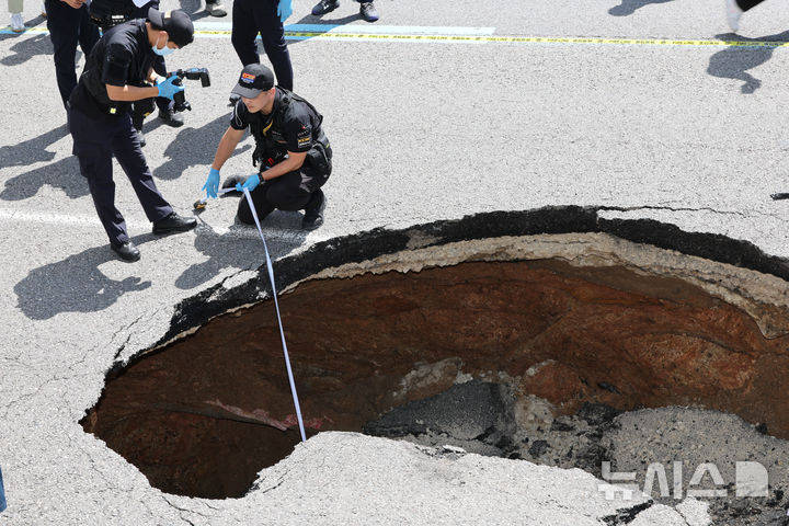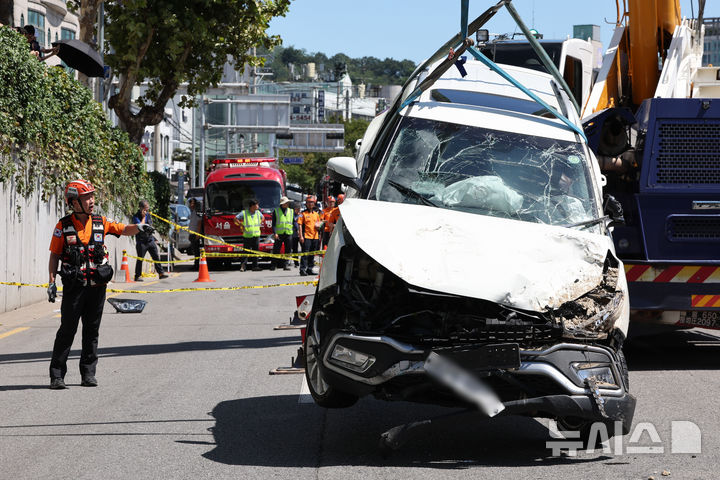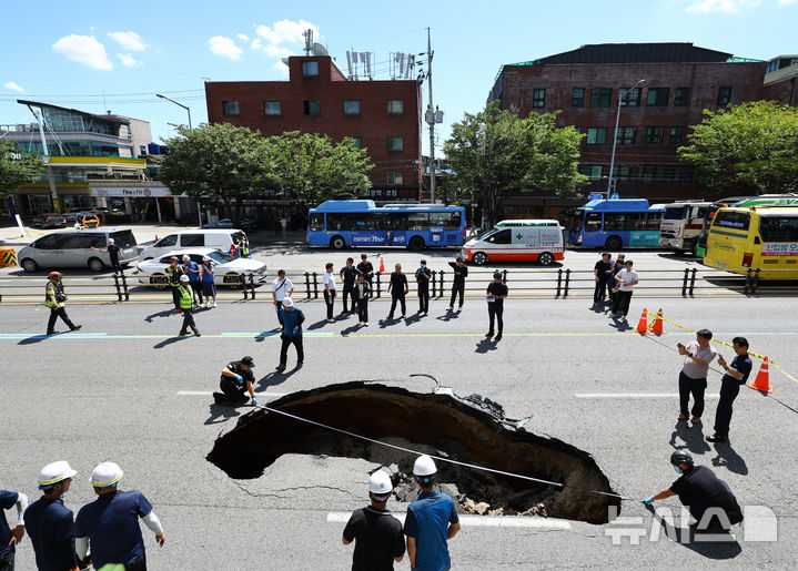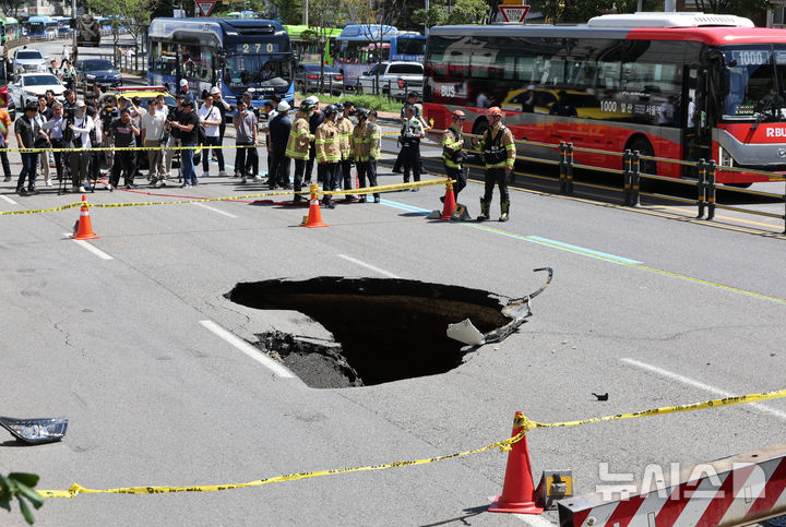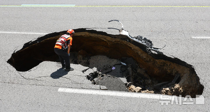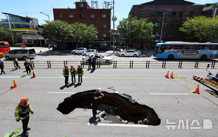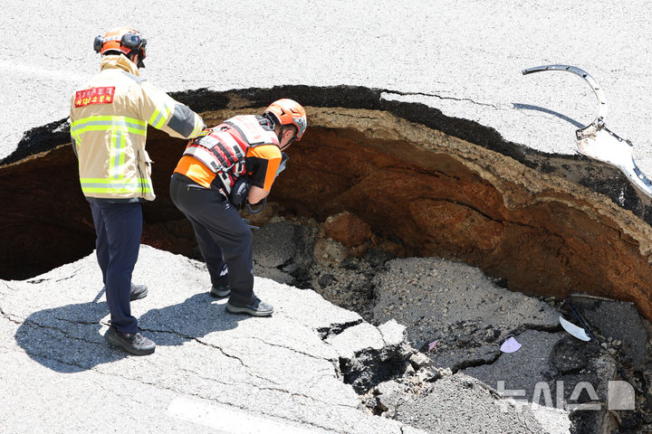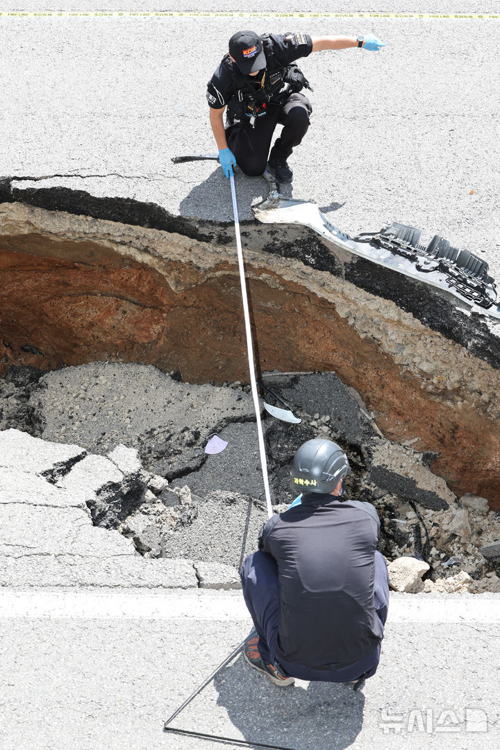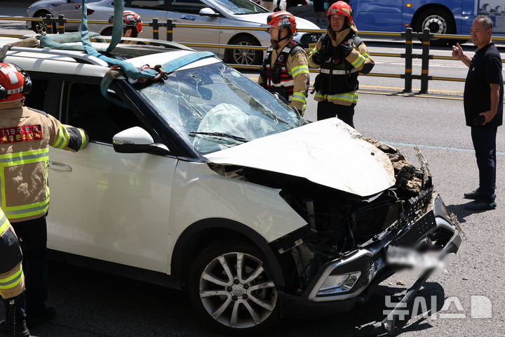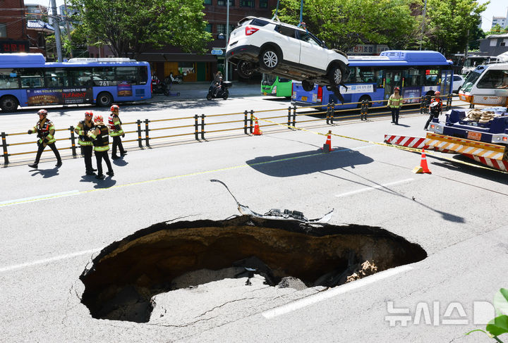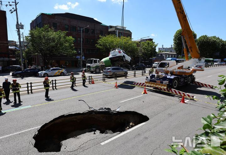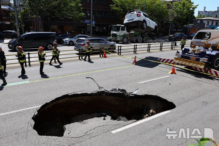 【NEWSIS】29日午後、ソウル市西大門区城山路のモレネ高架車道近くで発生した路面陥没現場で、吊り上げ・けん引される事故車両の様子。