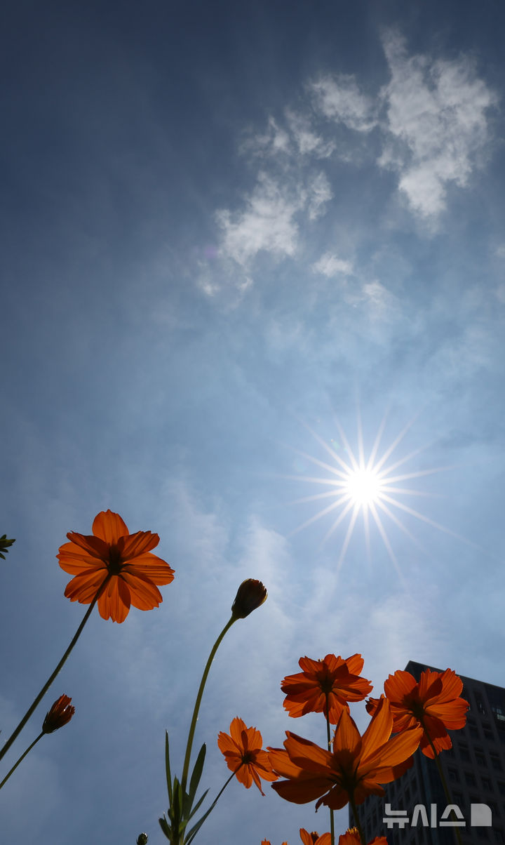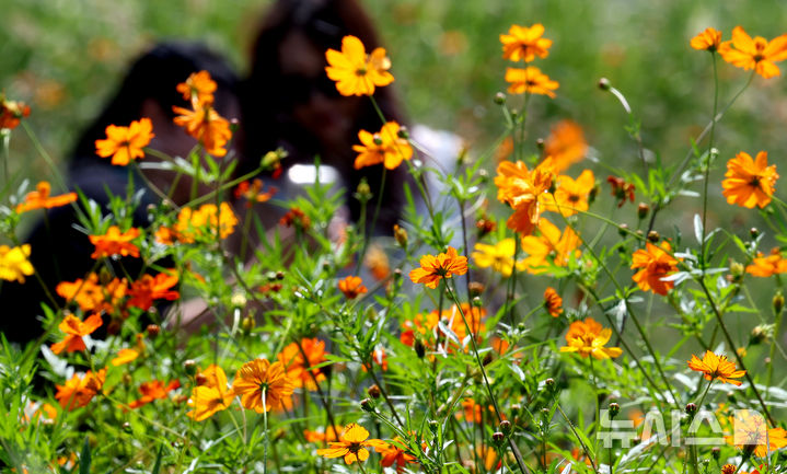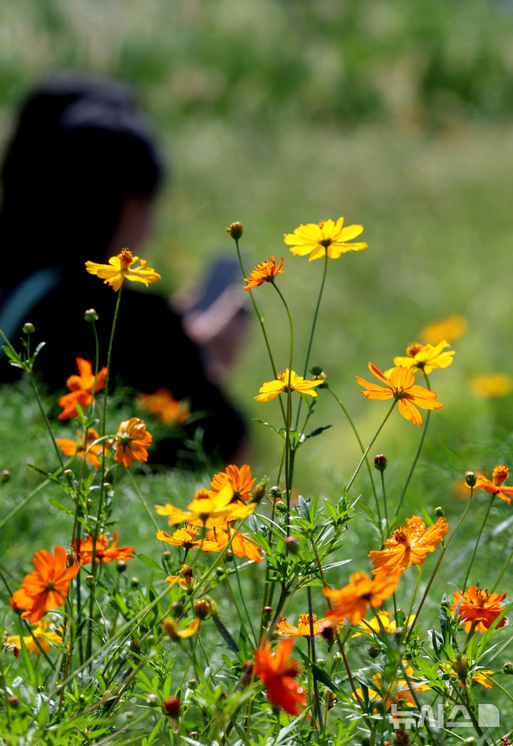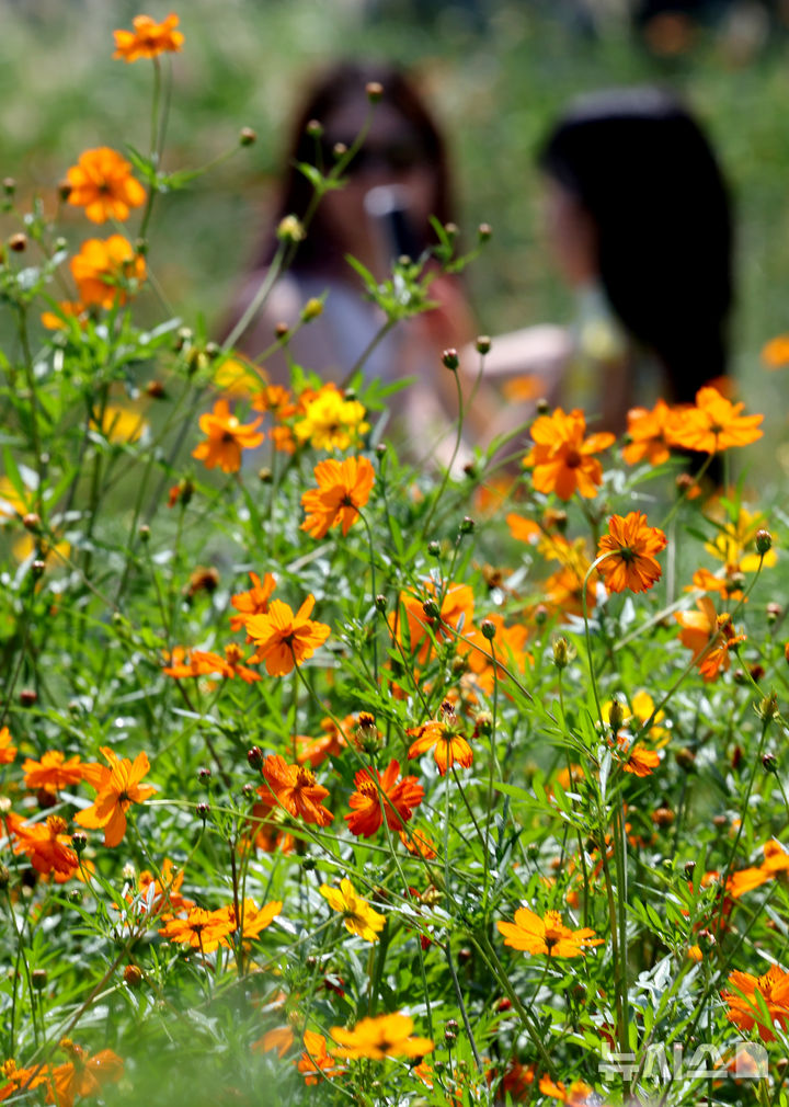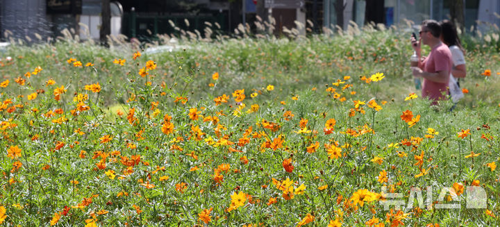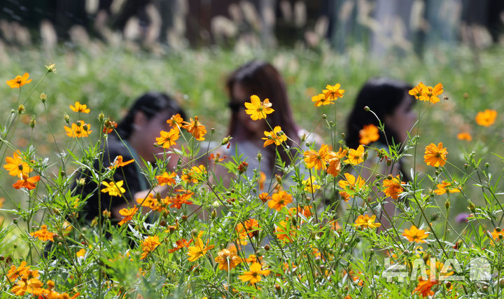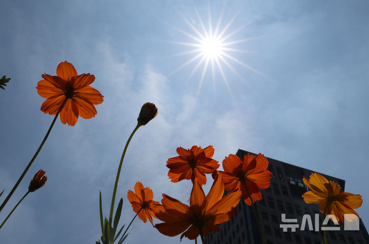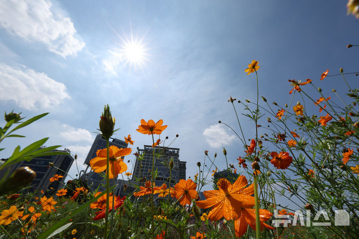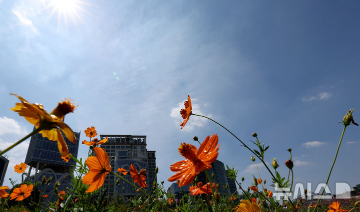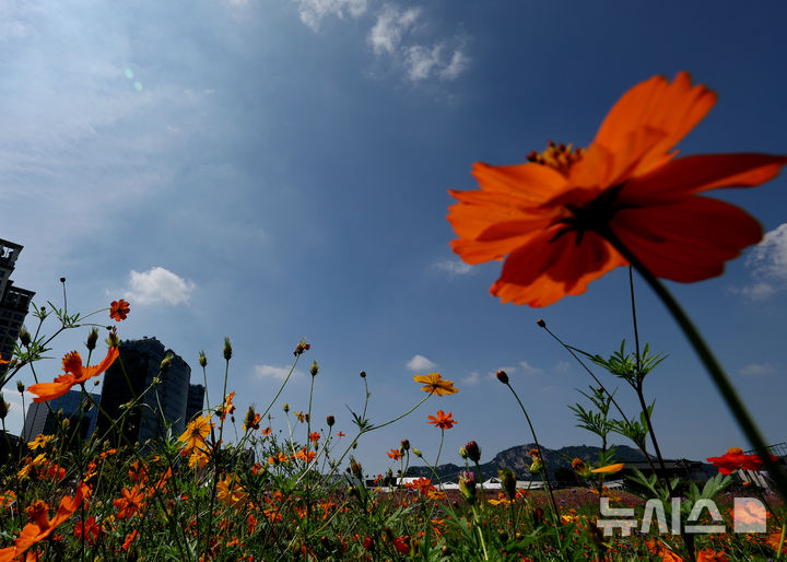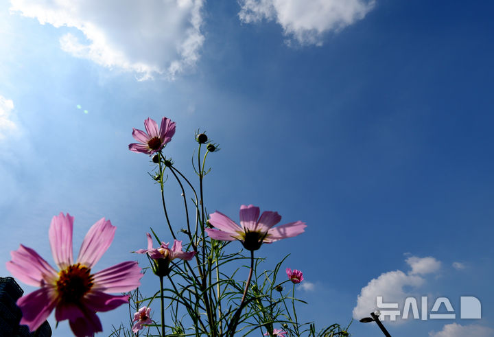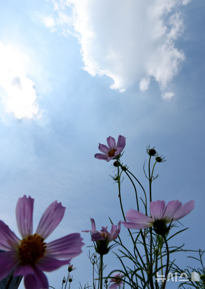 【NEWSIS】ソウル市と仁川市で38日ぶりに猛暑特別警報が解除された1日、ソウル市鍾路区の松ヒョン緑地広場では秋の花コスモスと青空から秋の気配が感じられた。