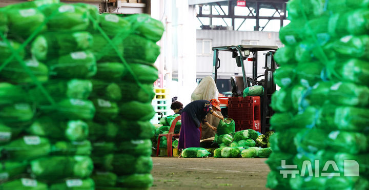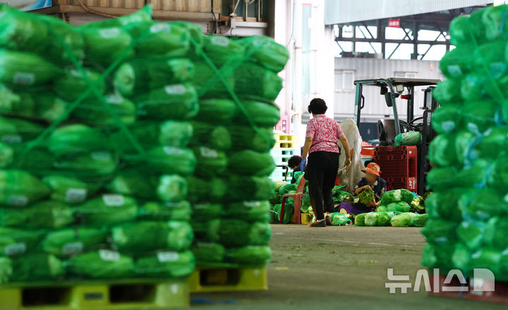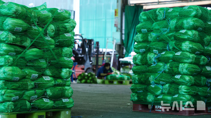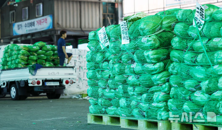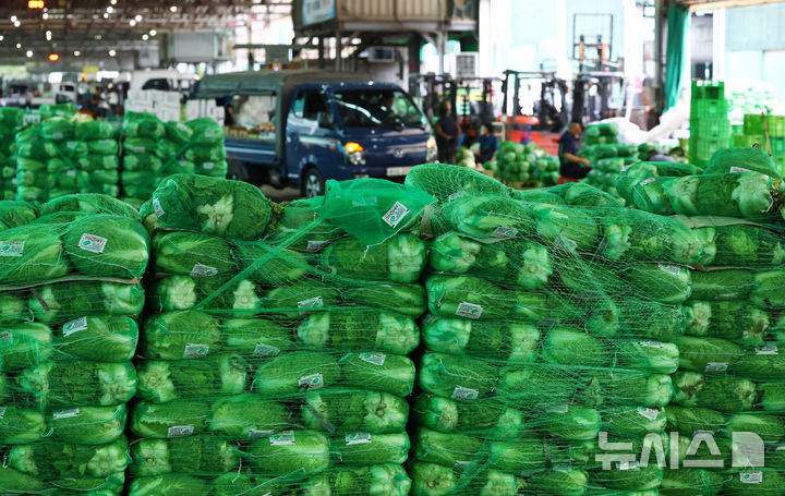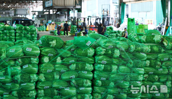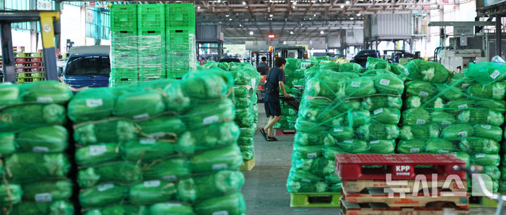 【NEWSIS】猛暑などでハクサイの価格も高騰している。写真は2日、ソウル市松坡区の可楽農水産物総合卸売市場に積み上げられたハクサイ。