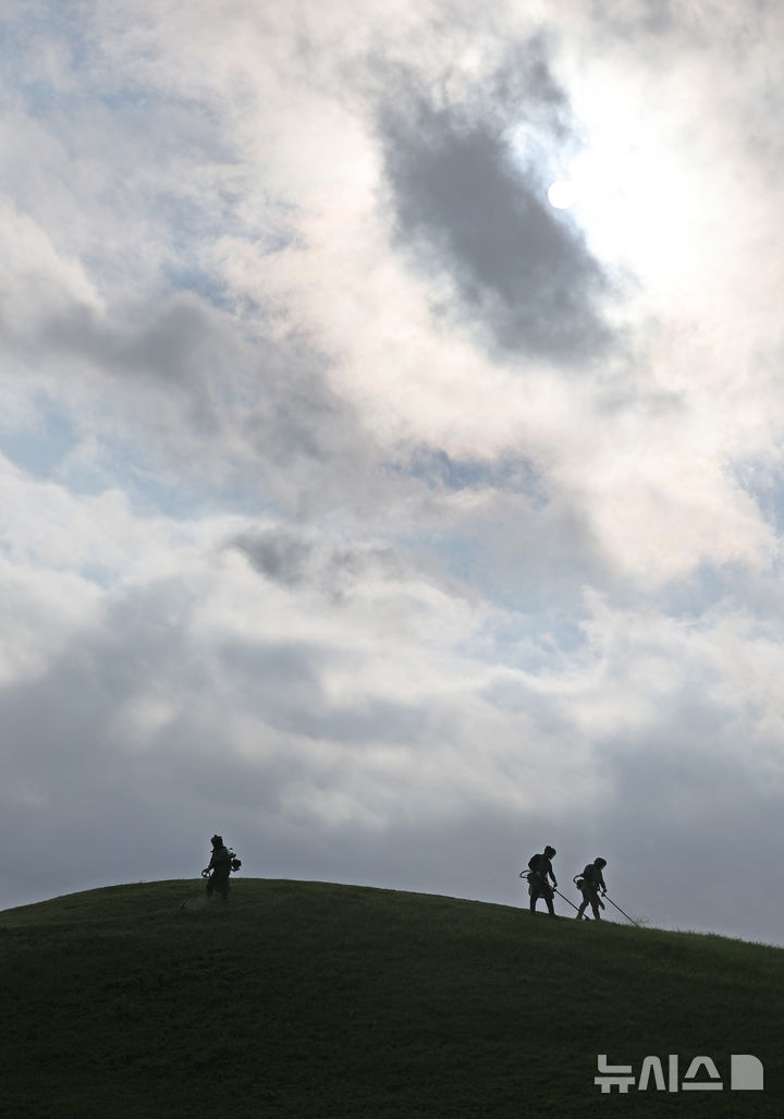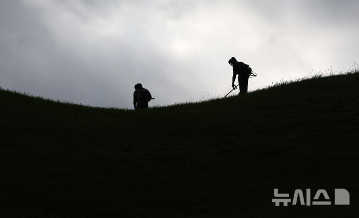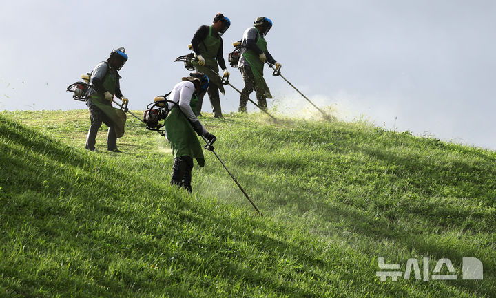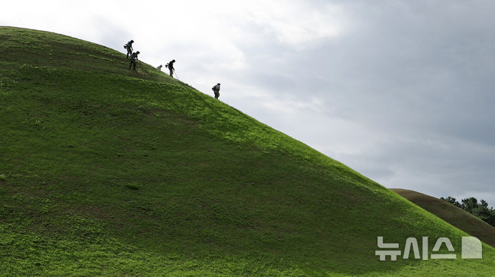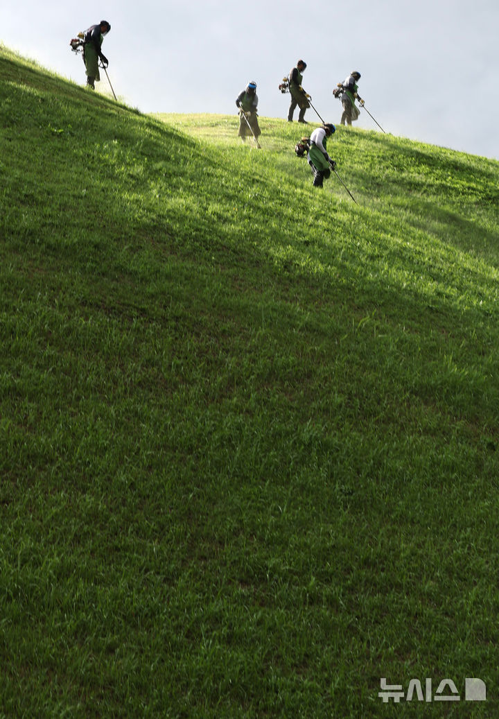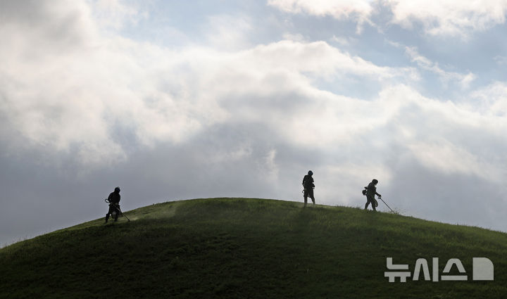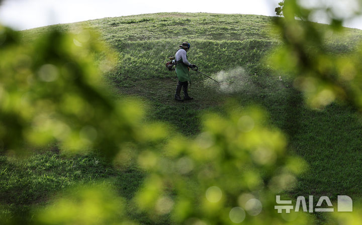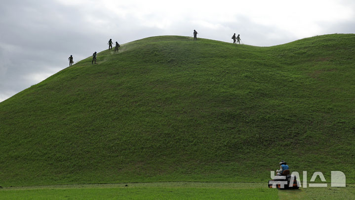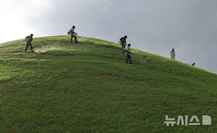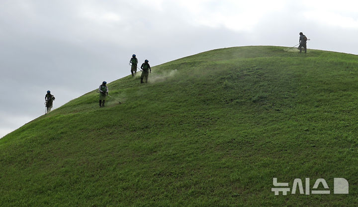 【NEWSIS】秋夕(チュソク=中秋節、今年は9月17日)まであと約2週間となった3日午前、慶尚北道慶州市の史跡管理課関係者たちが大陵苑の皇南大塚で草刈り作業を行った。