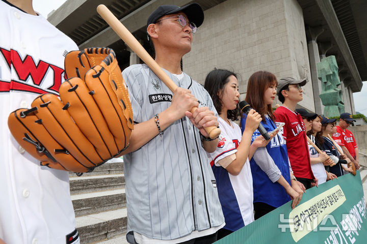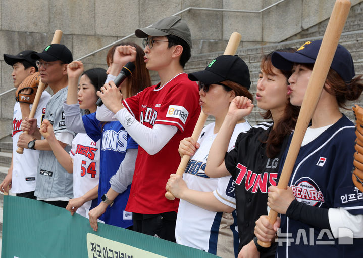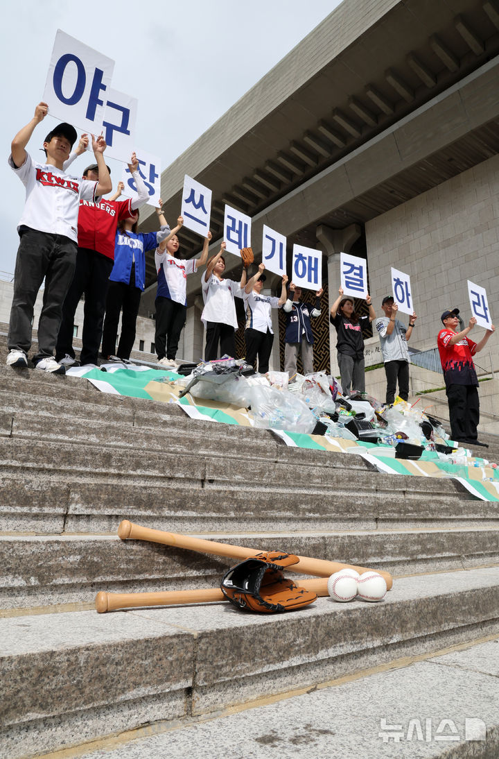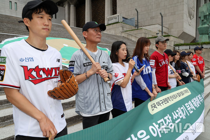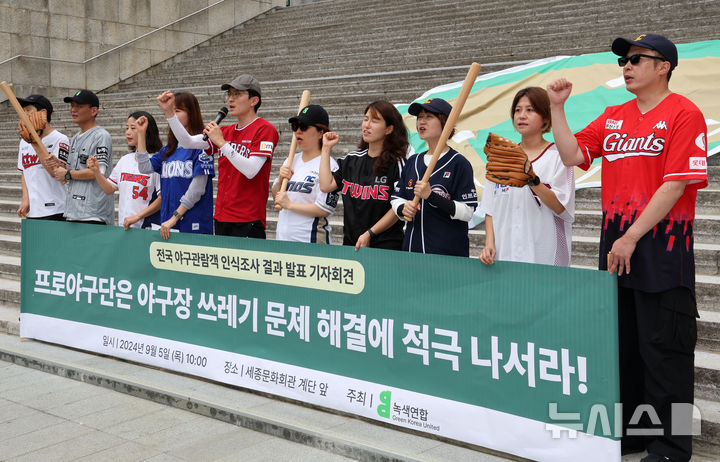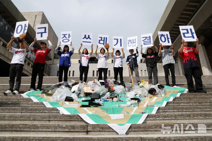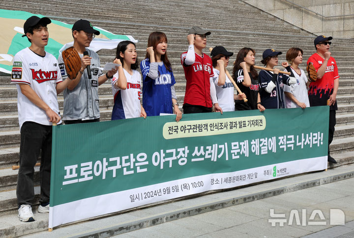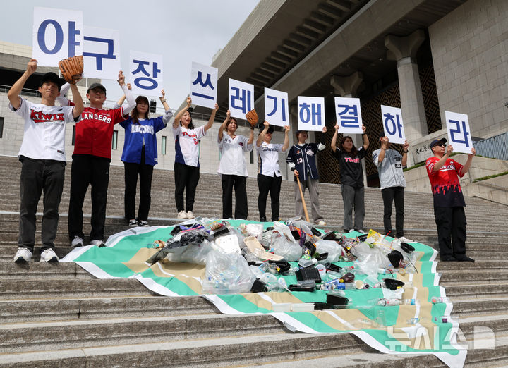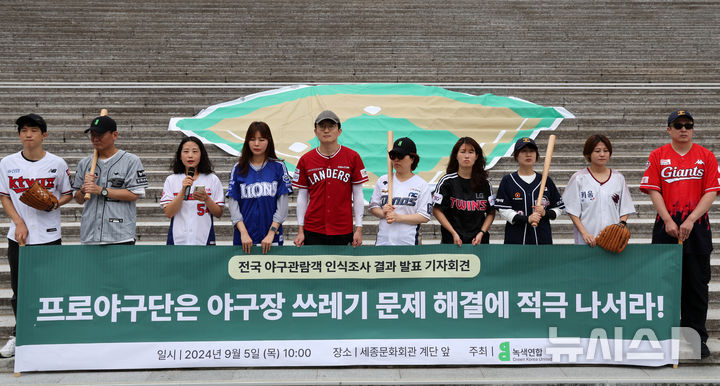 市民団体「緑色連合」のメンバーたちが5日午前、ソウル市鍾路区の世宗文化会館前で全国野球観覧客認識調査の結果発表記者会見を開き、野球場のごみ問題の解決を促すためのパフォーマンスを繰り広げた。