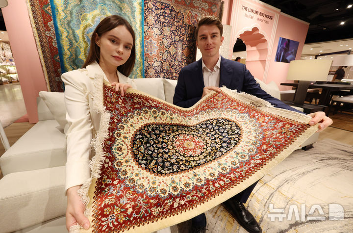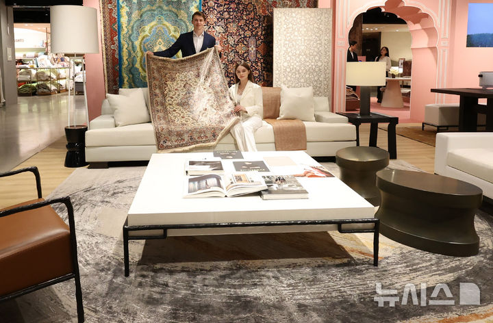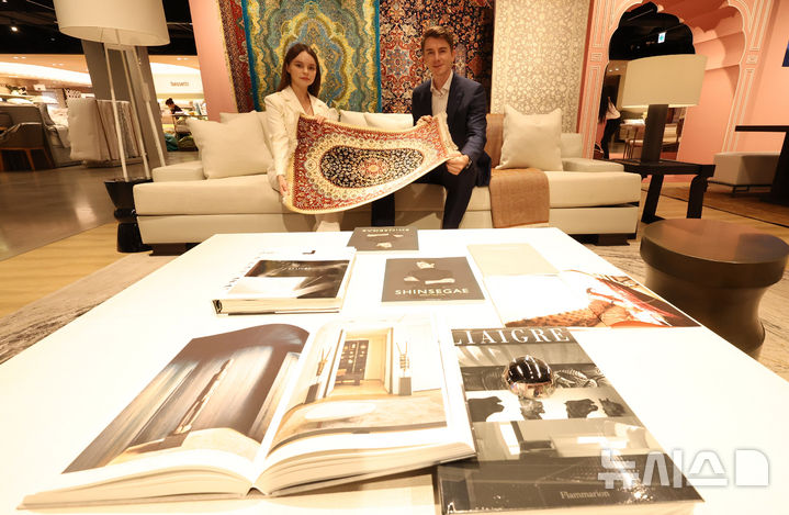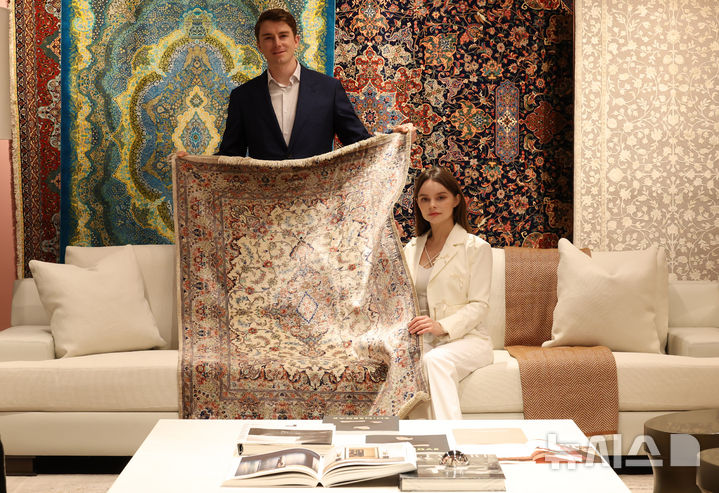 5日午前、ソウル市江南区の新世界デパート江南店にオープンしたインドのハンドメイドカーペットのブランド「ジャイプール・ラグ(Jaipur Lugs)」のポップアップストアで、商品をPRしているコンパニオンの様子。