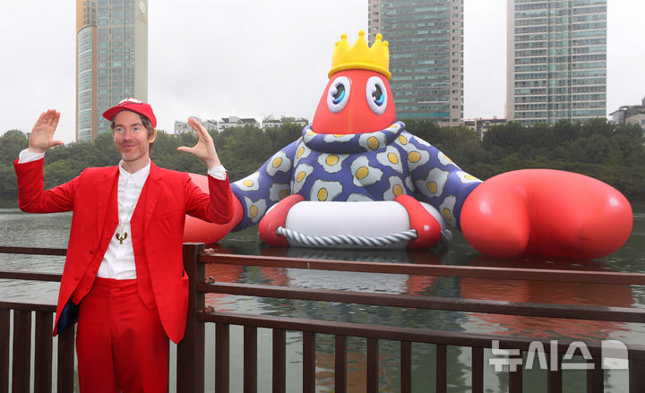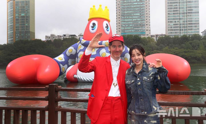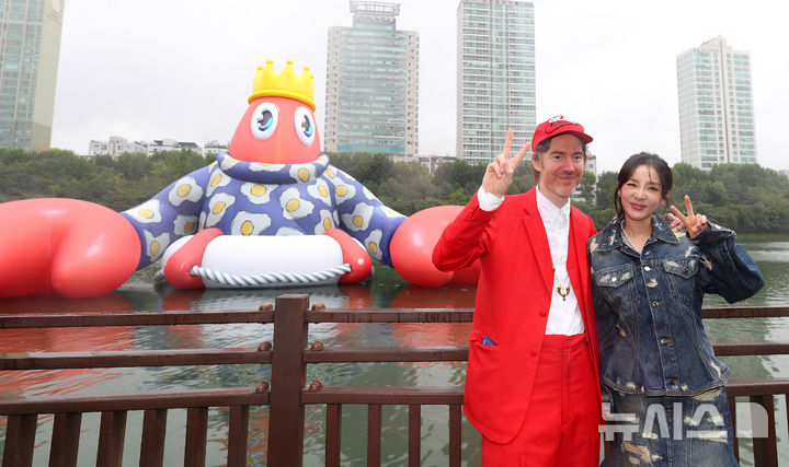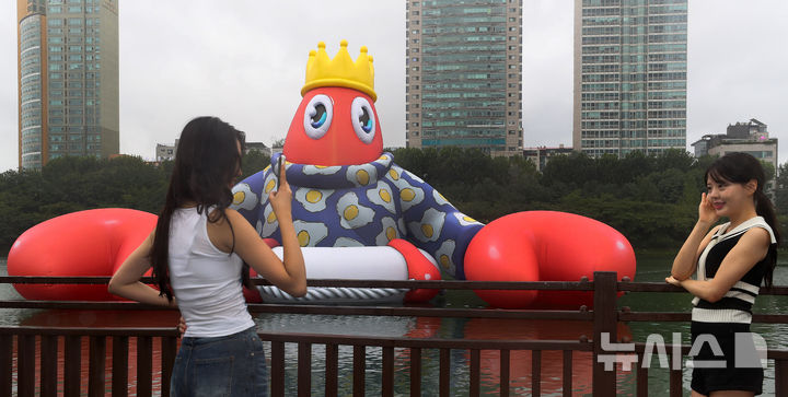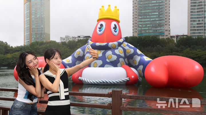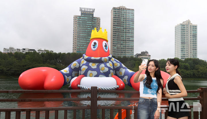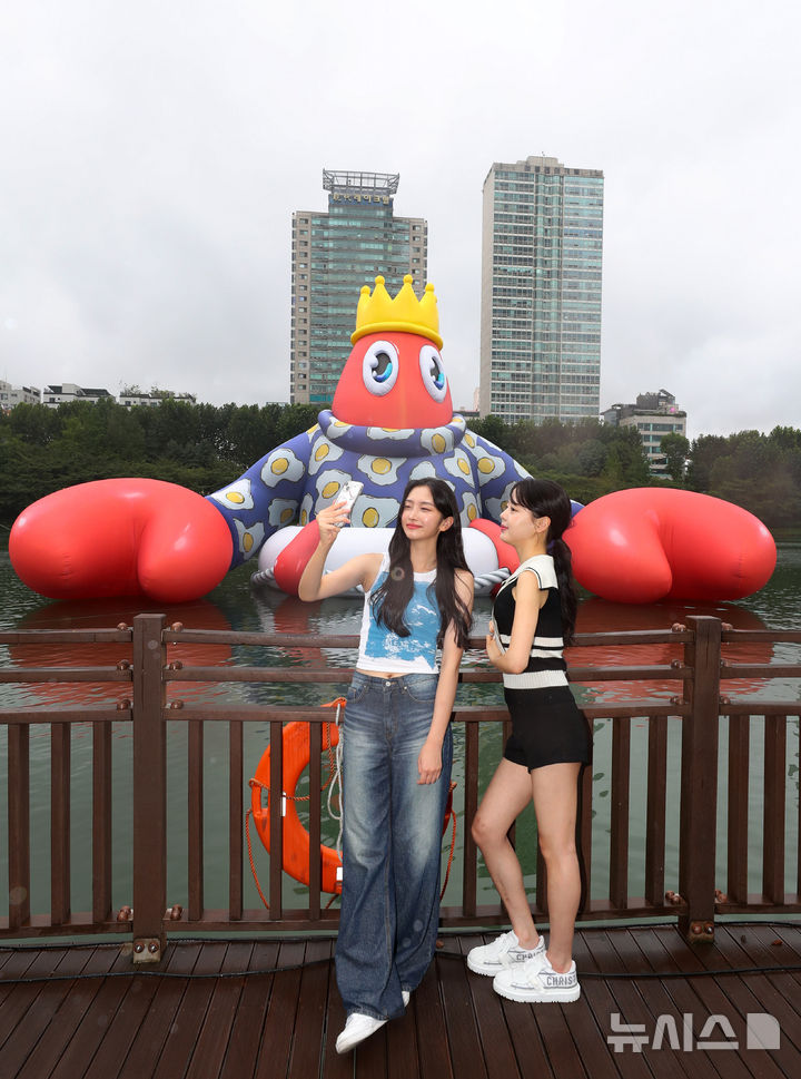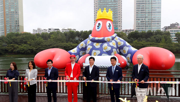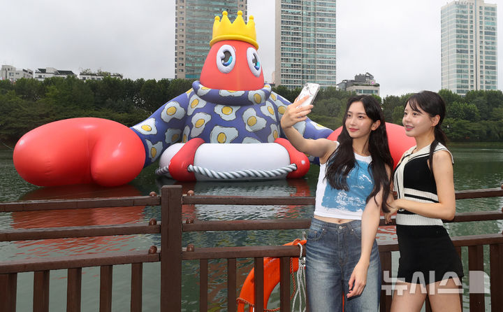 ソウル市松坡区の石村湖で6日、ロッテワールドモール・オープン10周年パブリックアート・プロジェクト「ロブスター・ワンダーランド」オープニング・セレモニーが行われ、記念撮影をする人たち。