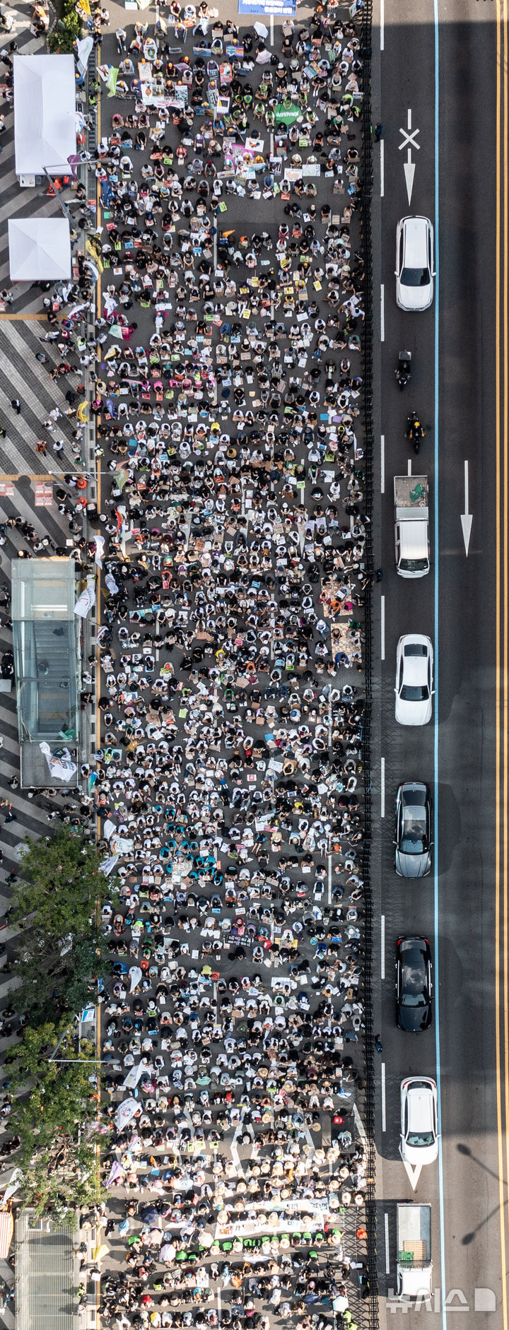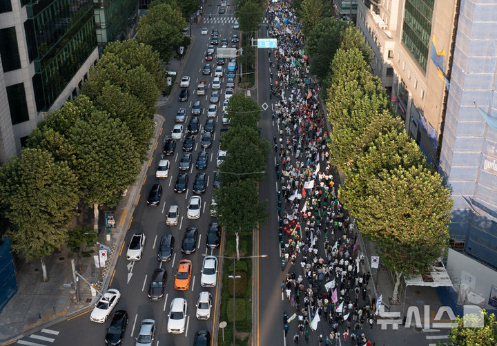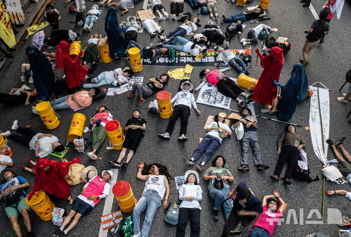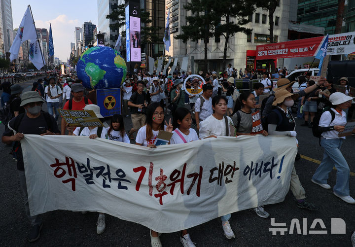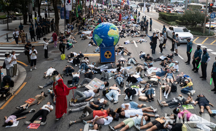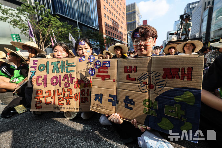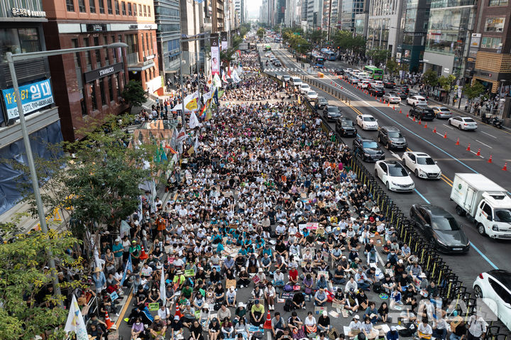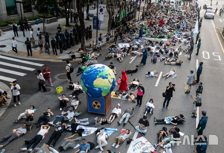 国連が指定した「青空のためのきれいな空気の国際デー」に当たる7日、ソウル市江南区のソウル地下鉄2号線江南駅近くで、907気候正義行進の参加者らが集会を開いている様子。