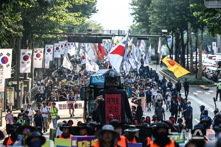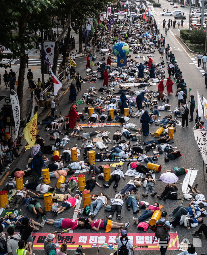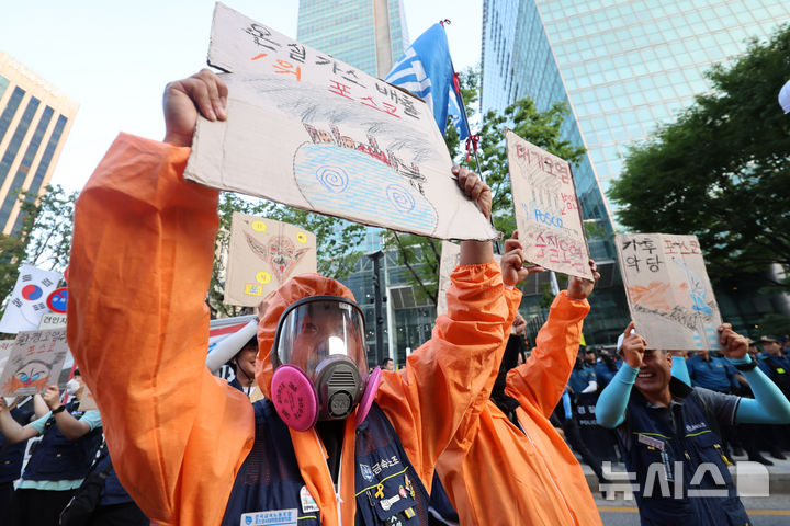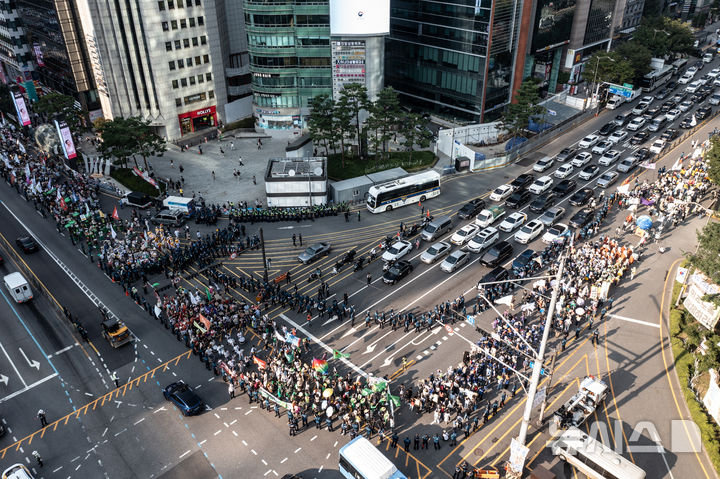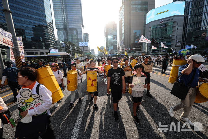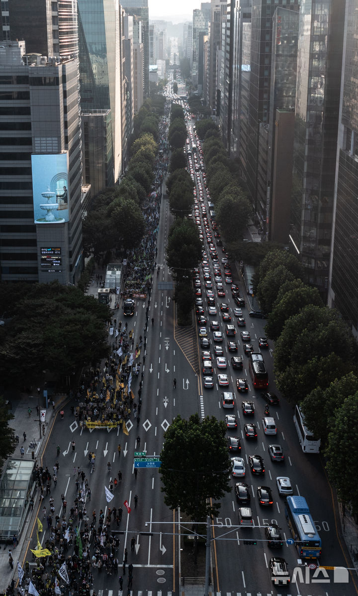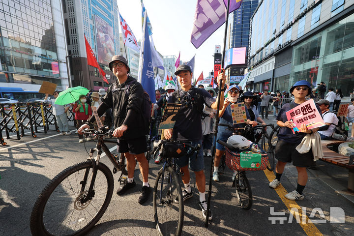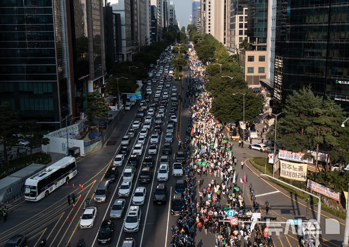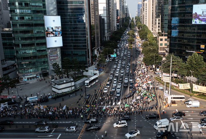 国連が指定した「青空のためのきれいな空気の国際デー」に当たる7日、ソウル市江南区のソウル地下鉄2号線江南駅近くで、907気候正義行進の参加者らが集会を開いている様子。