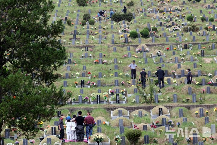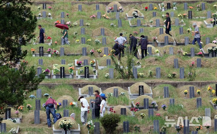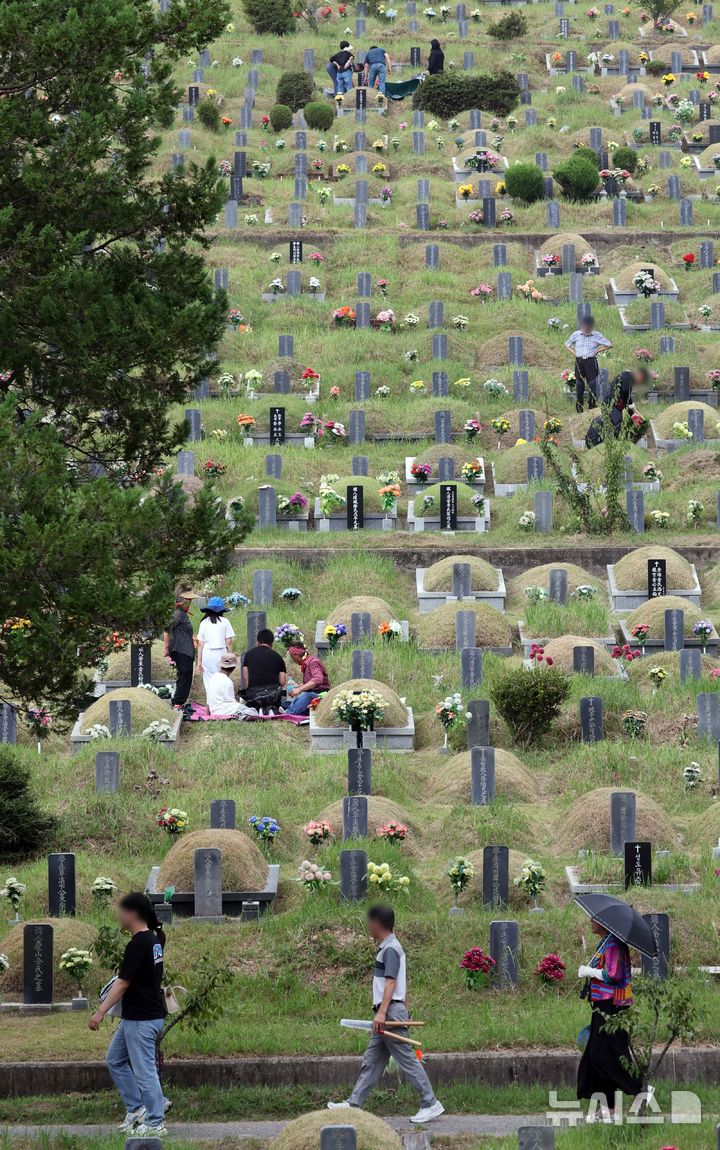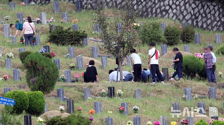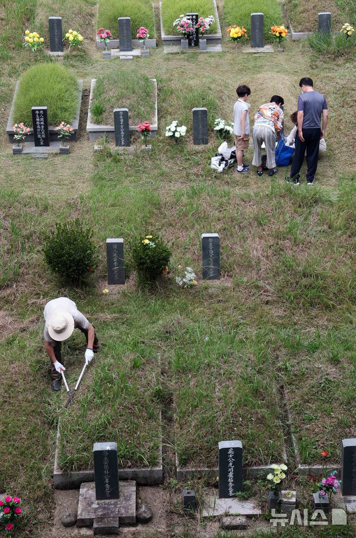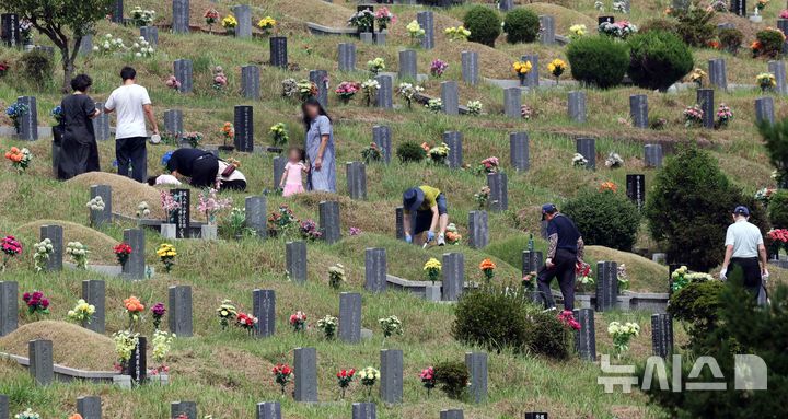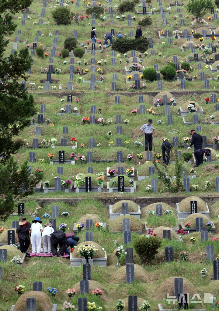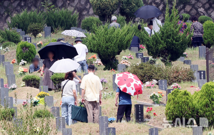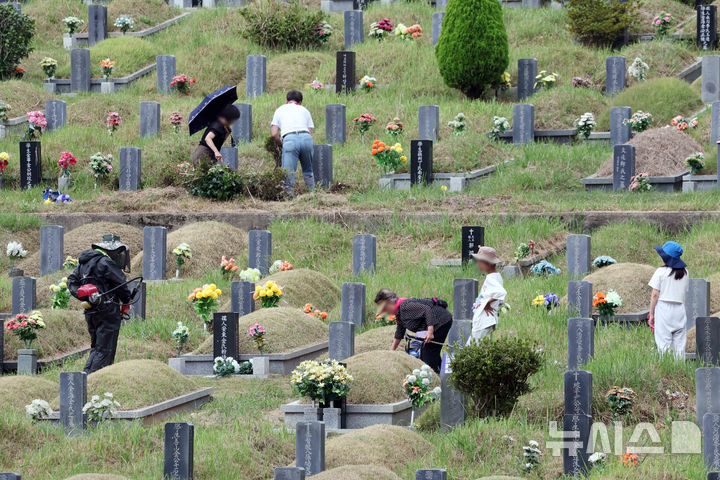 【NEWSIS】秋夕(チュソク=中秋節、今年は9月17日)連休まであと約1週間になった8日、釜山市金井区の公園墓地「永楽公園」を訪れた家族連れ。周辺の草刈りや先祖の墓参りをした。