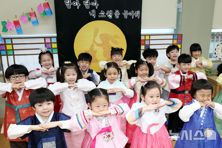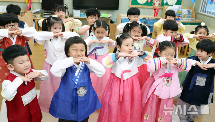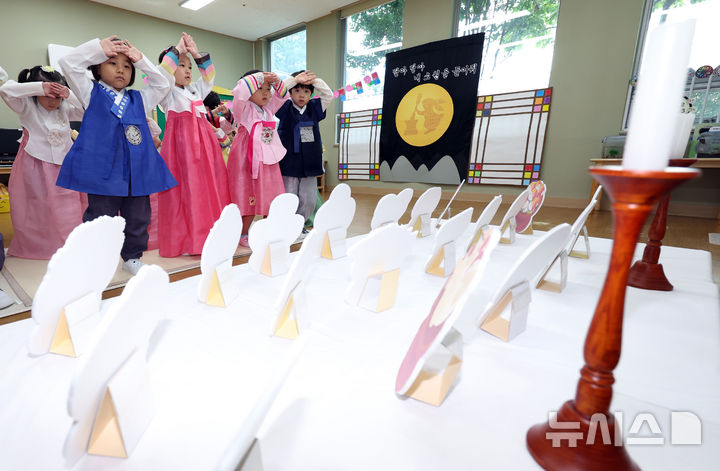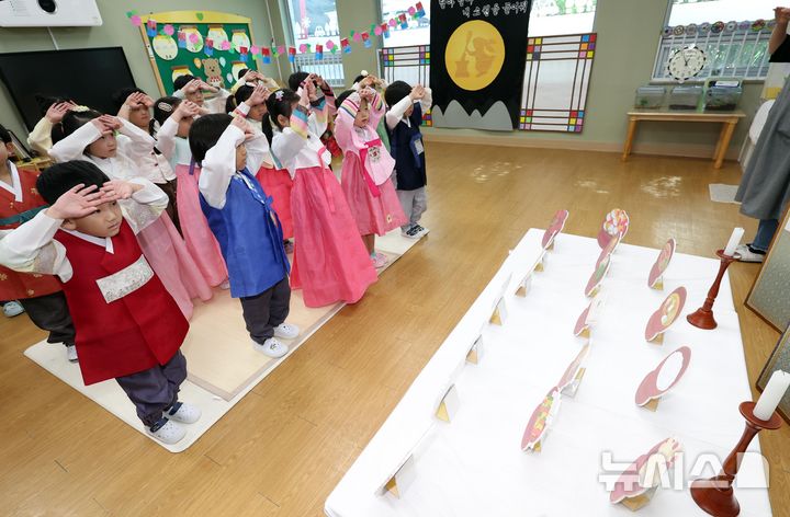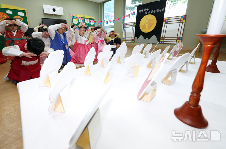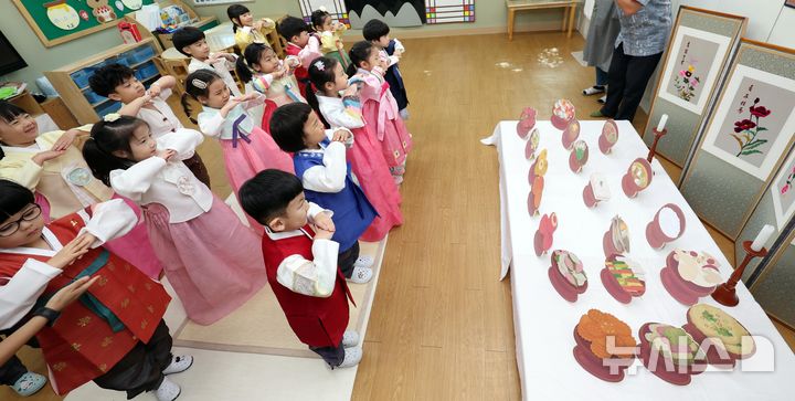 【NEWSIS】秋夕(中秋節。今年は9月17日)が迫った10日、釜山市釜山鎮区庁のオリニチプ(民間保育施設)では、園児たちが韓服(韓国の伝統衣装)をきれいに身に着け、茶礼(先祖供養の儀式)でクンジョル(伝統のお辞儀)をするやり方を学んでいた。