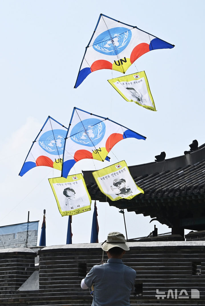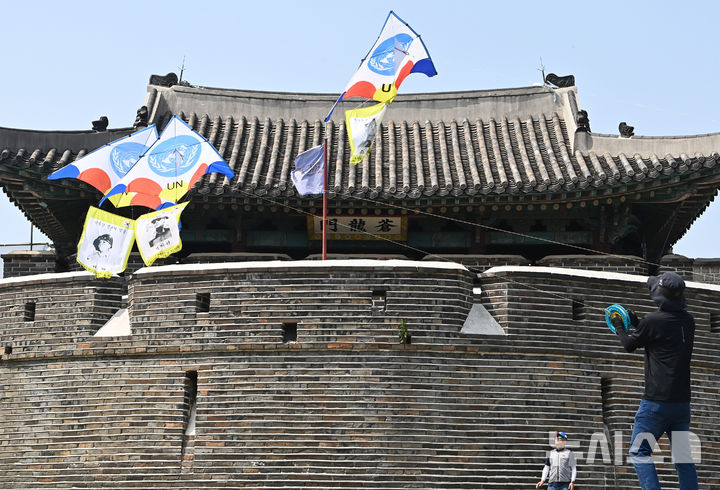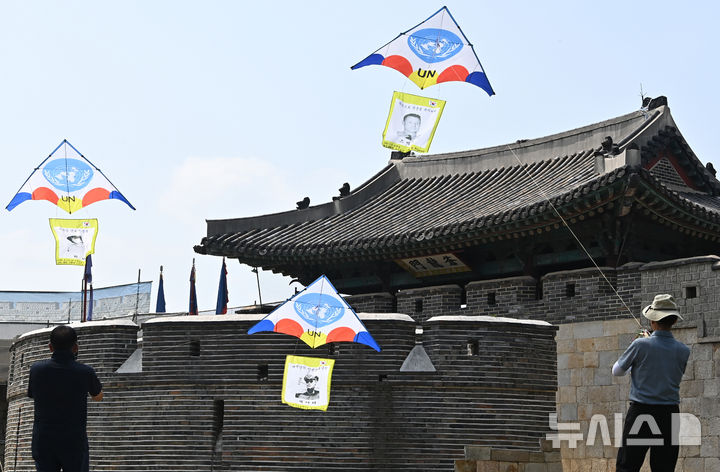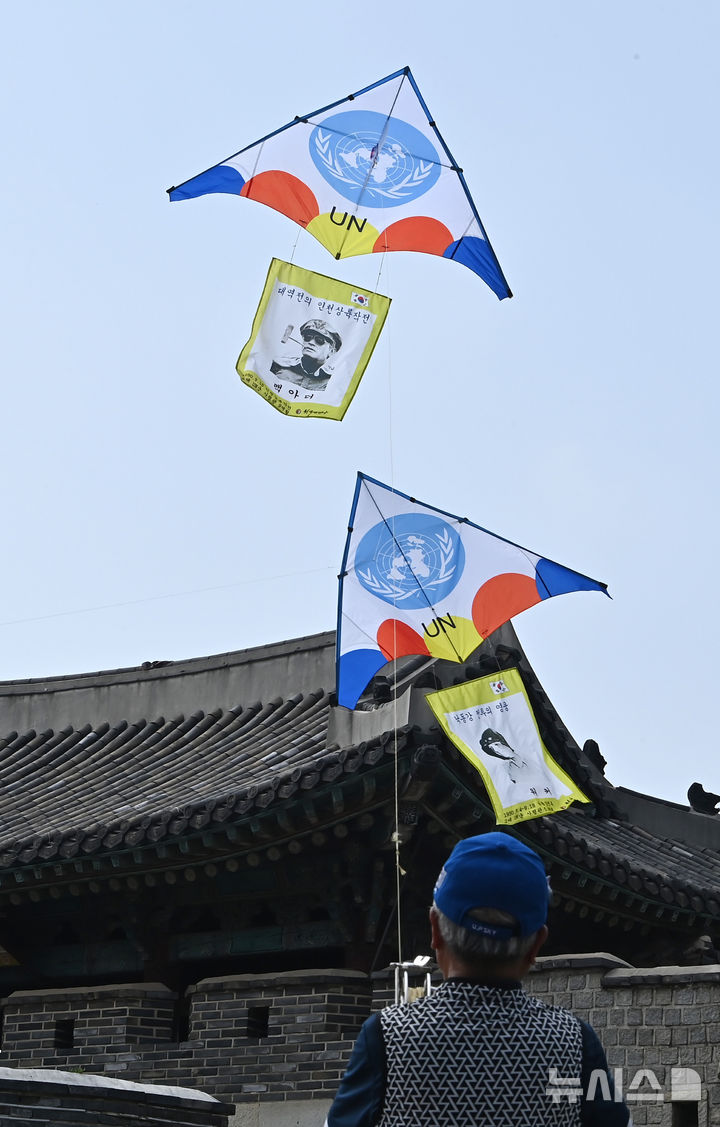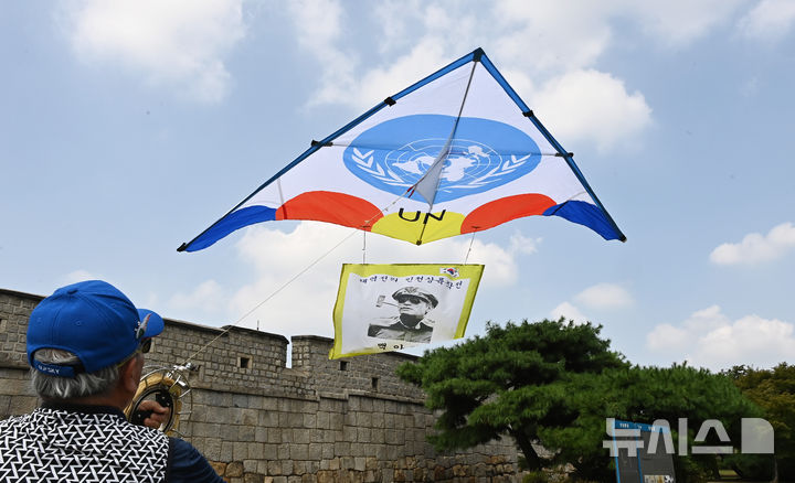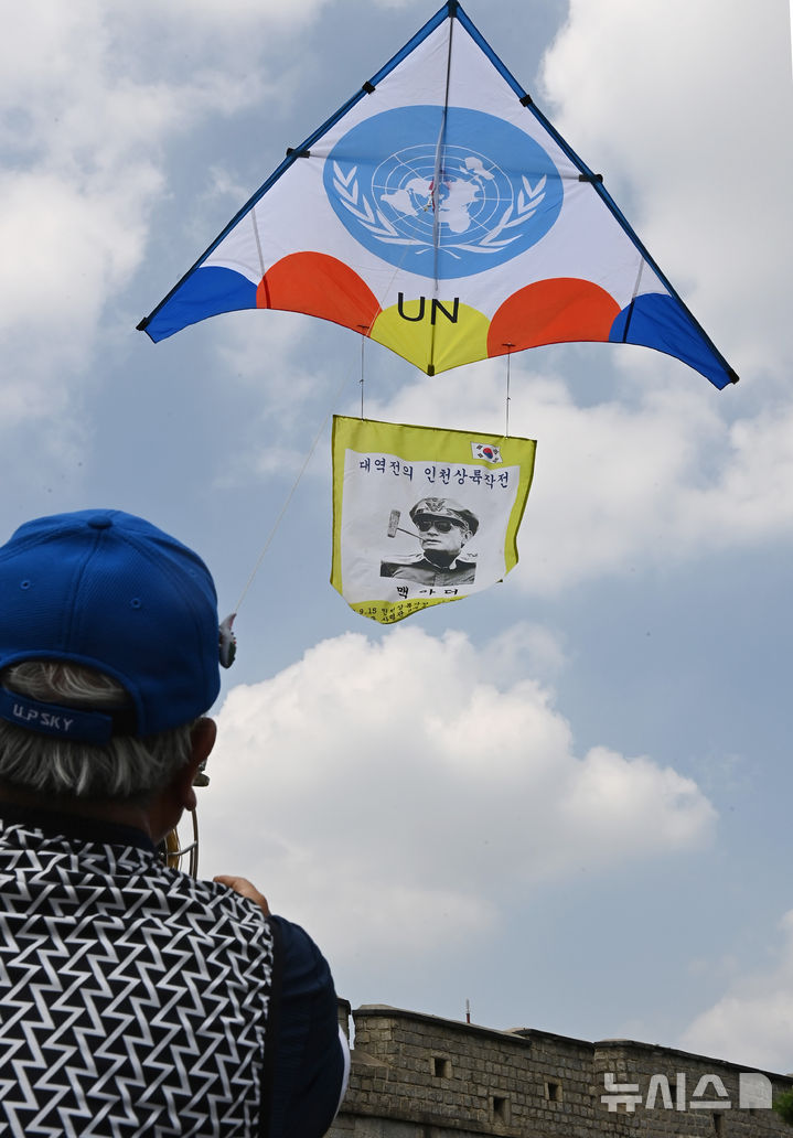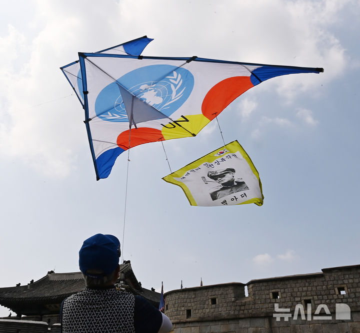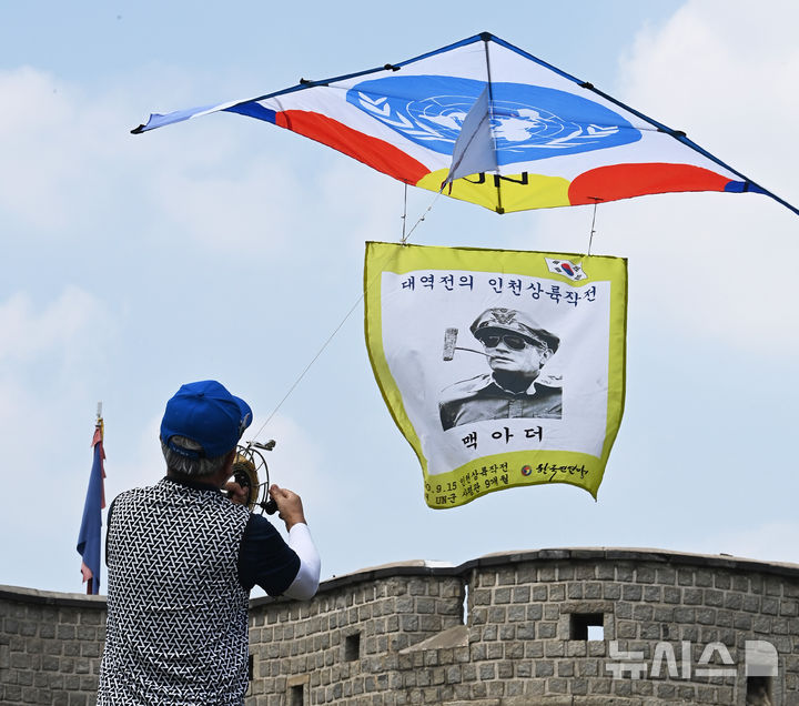 京畿道水原市八達区の水原華城青龍門で10日、韓国凧連盟のメンバーが、仁川上陸作戦74周年を記念する凧揚げを行った。