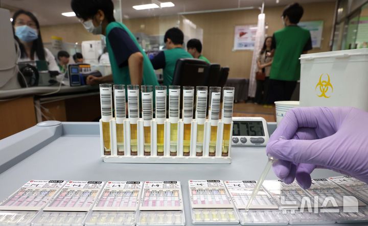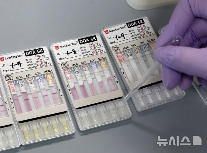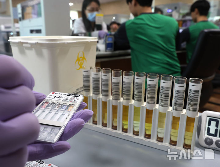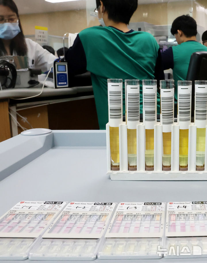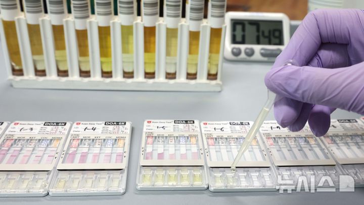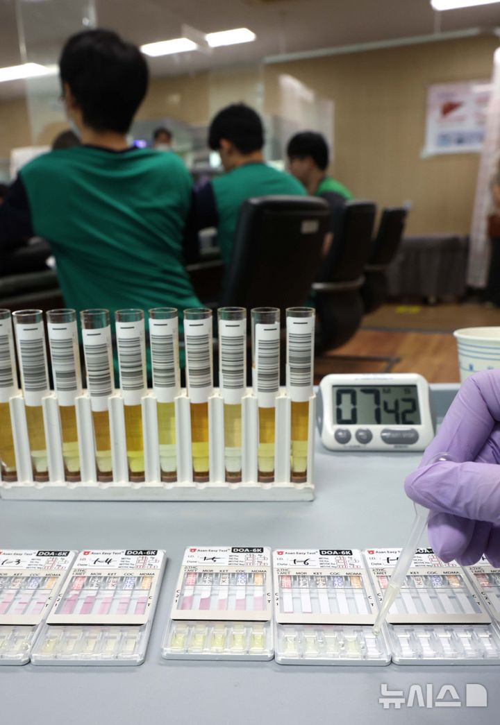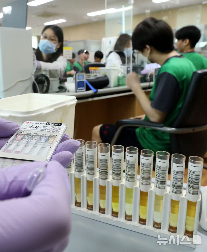 最近、麻薬や大麻、向精神薬などを利用した犯罪やその誤用・乱用が深刻な社会問題になっている中、仁川市弥鄒忽区の仁川兵務支庁診断検査医学室で10日、臨床検査技師が入営対象者たちの尿を検体として、簡易検査キットを活用して薬物検査を行う様子。