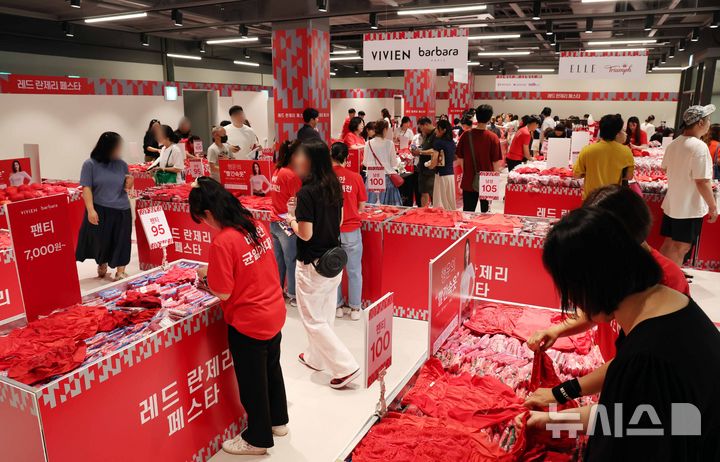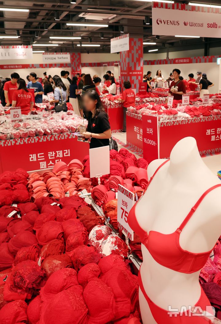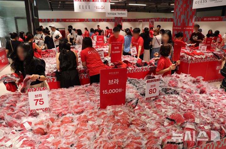 【NEWSIS】12日、大規模な拡張と改装を終えて新たにオープンした新世界サイモン釜山プレミアムアウトレット(釜山市機張郡)で、赤い下着を購入する人々の様子。