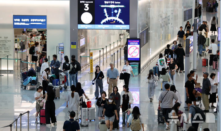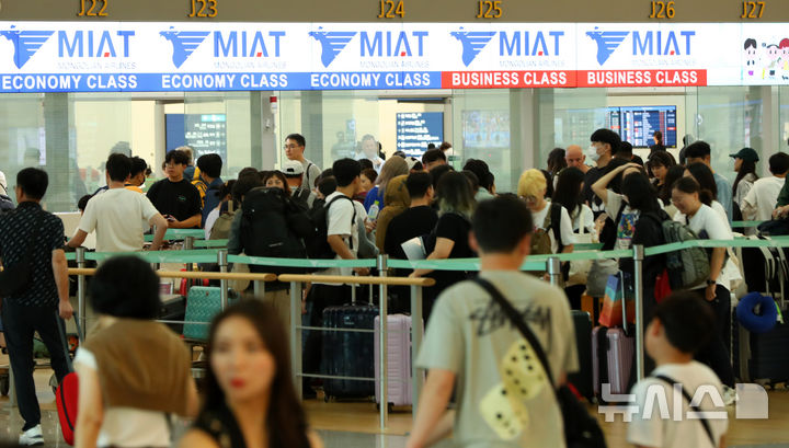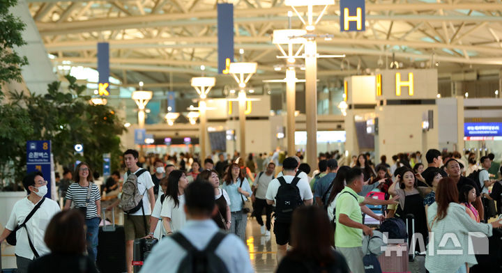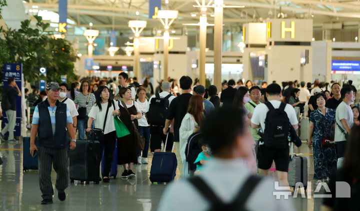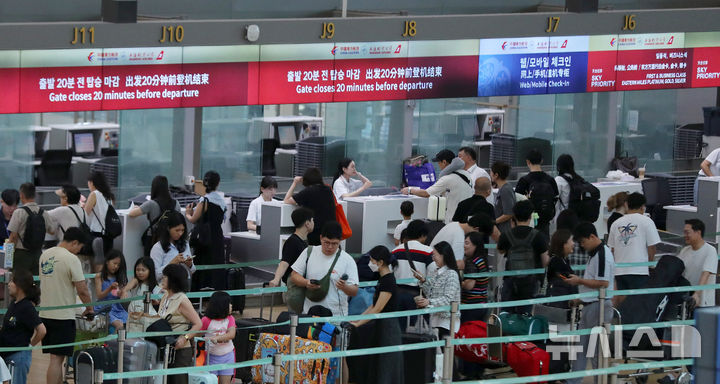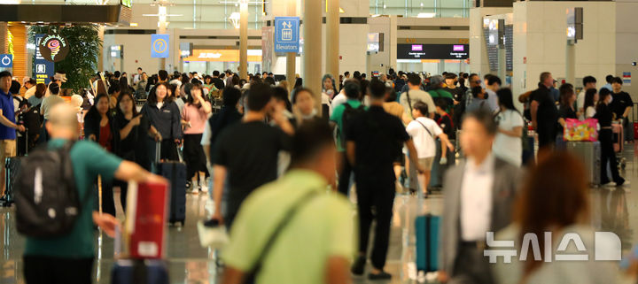 【NEWSIS】秋夕(中秋節。今年は9月17日)の連休があすに迫った13日、仁川国際空港第1旅客ターミナルは利用客で混雑していた。仁川空港公社の予測によると、秋夕の連休期間(9月13日-18日)には120万4000人が韓国と海外を行き来する見込み。この期間の一日平均利用客数は20万1000人だ。