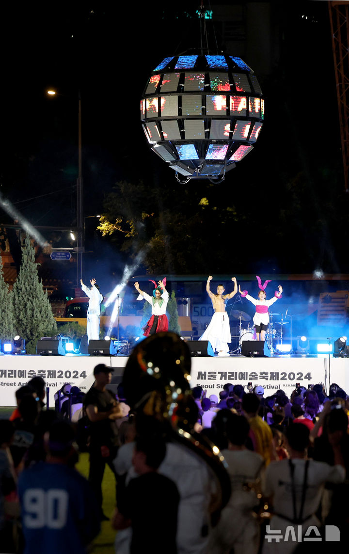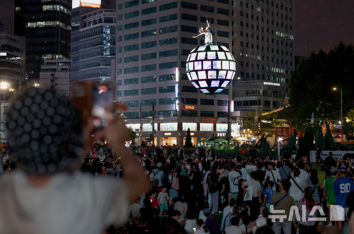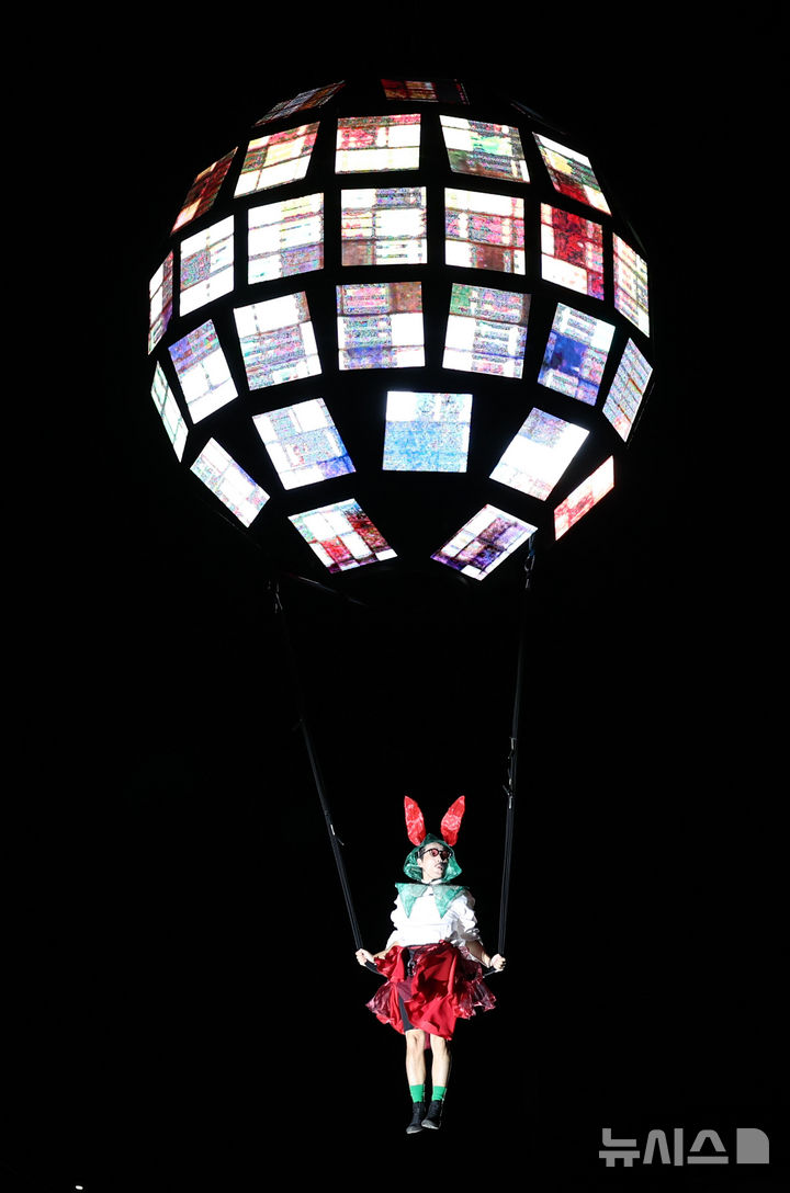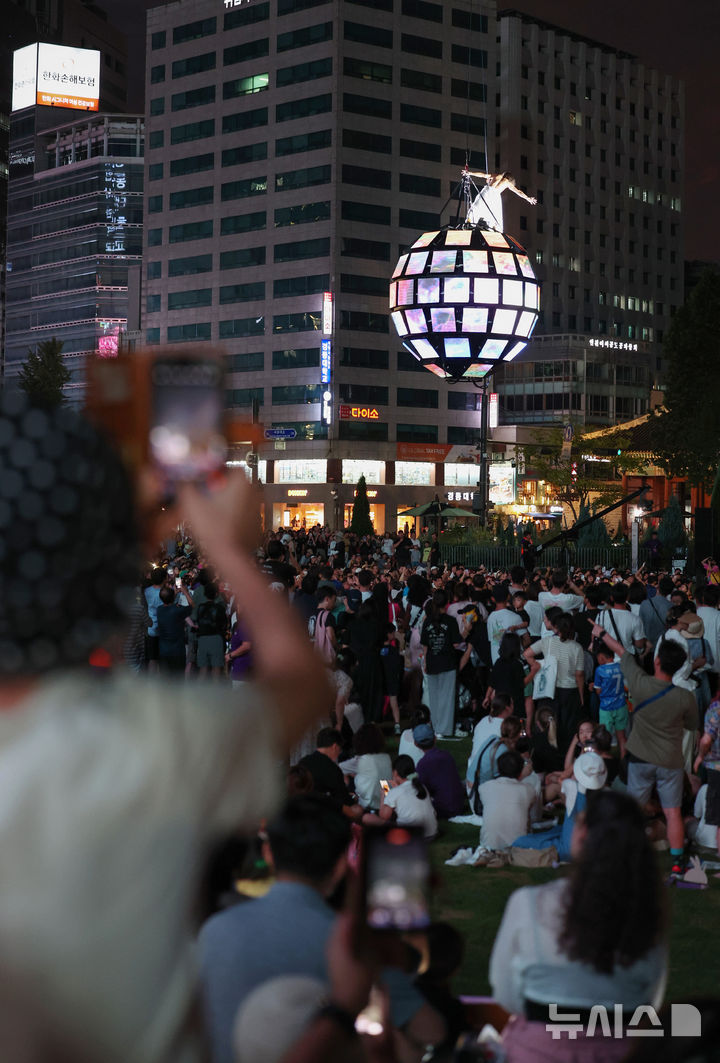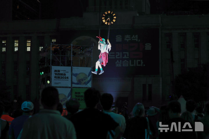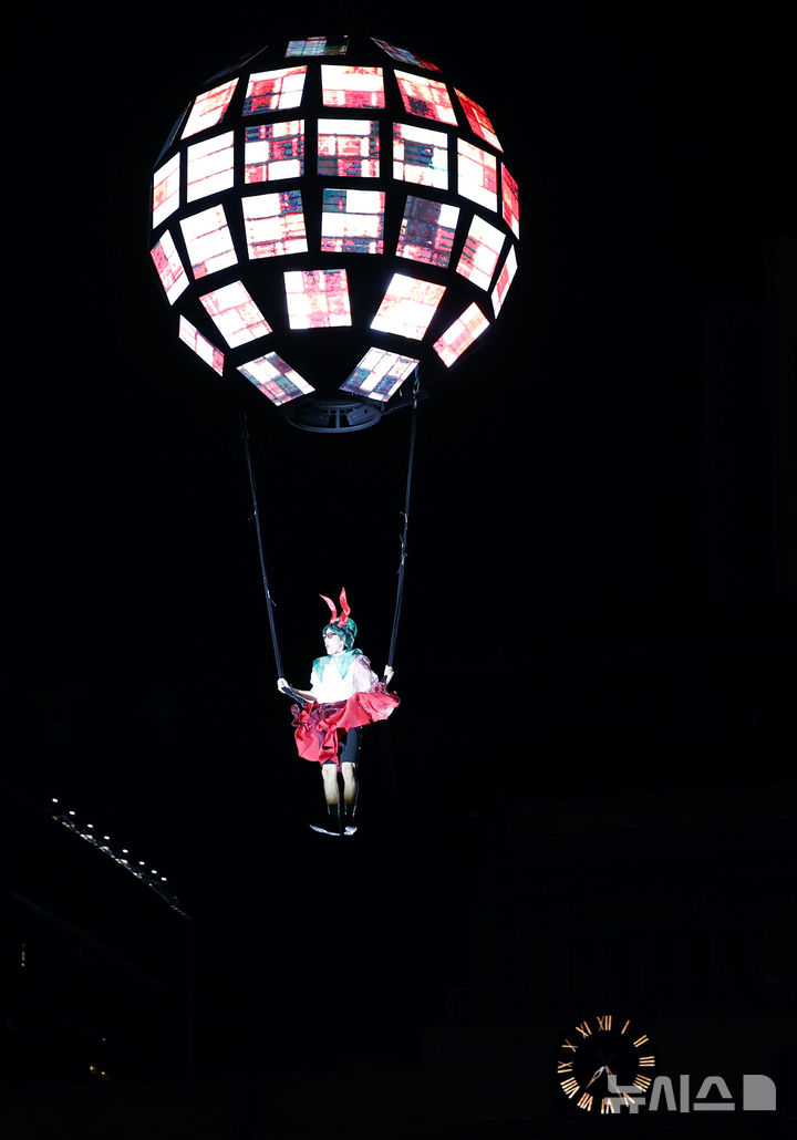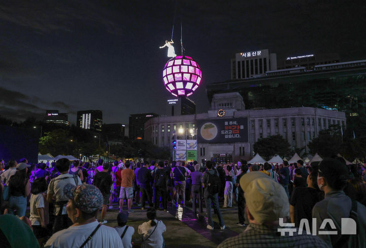 秋夕(中秋節。今年は9月17日)があすに迫った16日、ソウル広場の空で、芸術団体「プロジェクト・ナルダ」が「ソウルの月」大型メディア空中パフォーマンスを披露している様子。