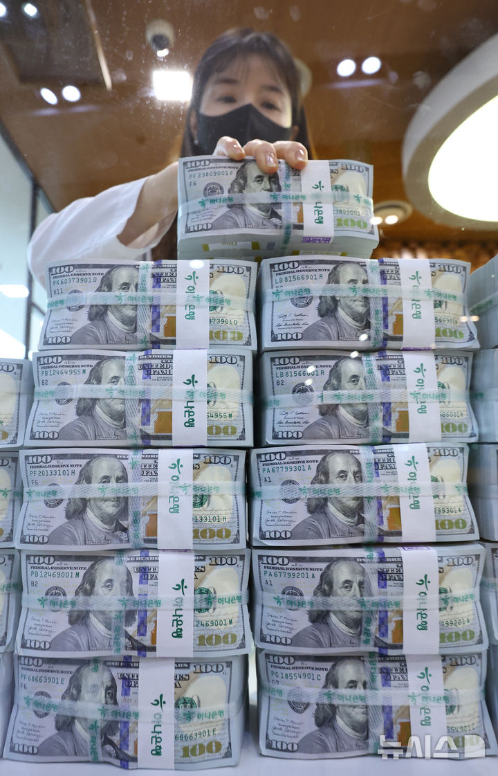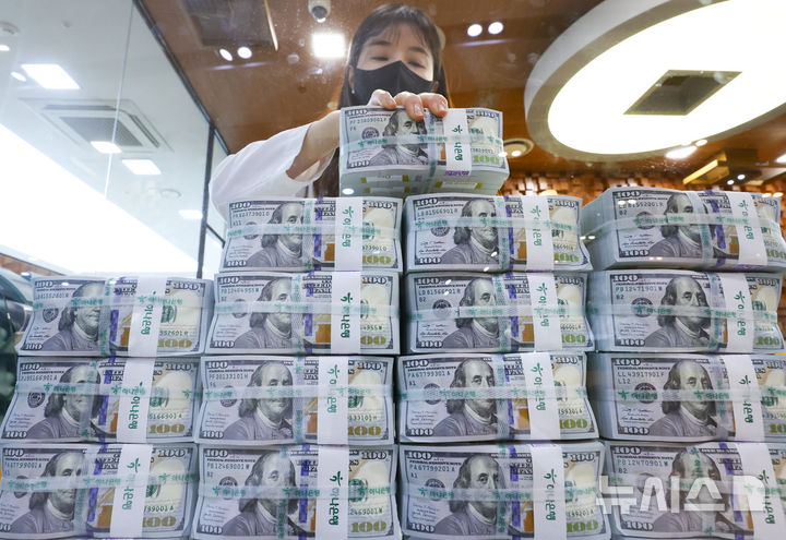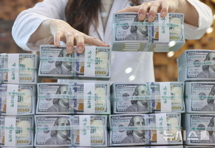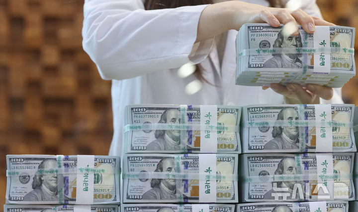 ソウル市中区のハナ銀行偽変造対応センターで7日、行員がドル紙幣を整理している様子。