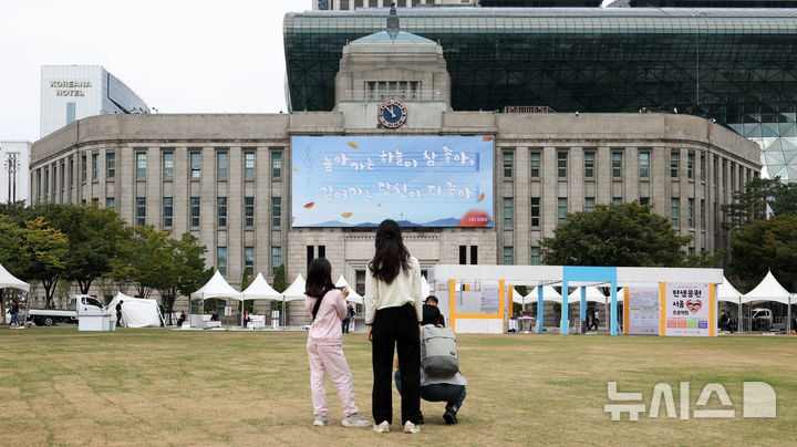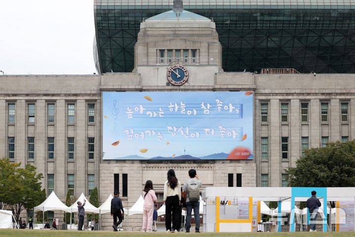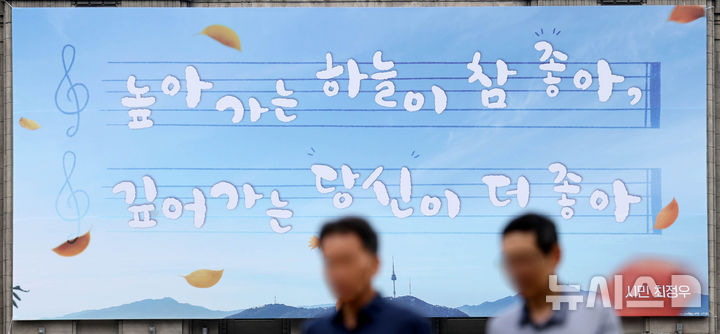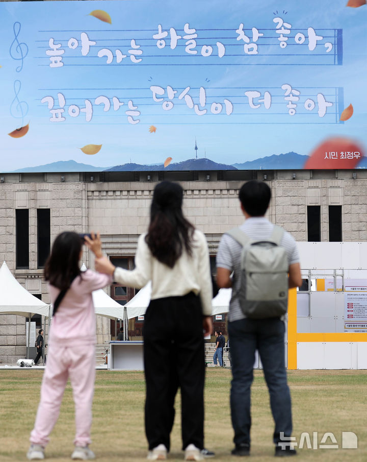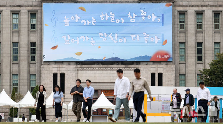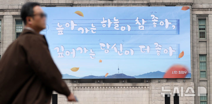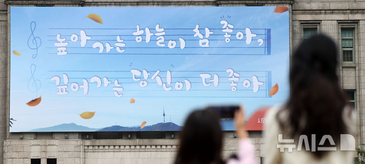 ソウル図書館(ソウル市中区)外壁の「夢を刻むパネルが7日、秋に合わせて「高まる空がほんとに好き、深まるあなたがもっと好き」というメッセージのものに模様替えした。