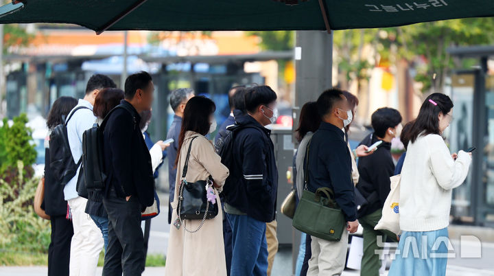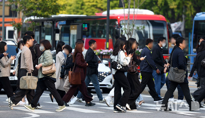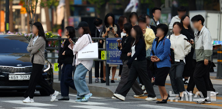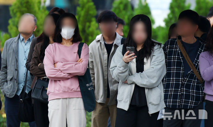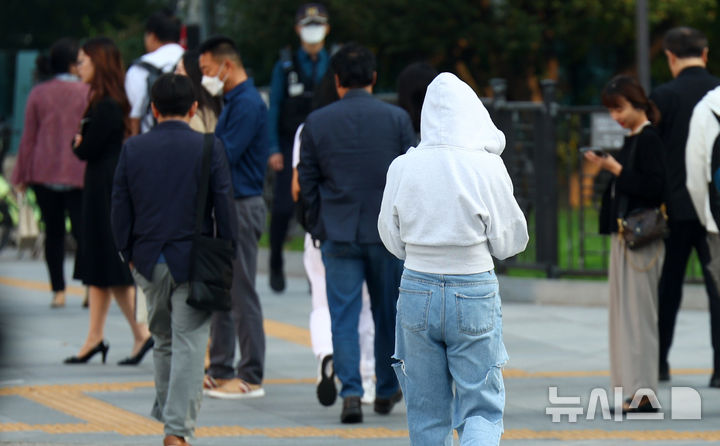 【NEWSIS】冷たい露が降り始めるという二十四節気の一つ「寒露」の8日、ソウル市鍾路区の世宗大路交差点で、ブルゾンやジャケットなどの羽織りものを着て横断歩道を渡る人々。