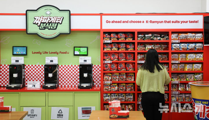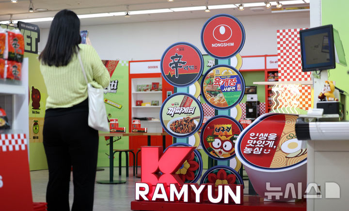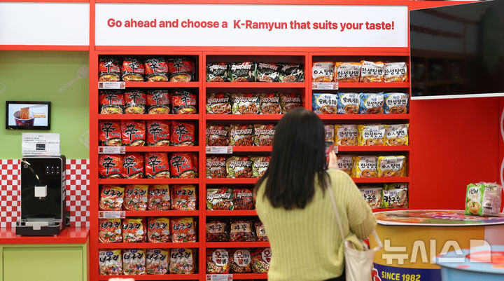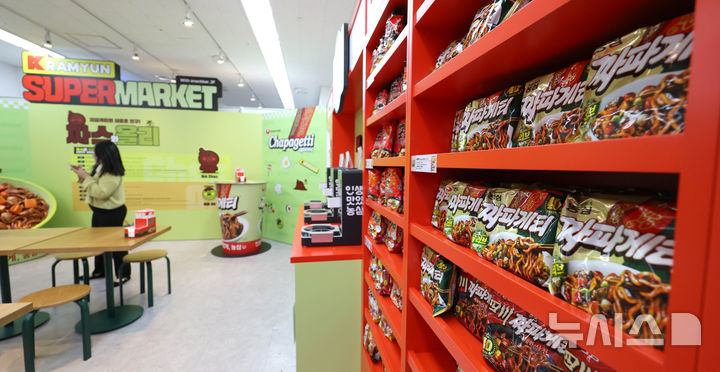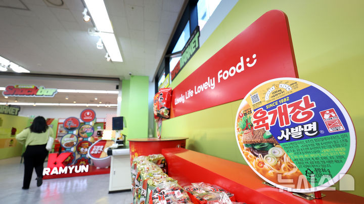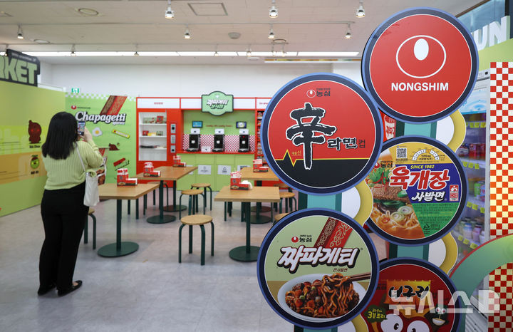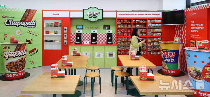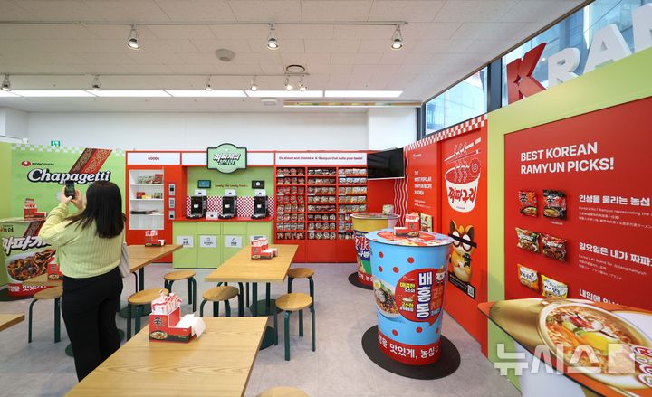 【NEWSIS】農心が「ノグリのラーメン店」に続いて2店目のラーメン体験売場を披露した。外国人観光客が大勢訪れる明洞コリアマートと協業して同マートの2階に、スーパーマーケットとスナックバーが結合した店舗形態の「Kラーメン・スーパーマーケット」を開設し、ラーメンの購入および即席調理器の使用、喫食が同じ空間で可能だ。