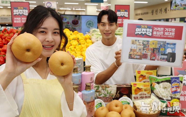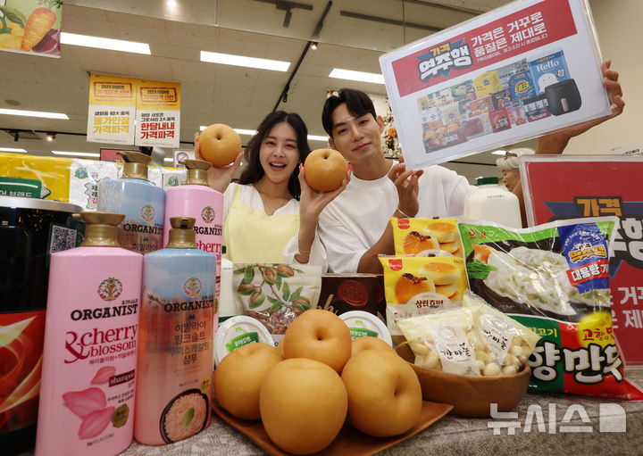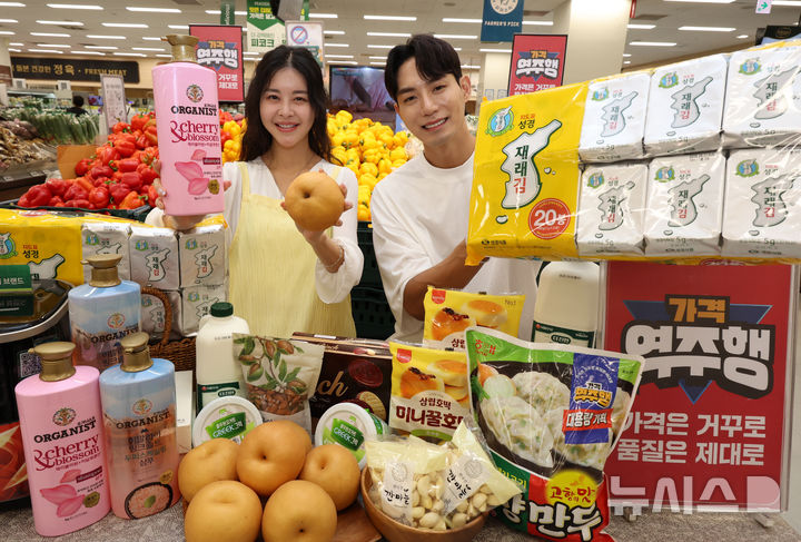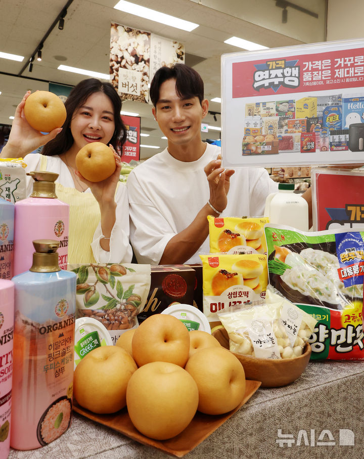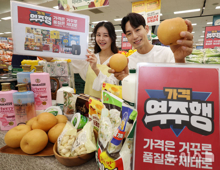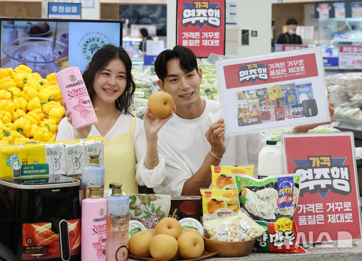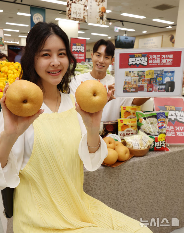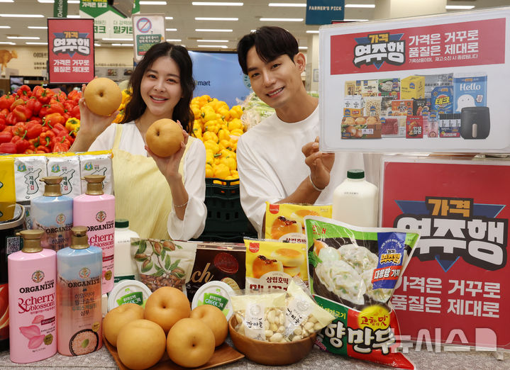 【NEWSIS】9日午前、ソウル市城東区の大手スーパー「Eマート往十里店」で2024年第4四半期「価格逆走行」イベントをPRするコンパニオンの様子。