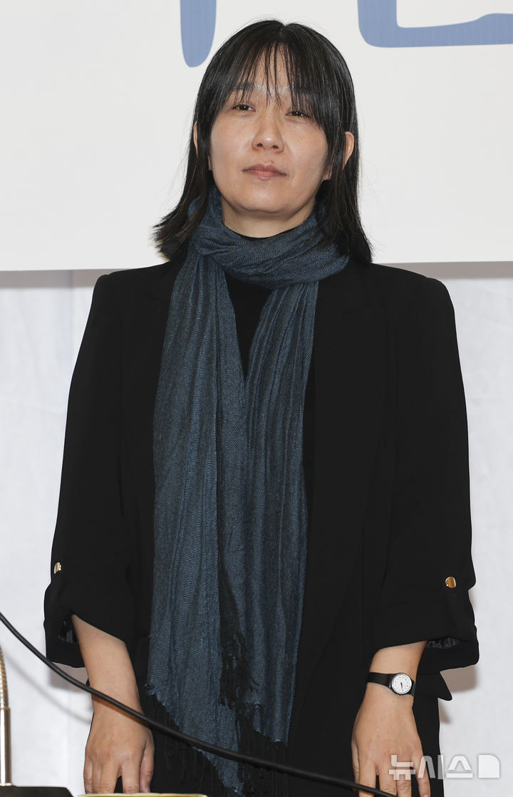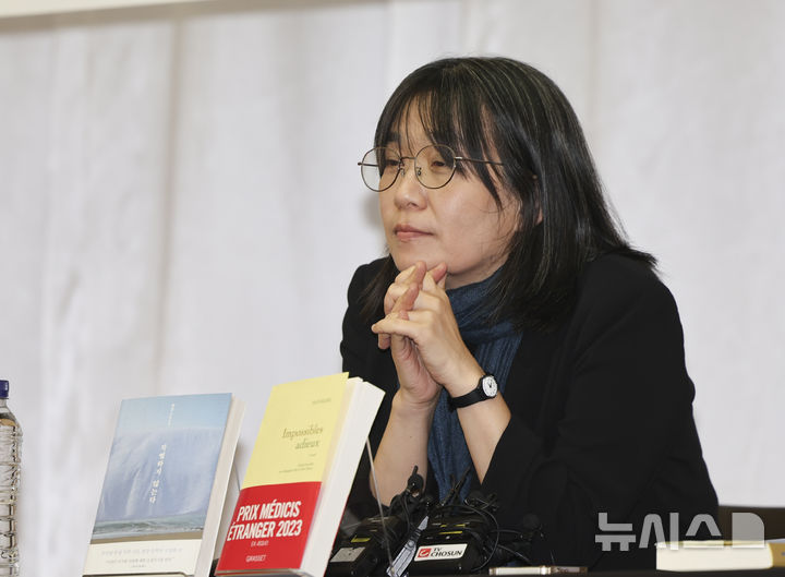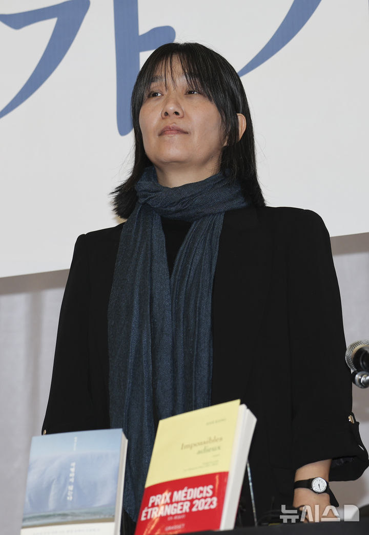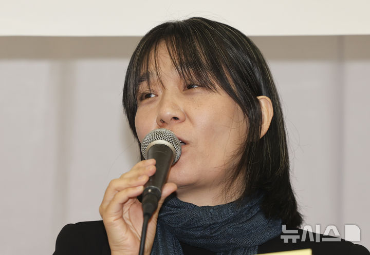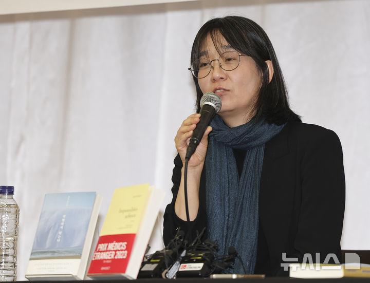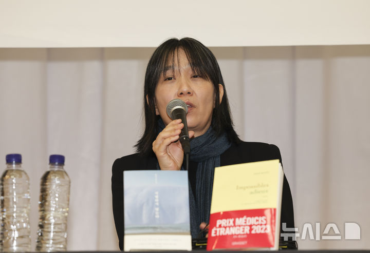 写真は昨年11月、ソウル市陽川区の韓国放送会館で、小説『別れを告げない』によりフランスのメディシス賞外国小説部門を受賞した感想を述べる韓江氏。