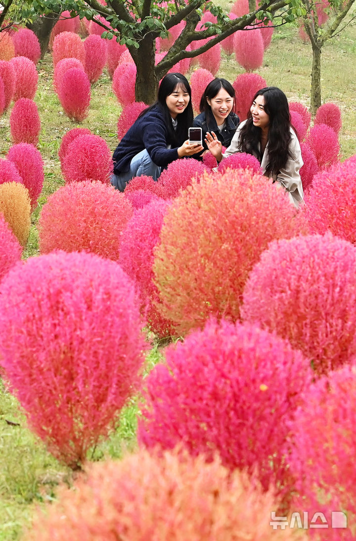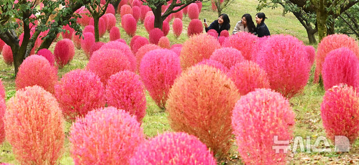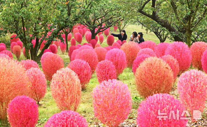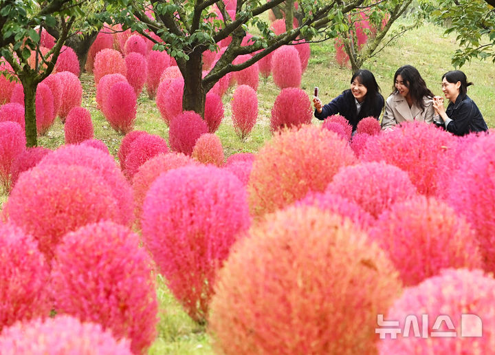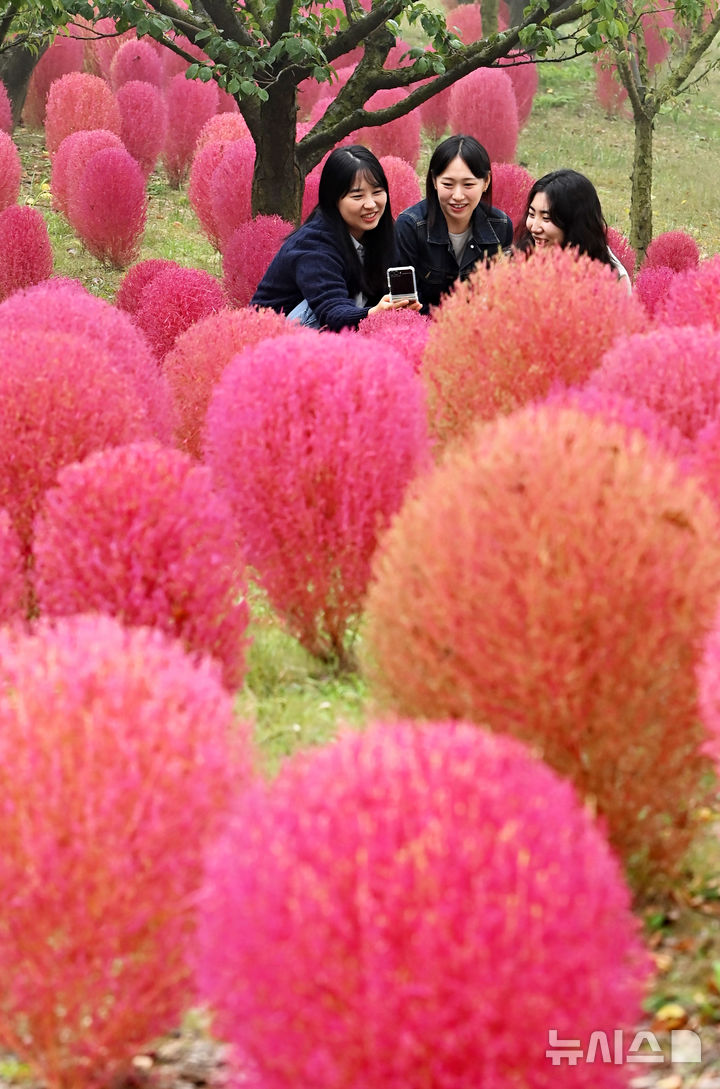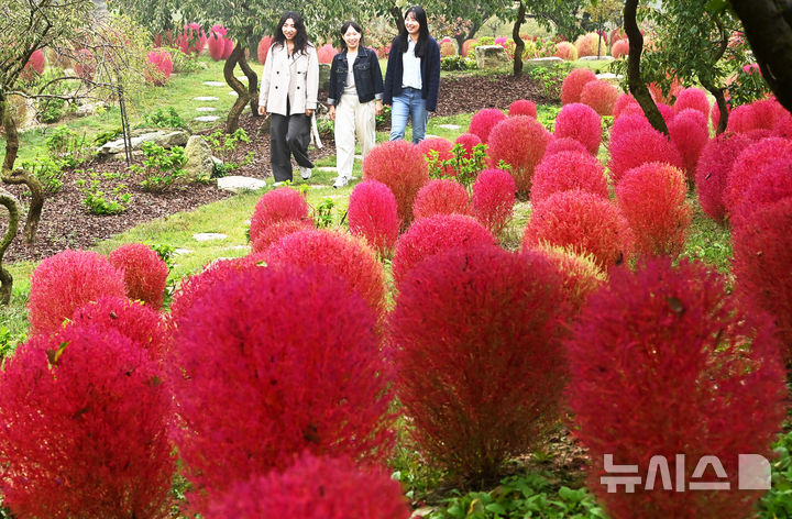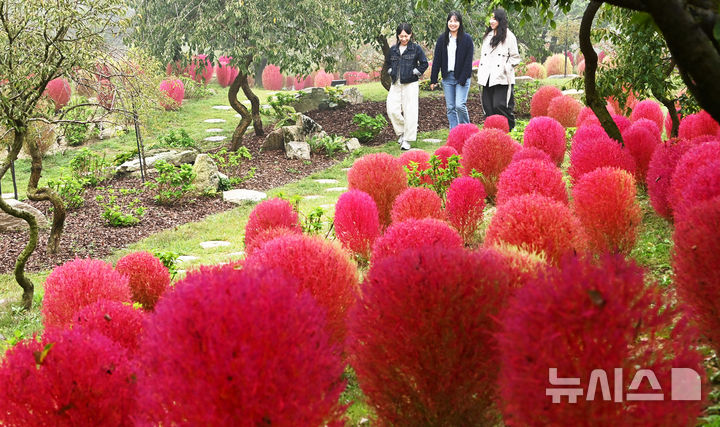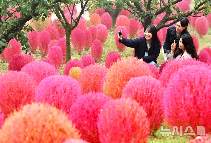 穏やかな秋の天気となった11日、エバーランド(京畿道竜仁市)にある「空の庭園の道」では、訪れた人々が赤く染まったホウキグサを背景に思い出作りをしていた。