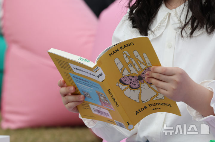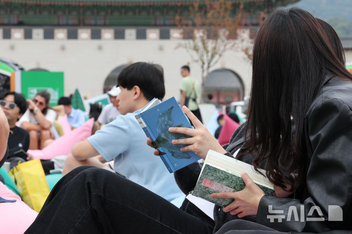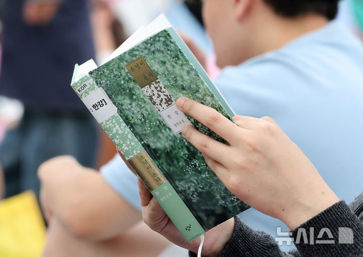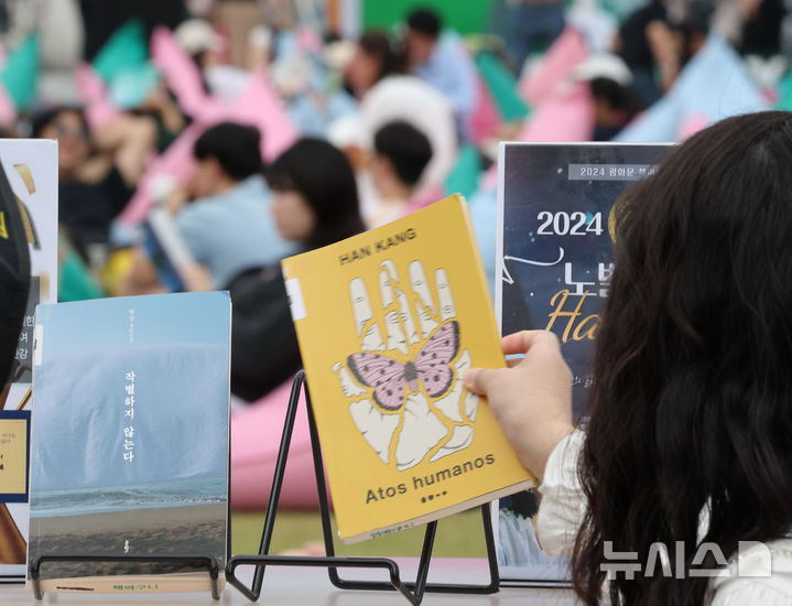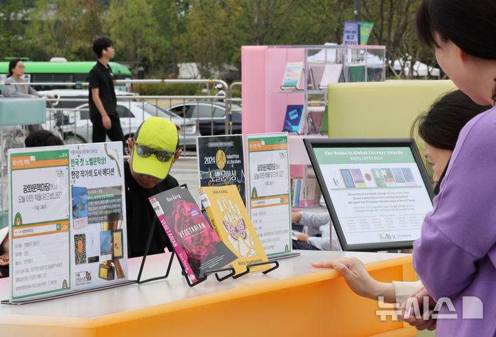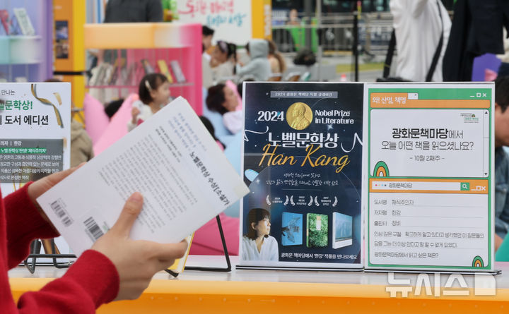 【NEWSIS】13日、ソウル市鍾路区の光化門広場にあるソウル野外図書館「本の広場」で、韓江(ハン・ガン)氏のノーベル文学賞受賞を祝うため、特別展示が行われた。写真は韓江氏の本を読む人々。