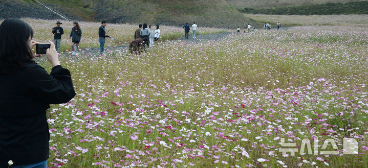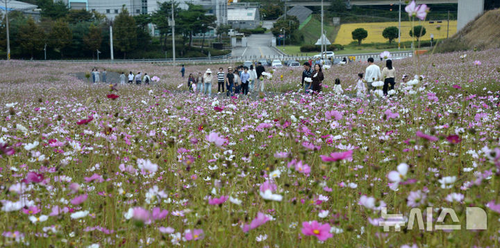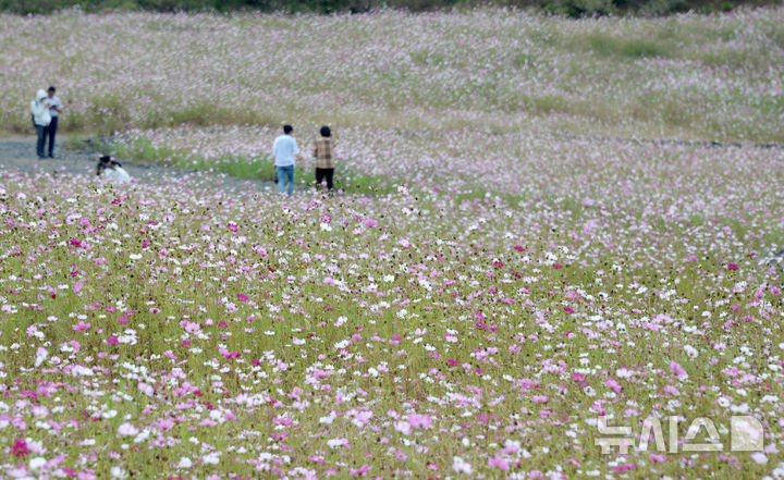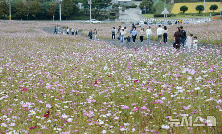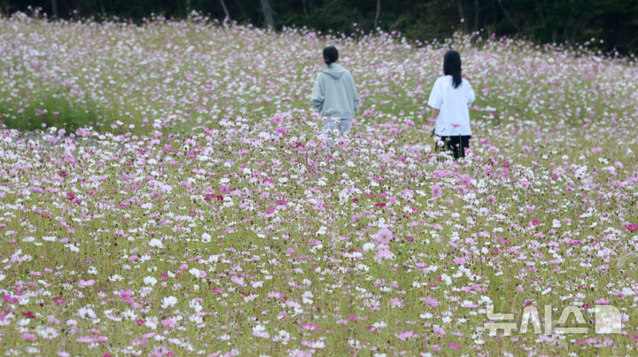 【NEWSIS】秋晴れが続いた13日、全北特別自治道任実郡のコスモス畑を訪れ、散歩したり記念撮影したりする人々。