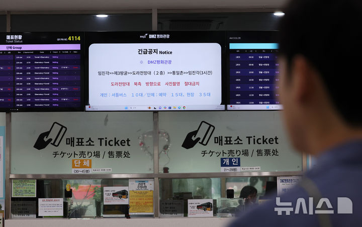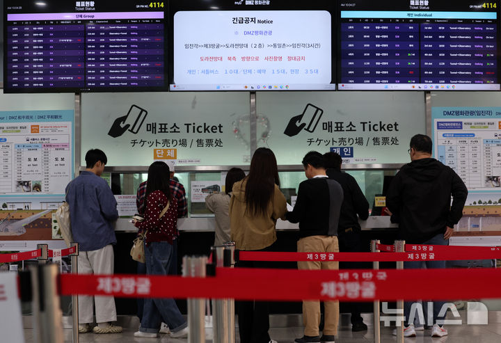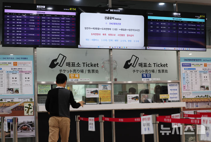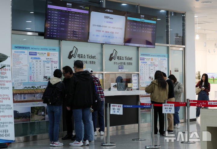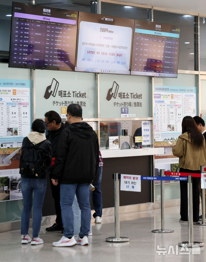京畿道坡州市の臨津閣DMZ(非武装地帯)平和観光(第3トンネル、都羅展望台、統一村直売所)チケット売り場で16日午前、観光客が問い合わせをしていた。