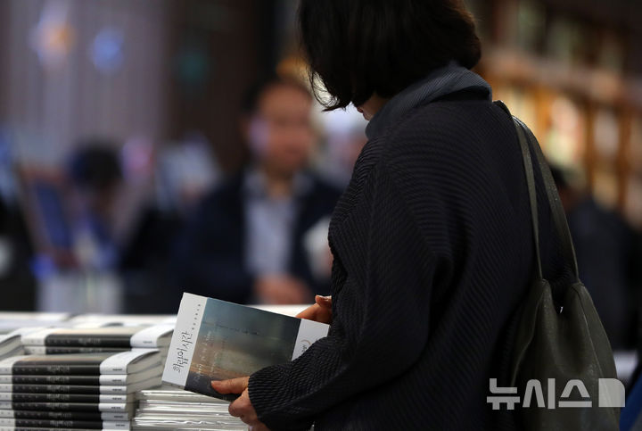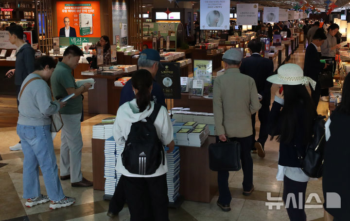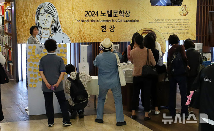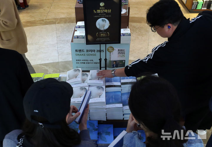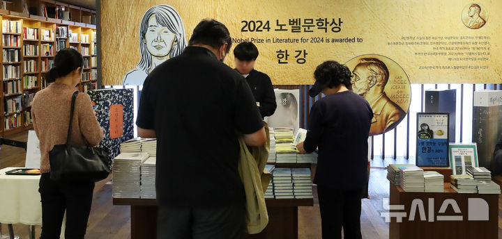 ノーベル文学賞を受賞した小説家・韓江(ハン・ガン)氏の書籍の販売数が100万部を突破した16日、ソウル市鍾路区の教保文庫光化門店で、市民たちが韓江氏の書籍を選んでいる様子。
