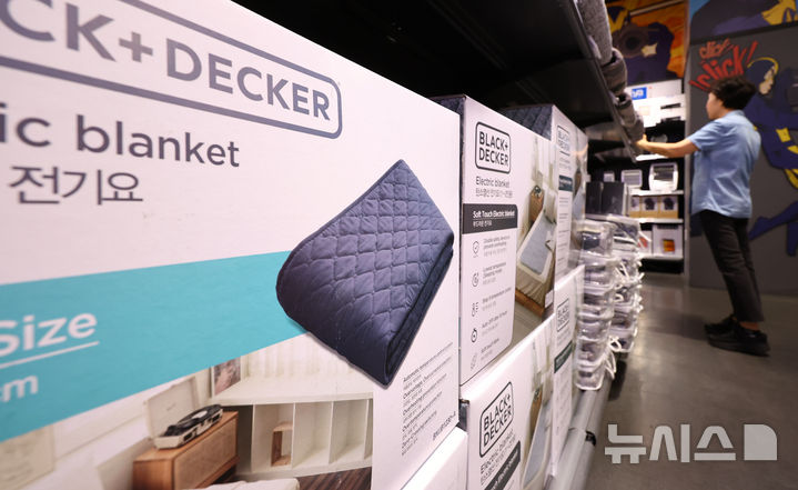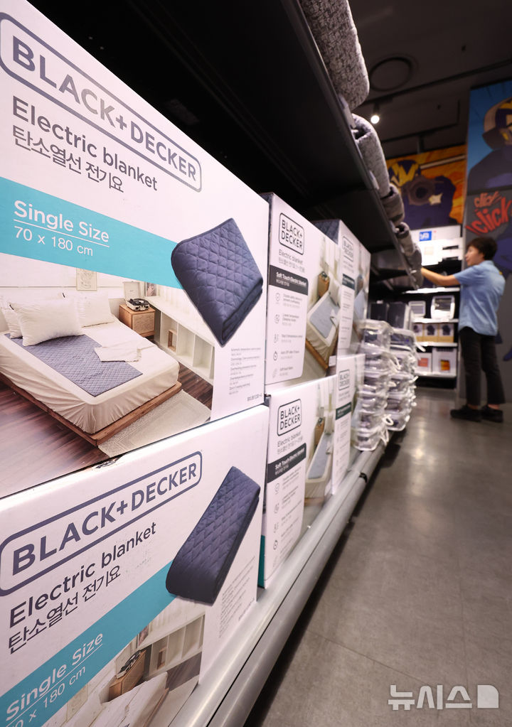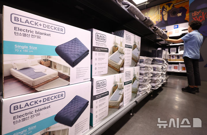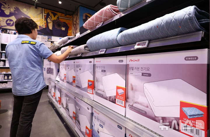 【NEWSIS】ソウル市内のある大手スーパーで16日、従業員が電気毛布やストーブなど防寒用品を整理している様子。