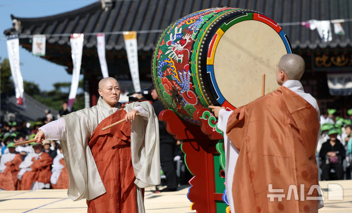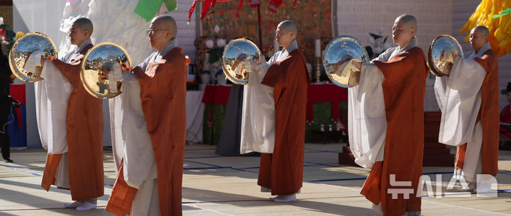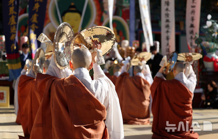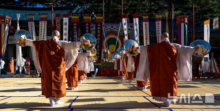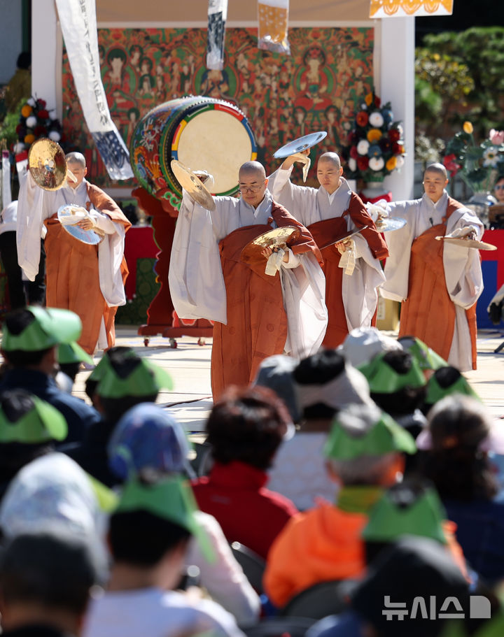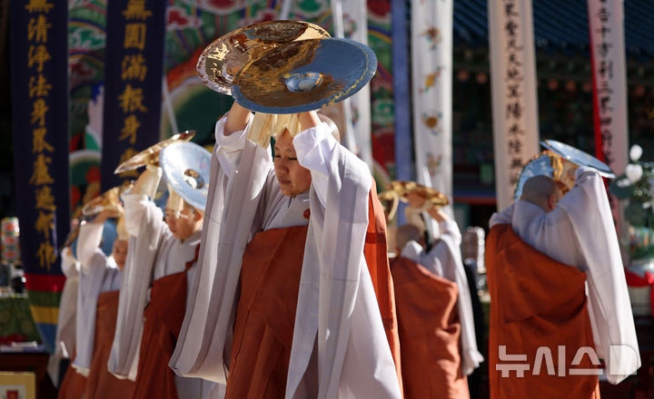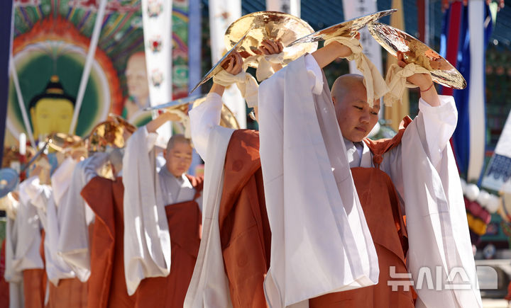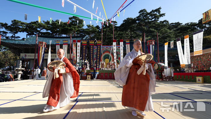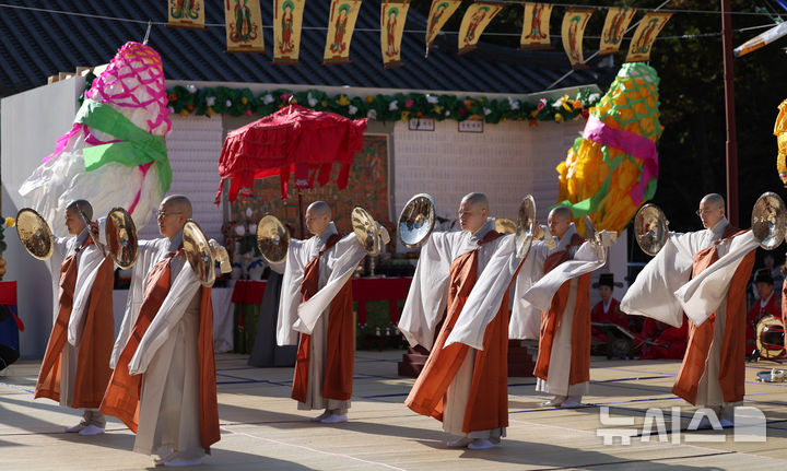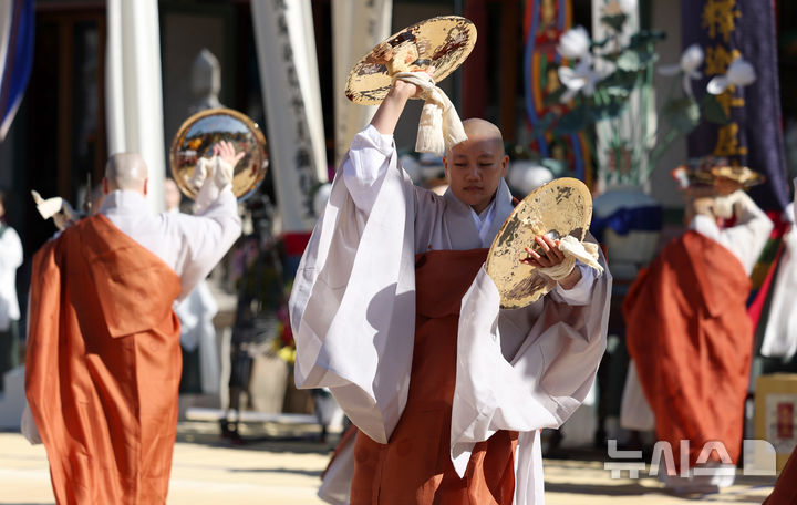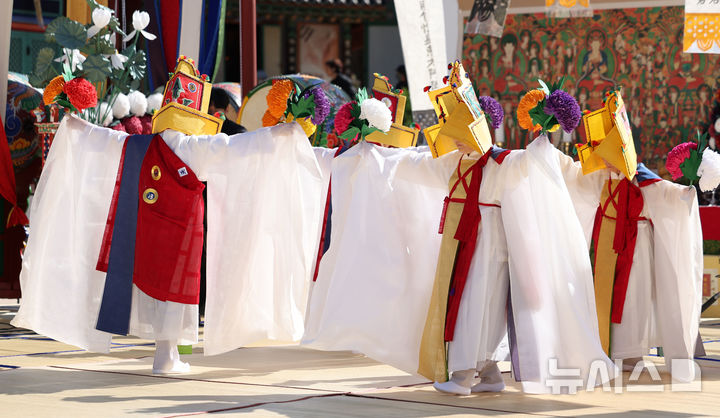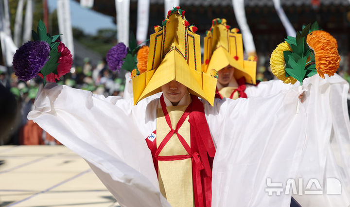 【NEWSIS】20日、ソウル市恩平区津寛寺で、開建626周年記念「2024津寛寺 国行水陸斎」が行われた。写真は仏教舞踊「バラ舞」をする尼僧たち。