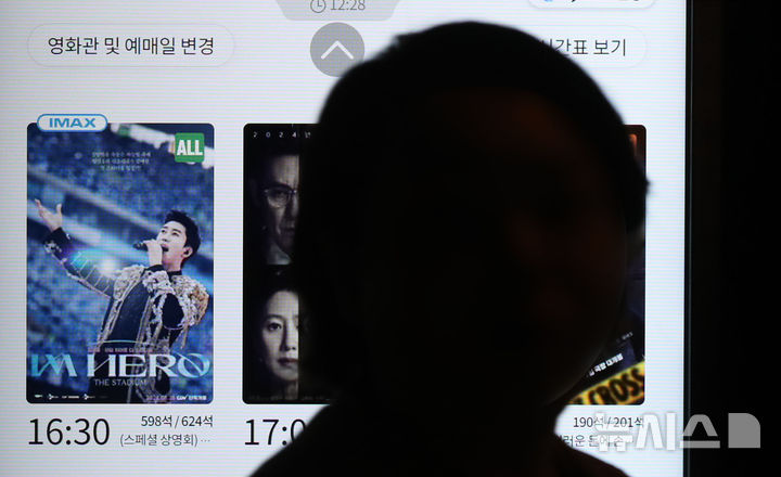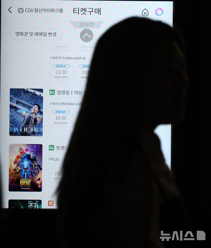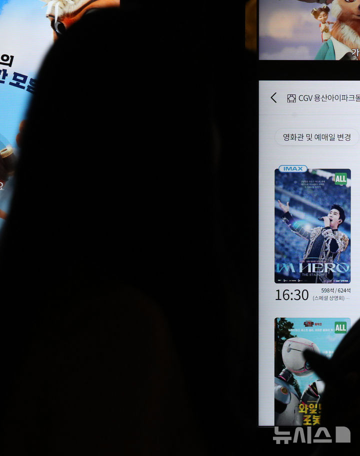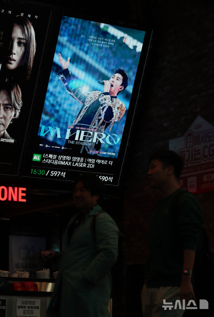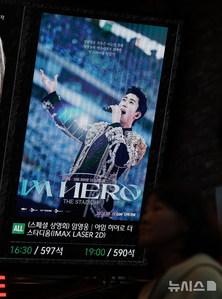 【NEWSIS】21日、ソウル市竜山区の映画館「CGV竜山アイパークモール店」のチケット売り場に、イム・ヨンウンのコンサート実況映画『イム・ヨンウン I'M HERO THE STADIUM』の上映情報が表示されている様子。
