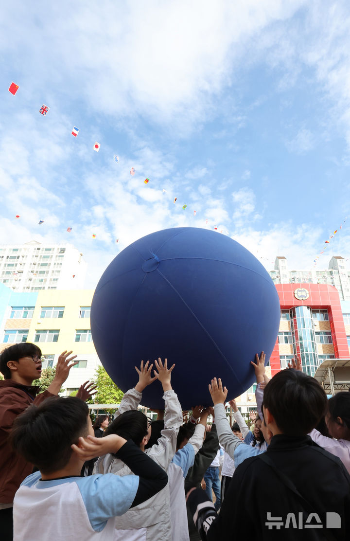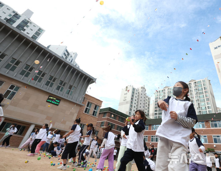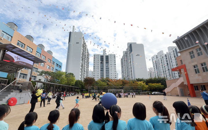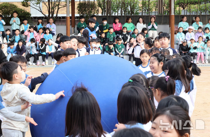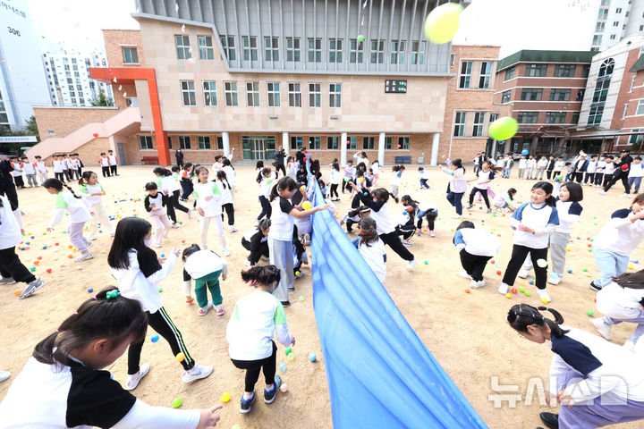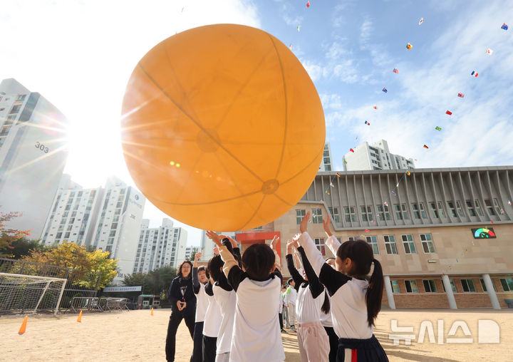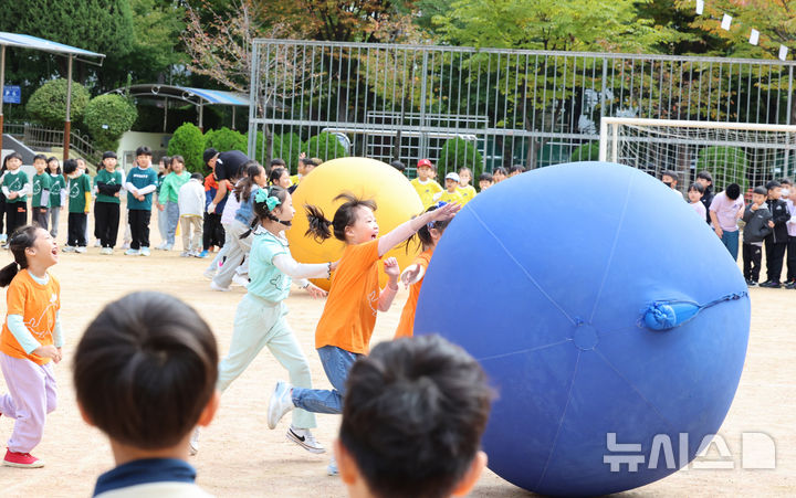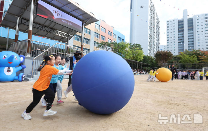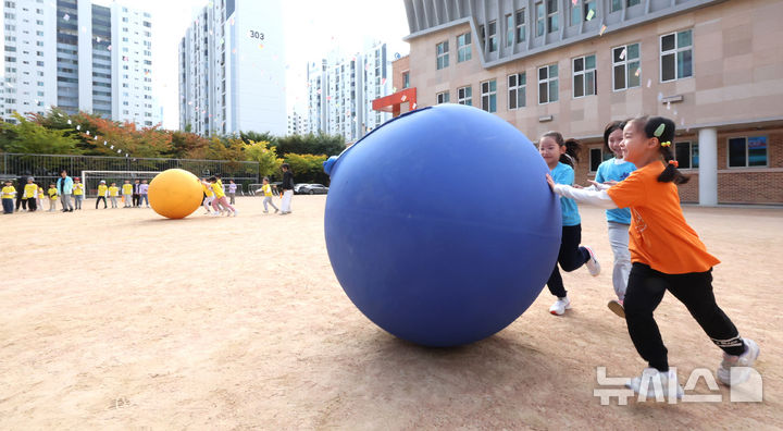 【NEWSIS】21日午前、仁川市富平区の富谷小学校で開かれた秋の運動会で、大玉転がしをしている子どもたちの様子。