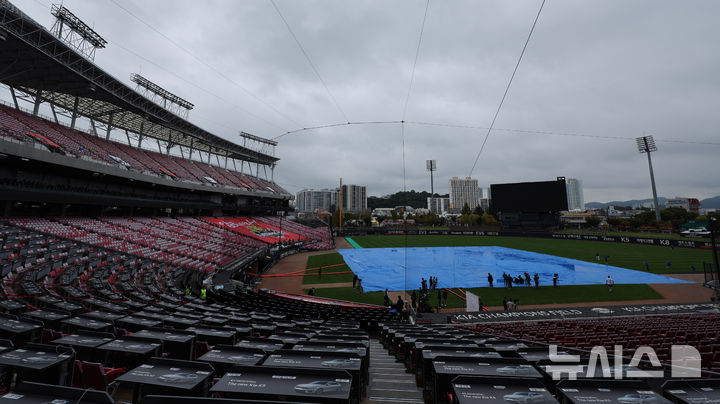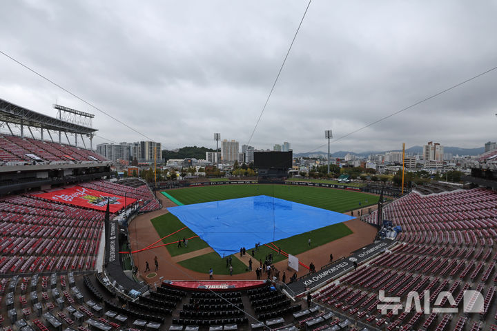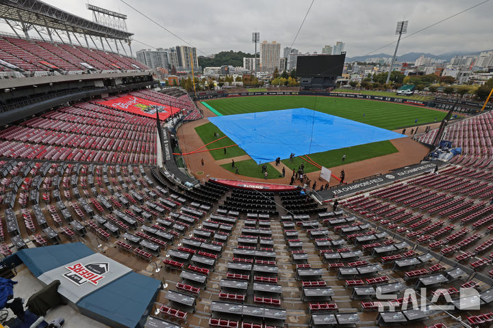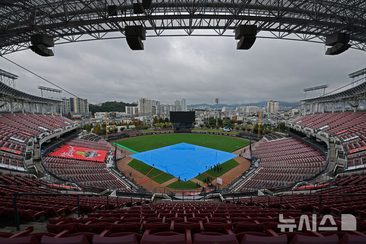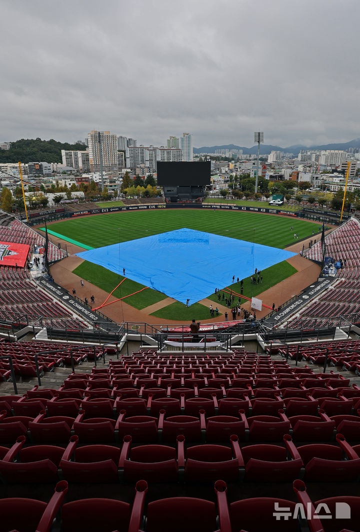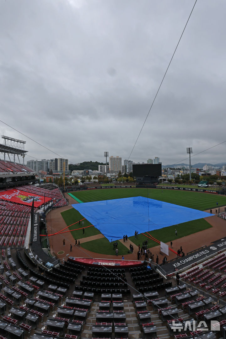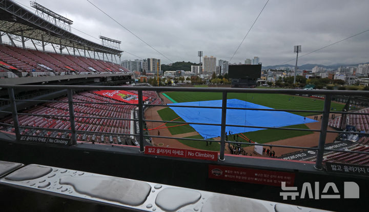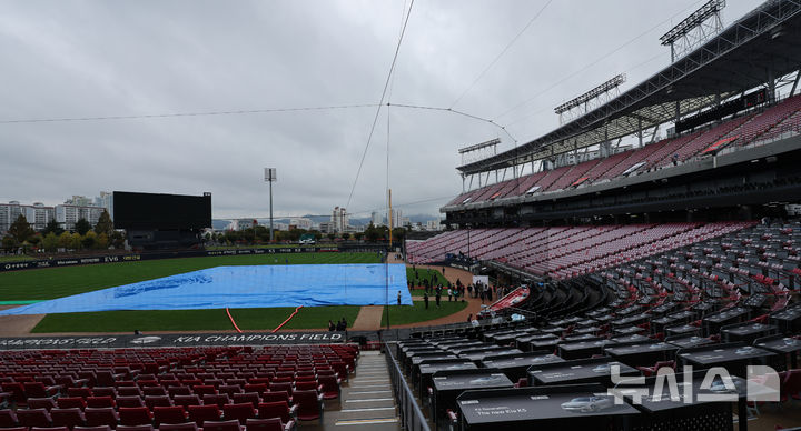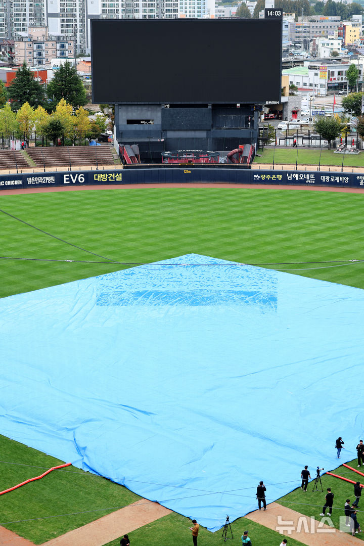 【NEWSIS】22日、光州市北区の光州・起亜チャンピオンズフィールドのグラウンドが防水シートで覆われている様子。