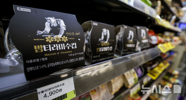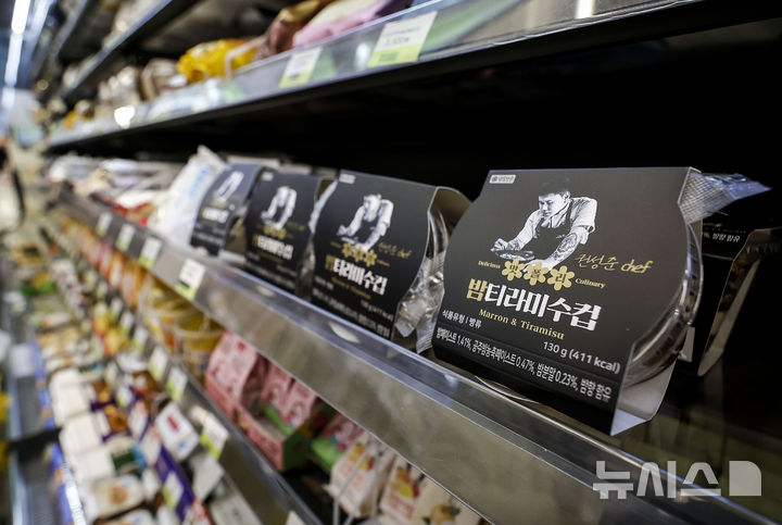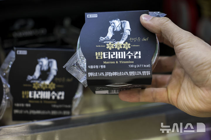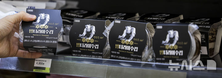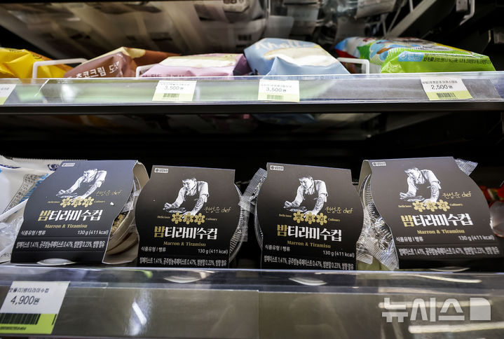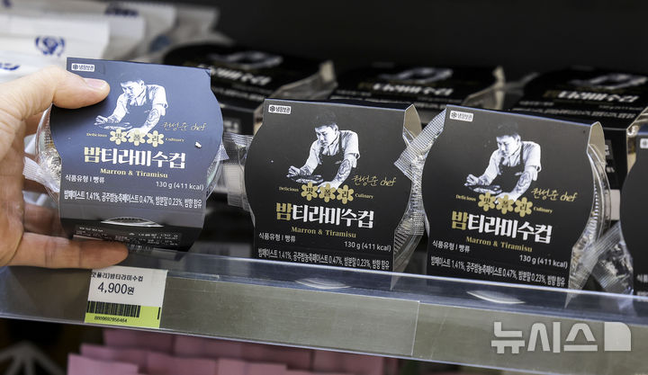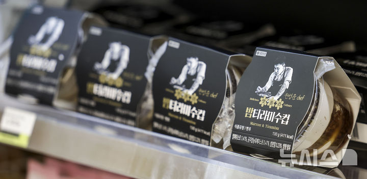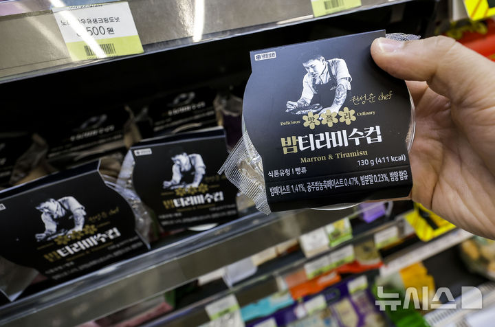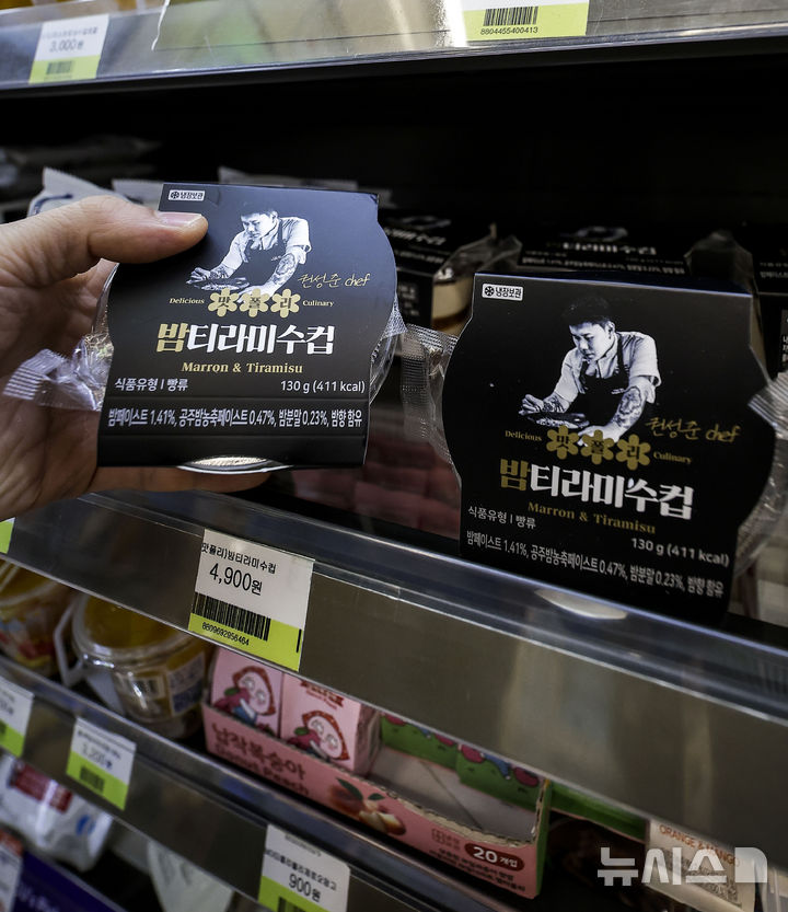 【NEWSIS】24日、ソウル市江南区のコンビニ「CU BGF社屋店」に、料理対決番組『白と黒のスプーン ~料理階級戦争~』で優勝したシェフ、クォン・ソンジュンさんとコラボして開発した「栗ティラミス・カップ」が陳列してある様子。