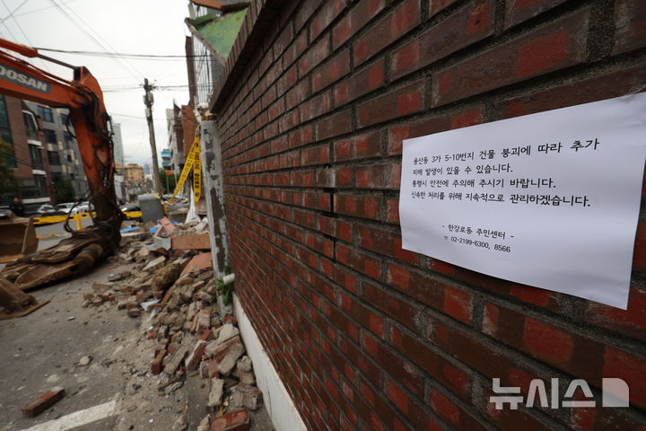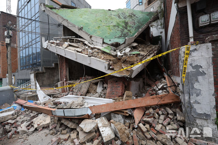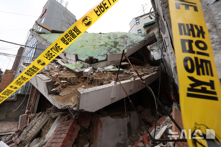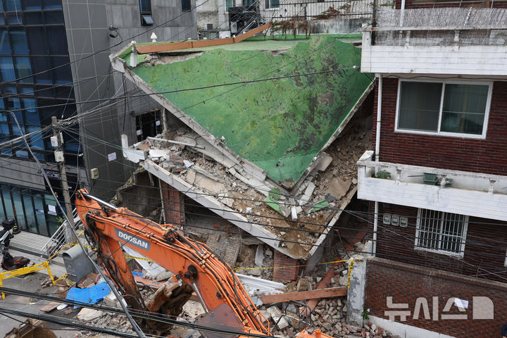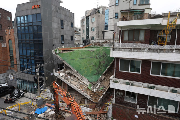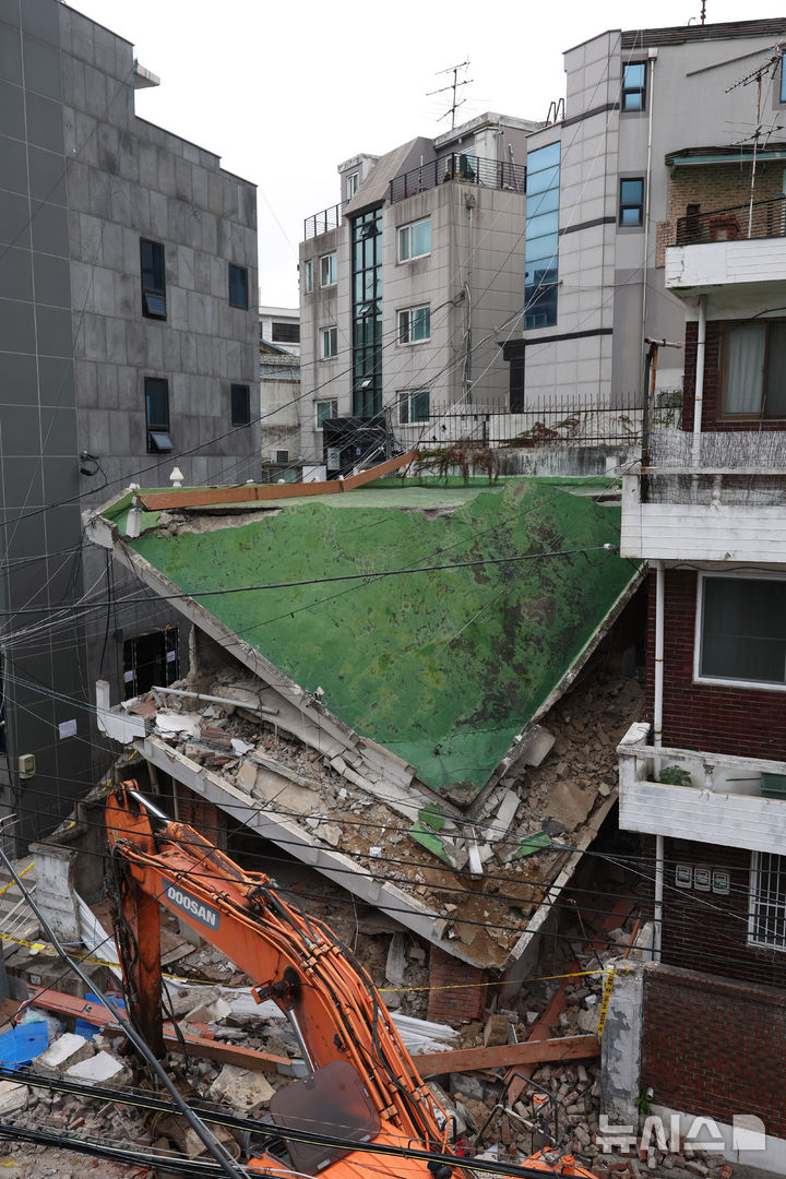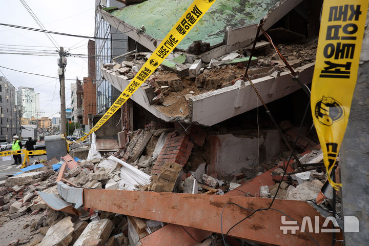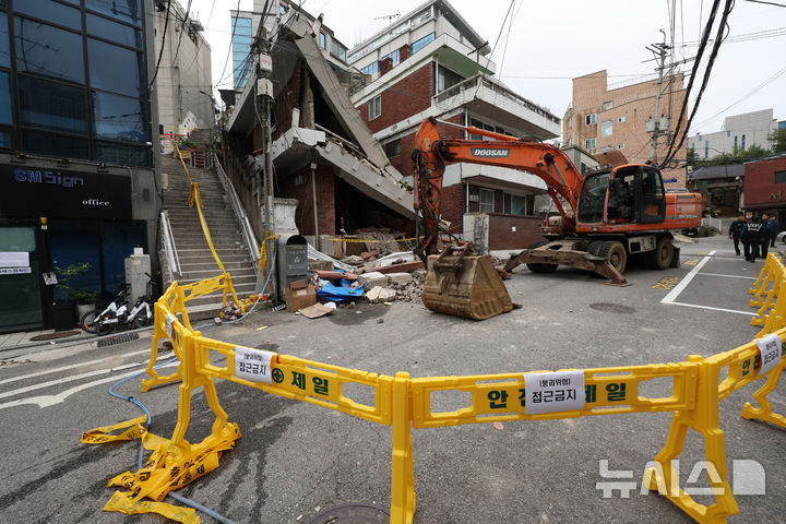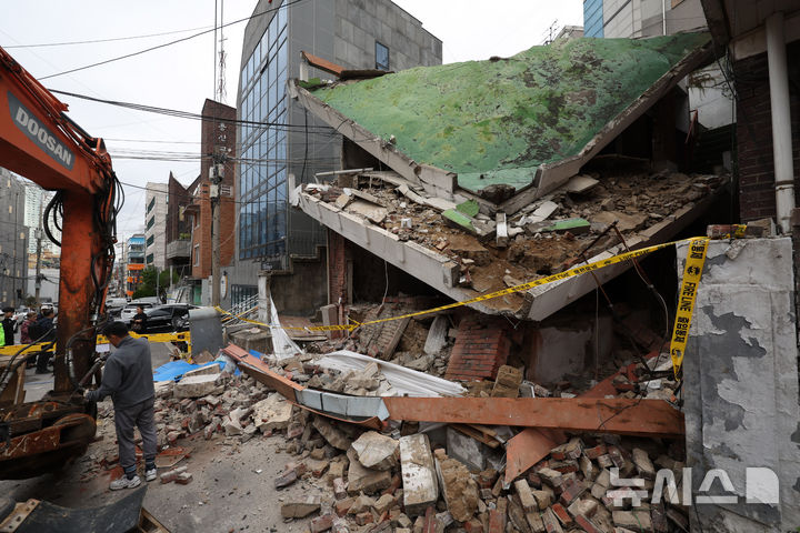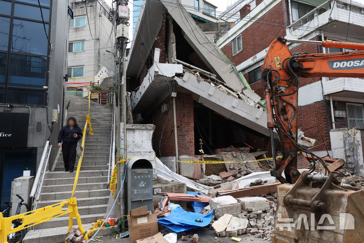 【NEWSIS】27日午前、前日崩壊したソウル市竜山区の多世帯住宅(集合住宅)で、撤去作業を進める工事関係者たち。