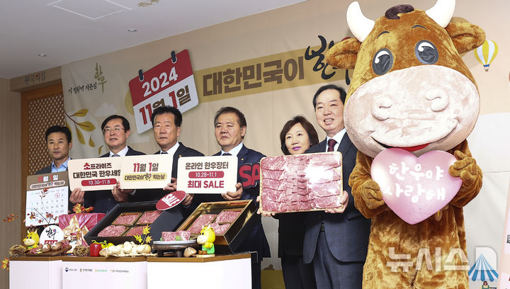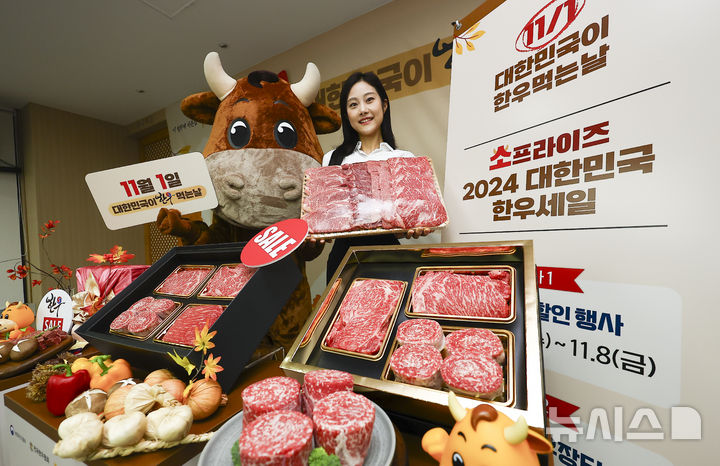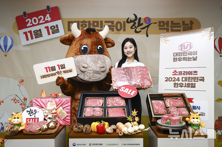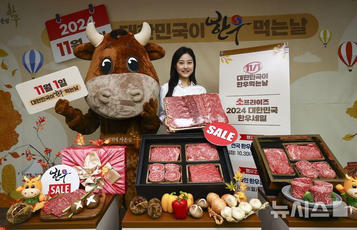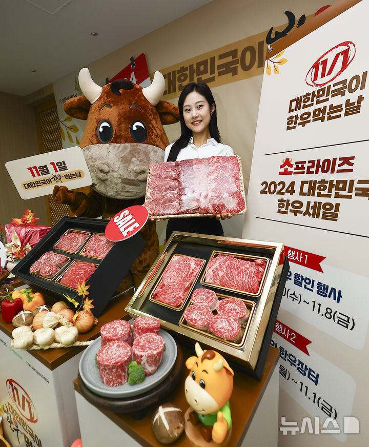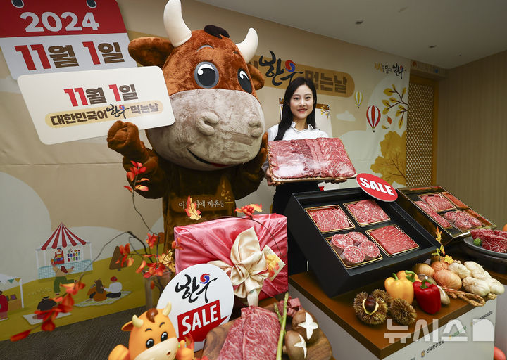 ソウル市中区のコリアハウスで28日午前、「韓牛(韓国伝統の肉牛)自助金、11.1大韓民国が韓牛を食べる日フォトイベント」が行われ、イベントコンパニオンらがポーズを取っている様子。