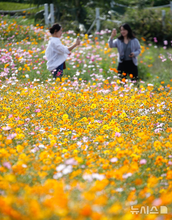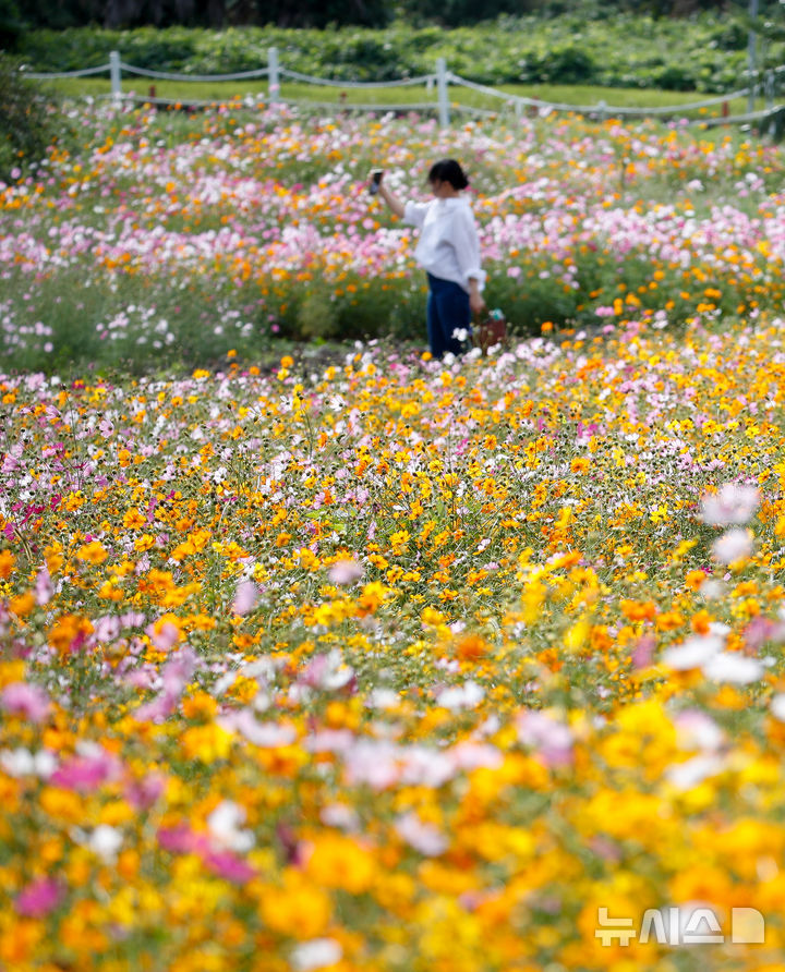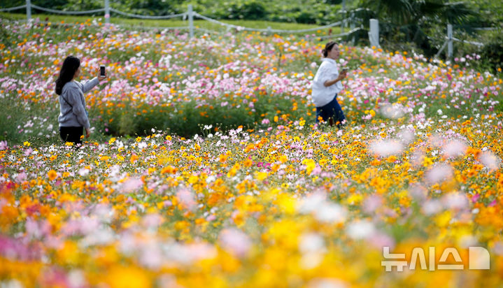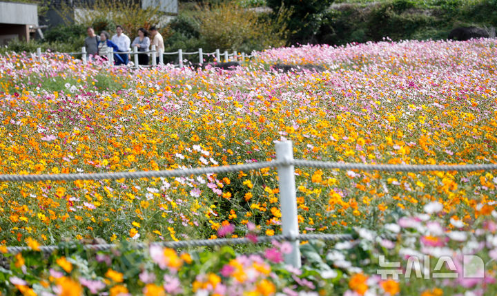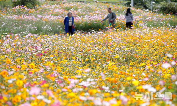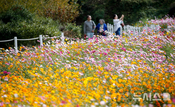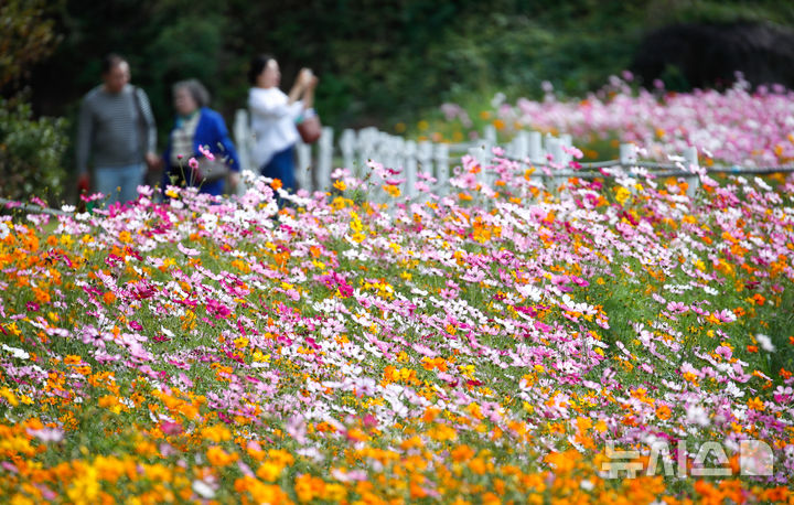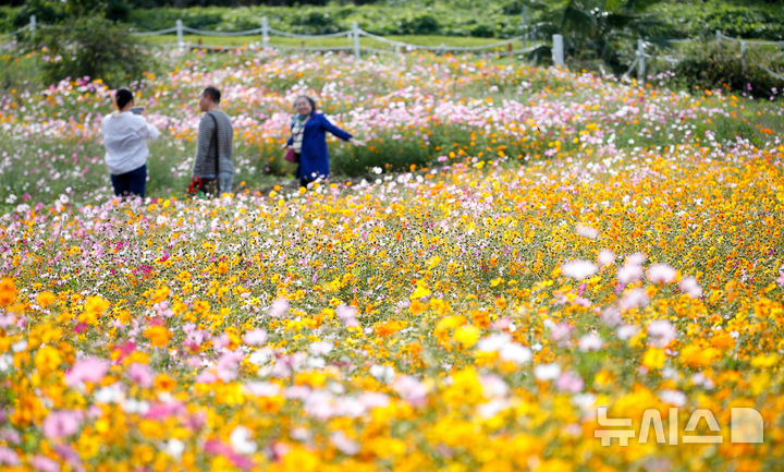 【NEWSIS】晴天となった30日午前、済州島西帰浦市の中文・穡達海水浴場近くではコスモスが大きく開花し、通りすがりの人々の視線を引き付けていた。
