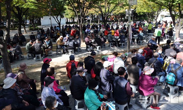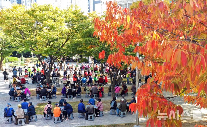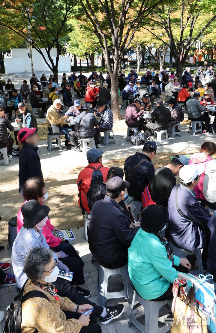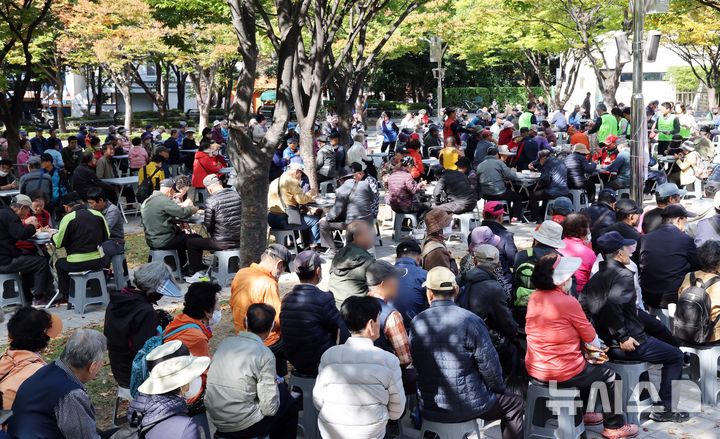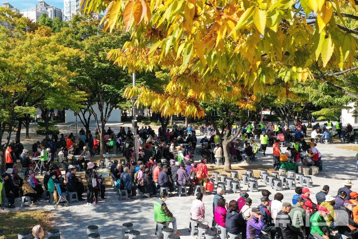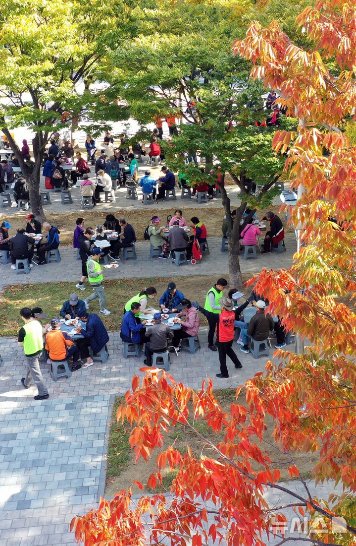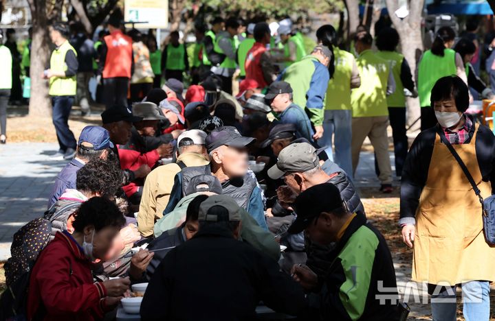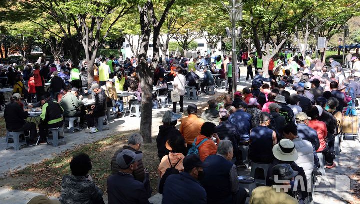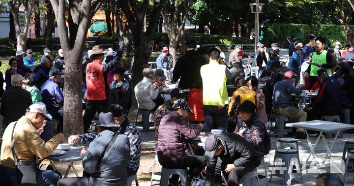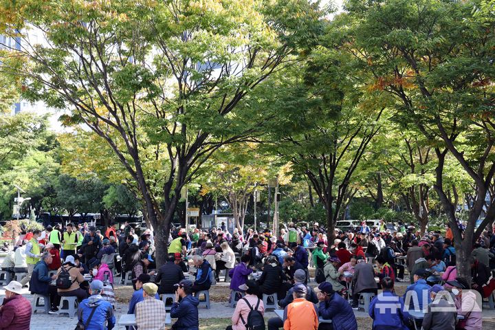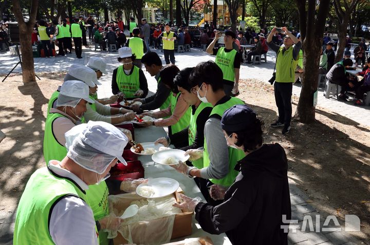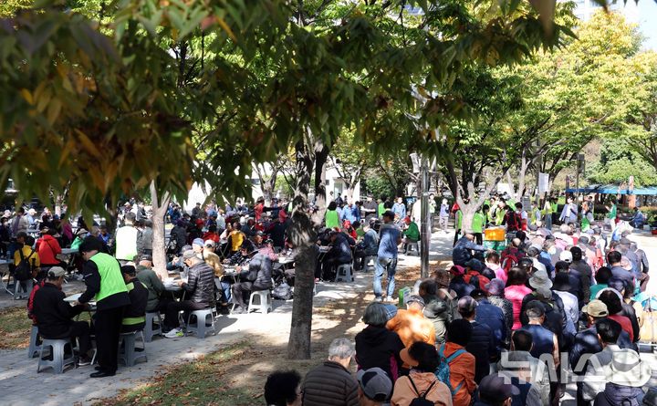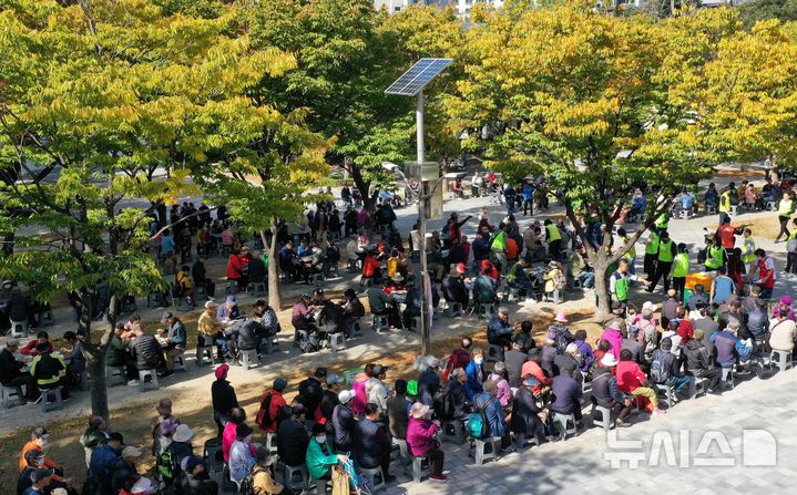 【NEWSIS】韓国労総釜山本部と釜山パプポ分かち合い共同体の関係者、ボランティアなどが30日、釜山市蓮堤区の釜山市庁緑陰広場で、脆弱階層の高齢者およそ500人に無料で食事を提供している様子。