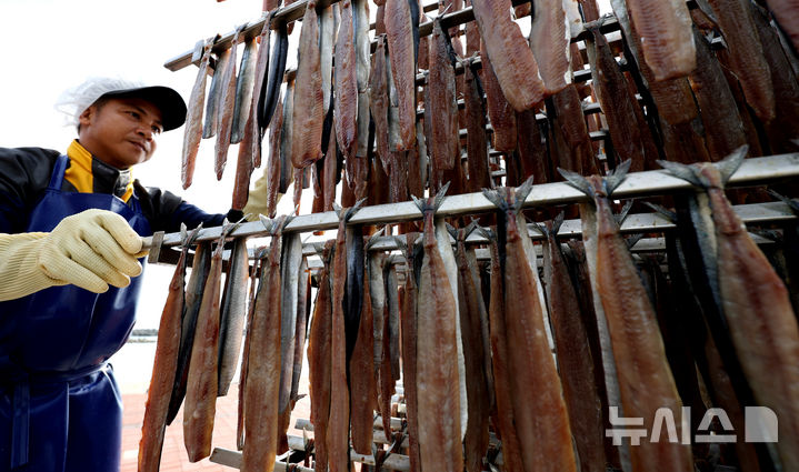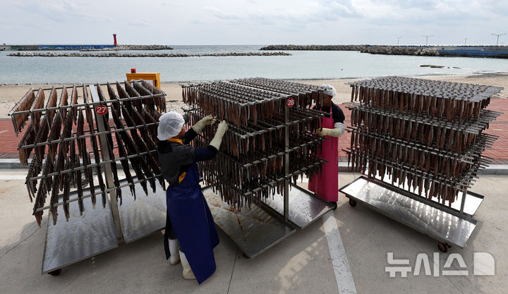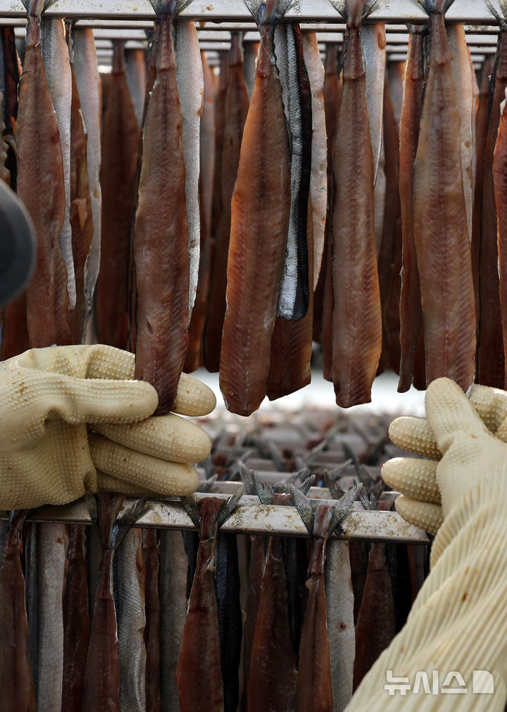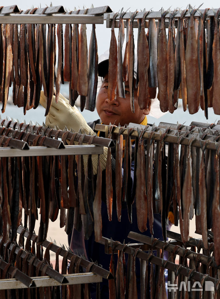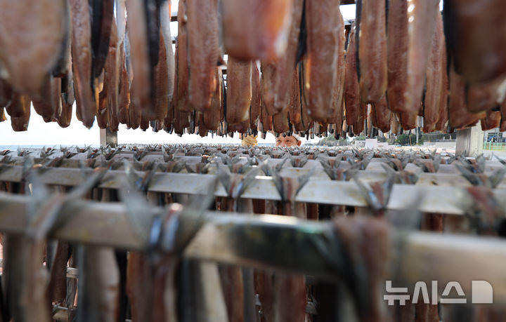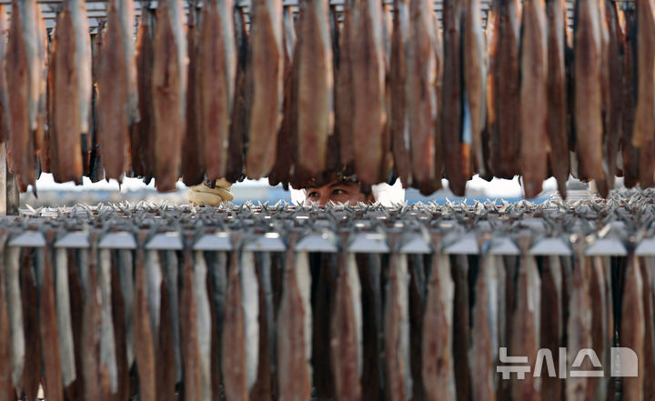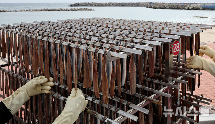 【NEWSIS】浦項を代表する特産物、クァメギのシーズンが到来した。写真は31日、慶尚北道浦項市南区の九竜浦邑日出路の海岸で、漁業者がクァメギを海風で干している様子。