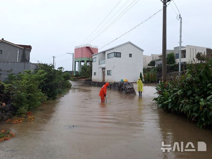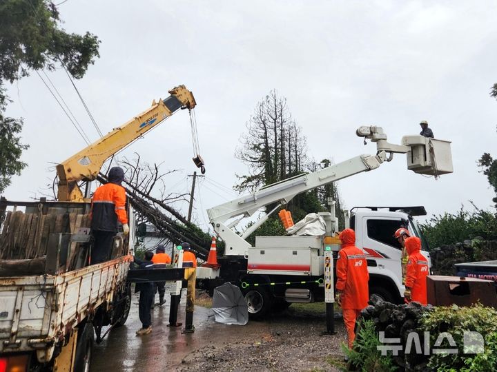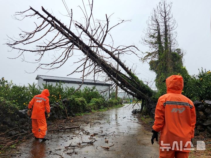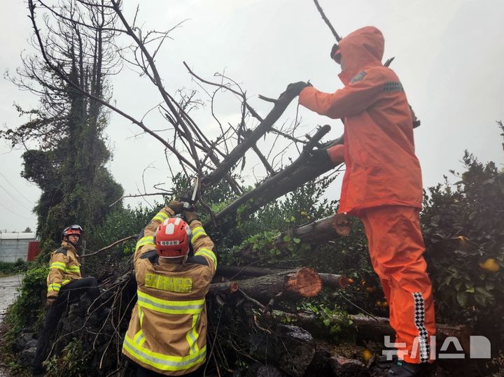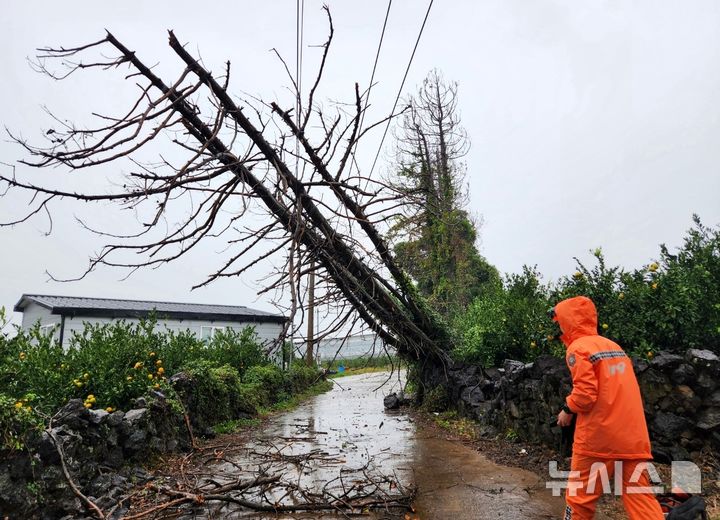 【NEWSIS】済州島西帰浦市南元邑の為美里で1日午後、強風により立木が倒れてしまい、消防当局が撤去作業に当たっている様子。