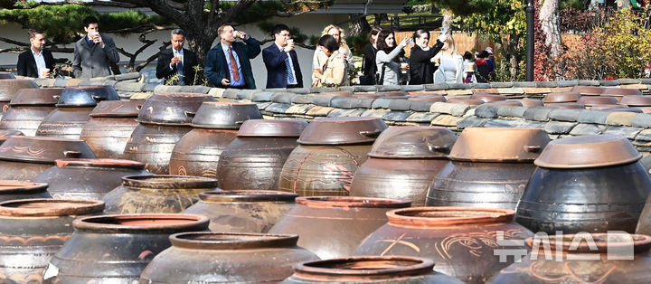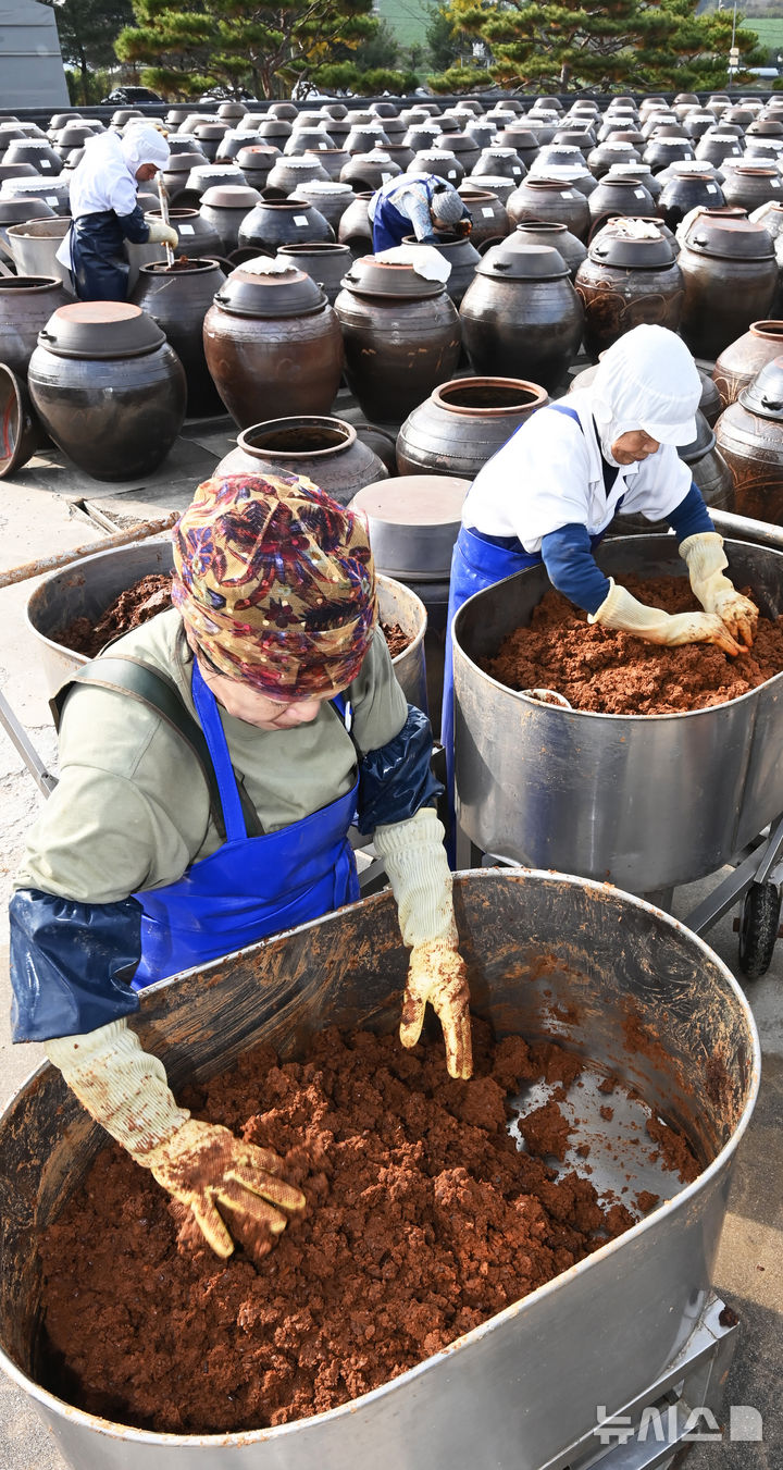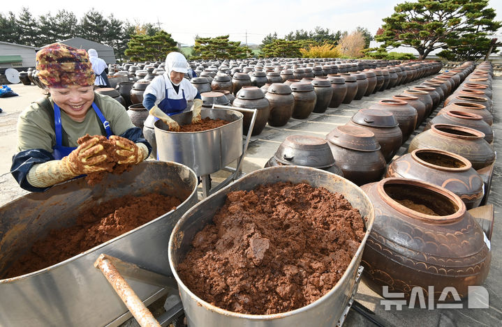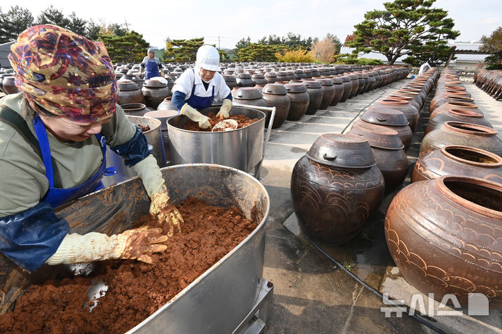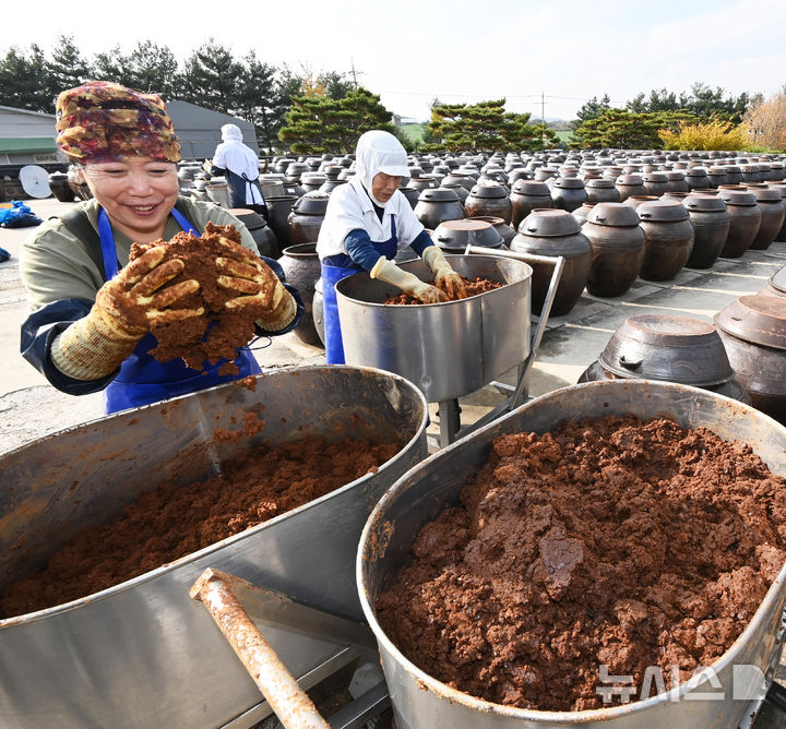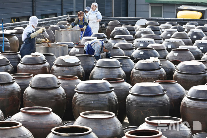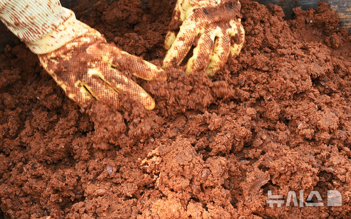 豆を発酵させてテンジャン(韓国みそ)やカンジャン(韓国しょうゆ)を作る韓国の「醤」文化に、ユネスコ(国連教育科学文化機関)人類無形文化遺産の「登録勧告」判定が下った。写真は5日、京畿道安城市一竹面のソイル農園で従業員が醤を管理している様子。