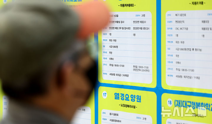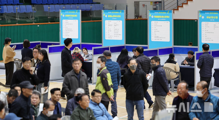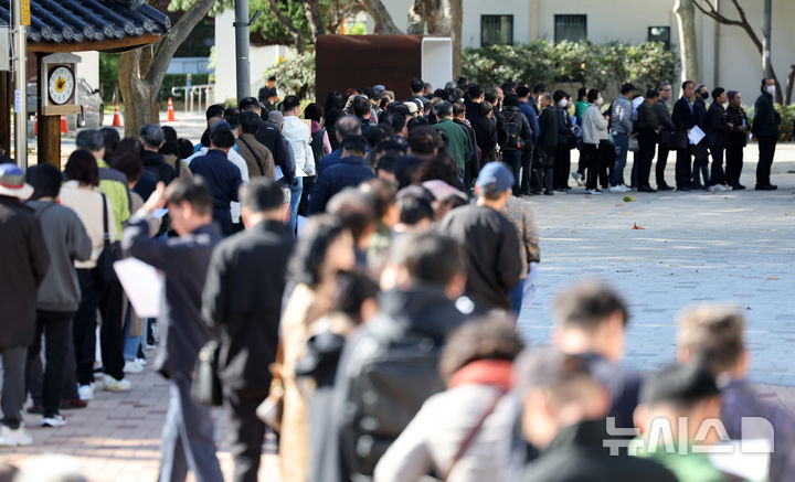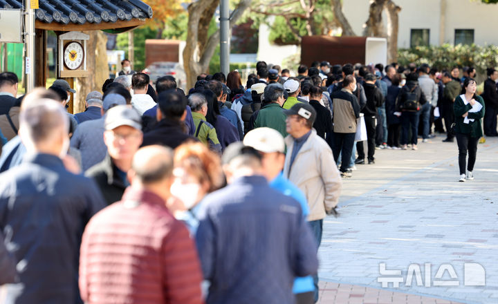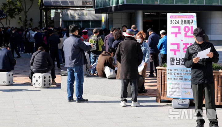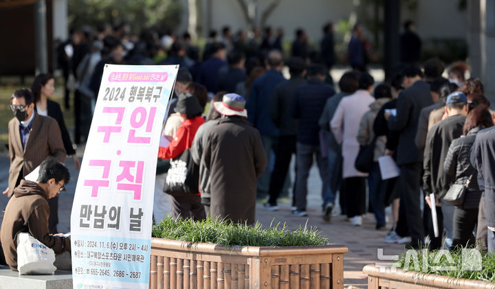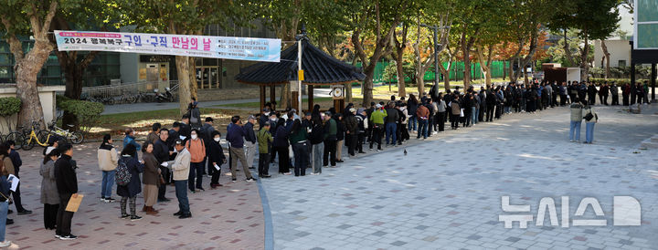 【NEWSIS】6日、大邱市北区の大邱複合スポーツタウン市民体育館で、求人・求職フェア「2024幸福北区 求人・求職 出会いの日」が開催された。写真は会場に入るために行列する求職者たち。