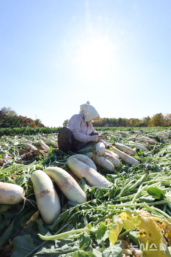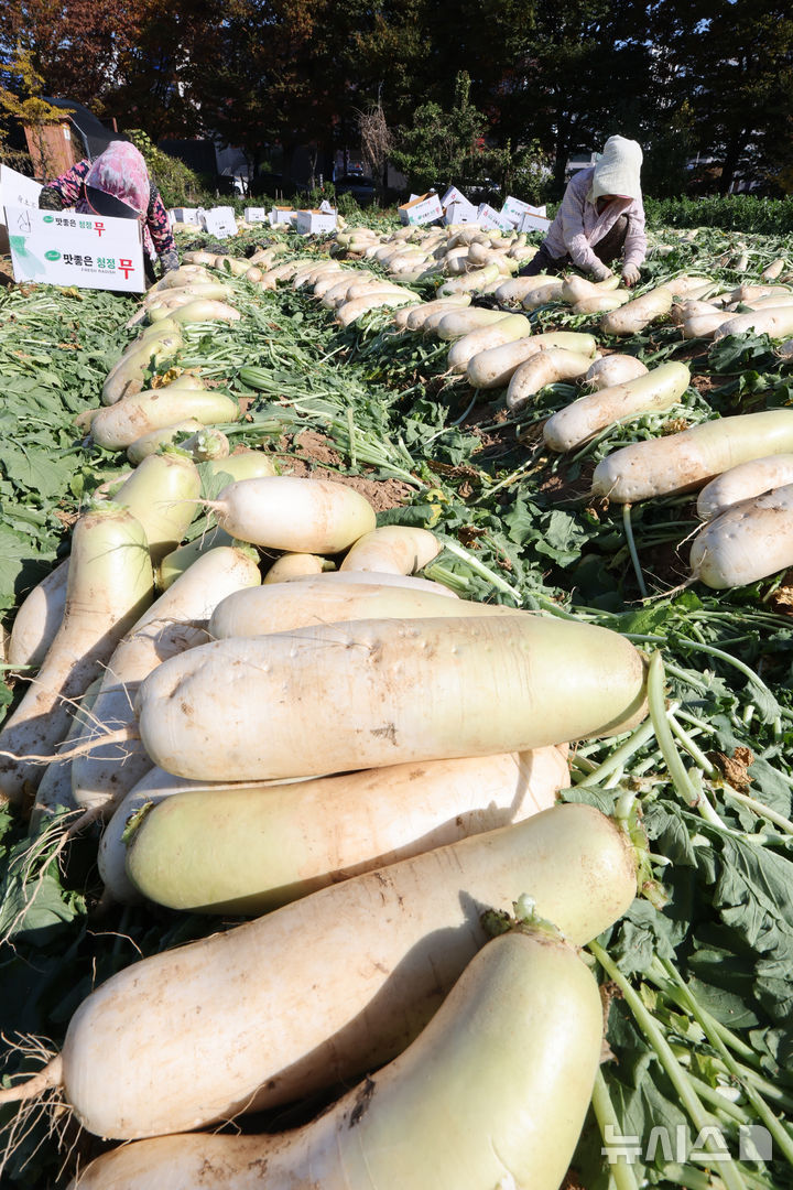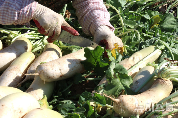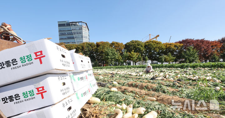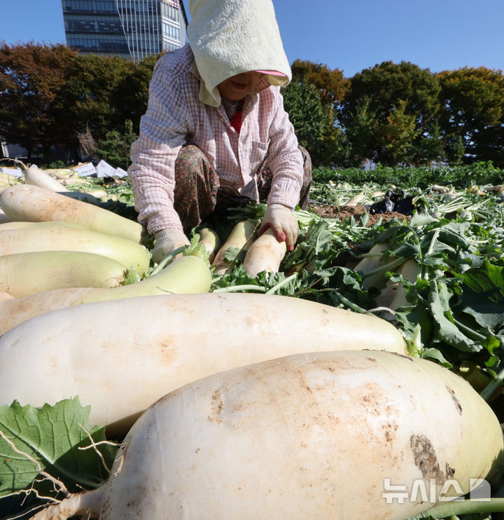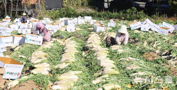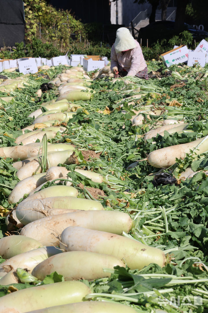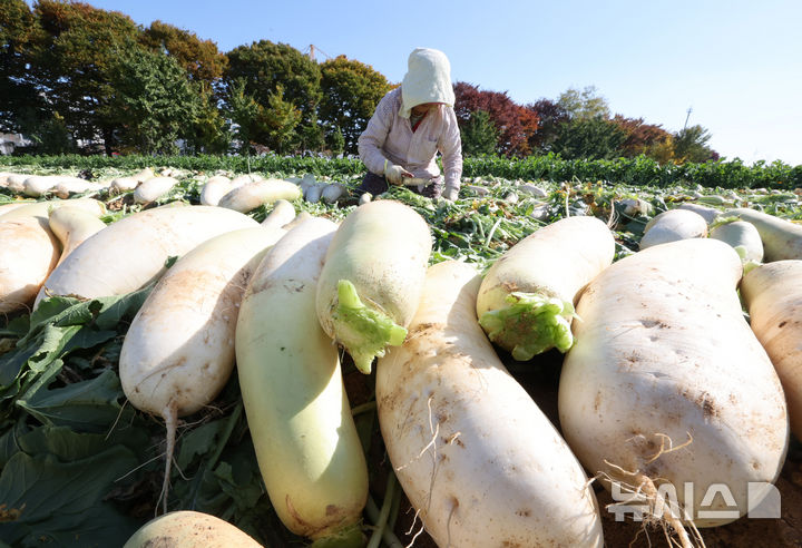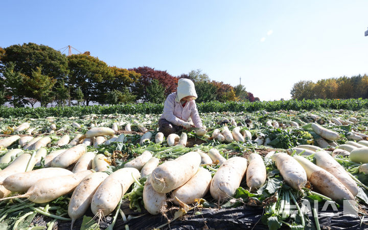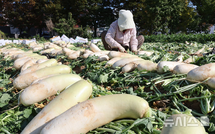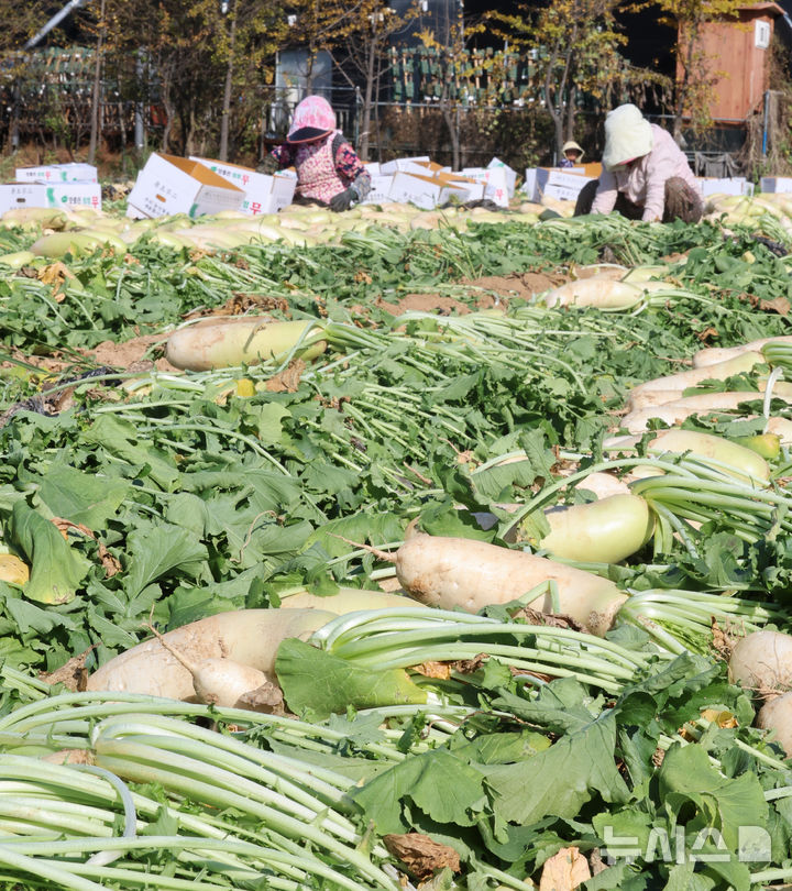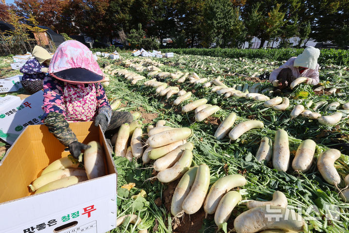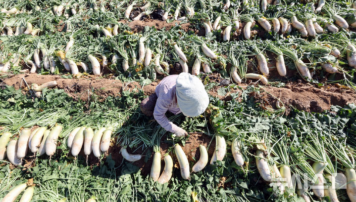 【NEWSIS】立冬前日の6日午後、仁川市南洞区のダイコン畑で、ダイコンの収穫をする農家の人。