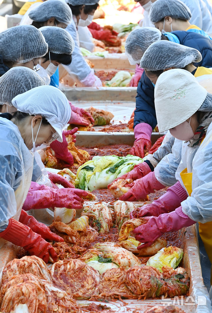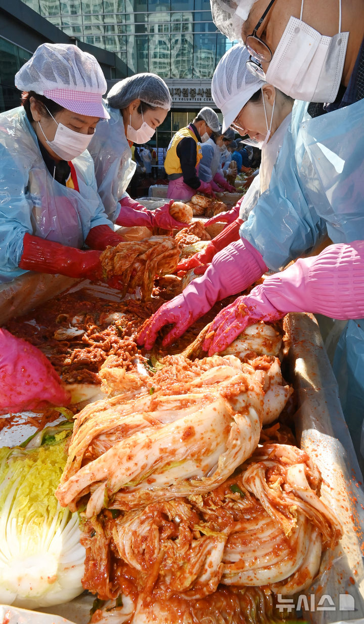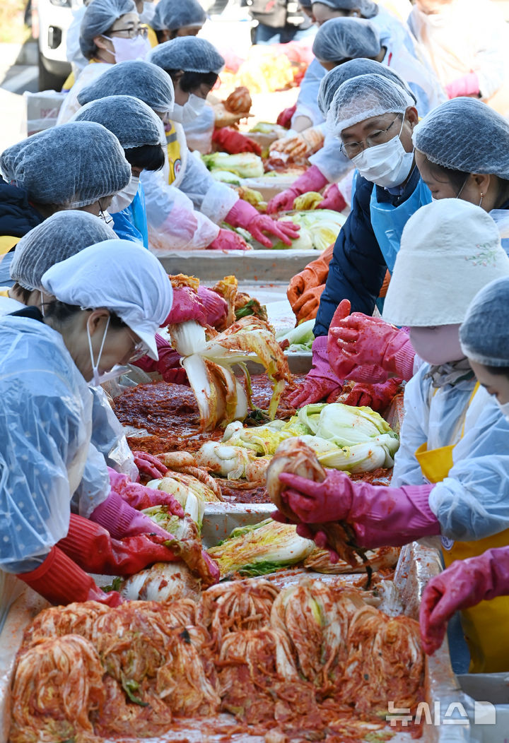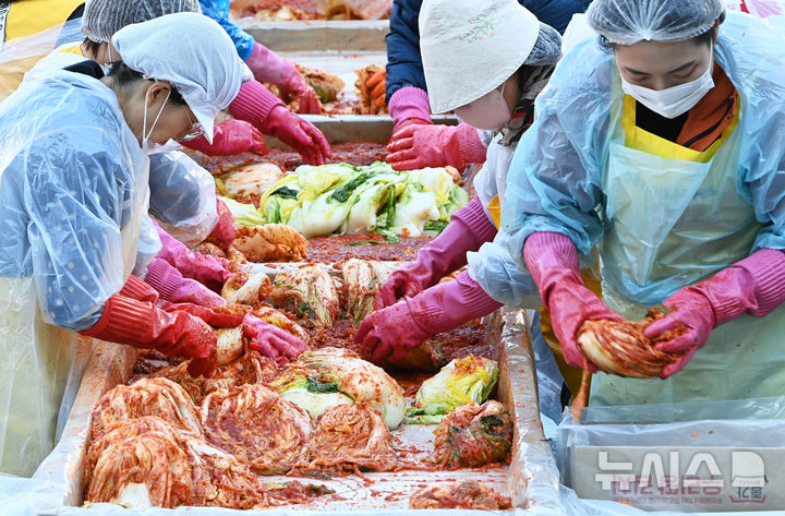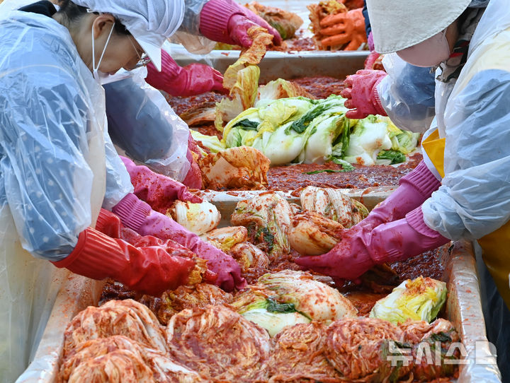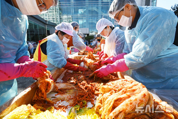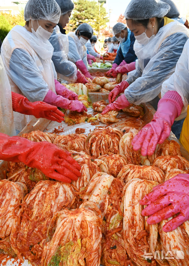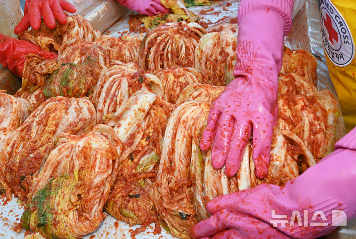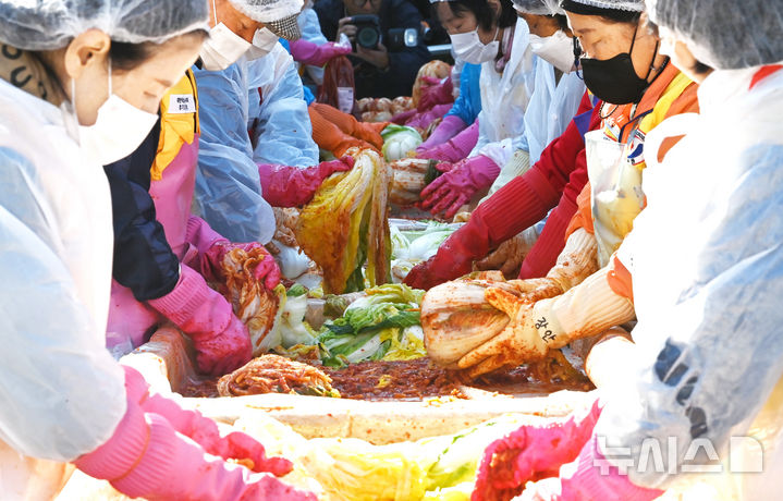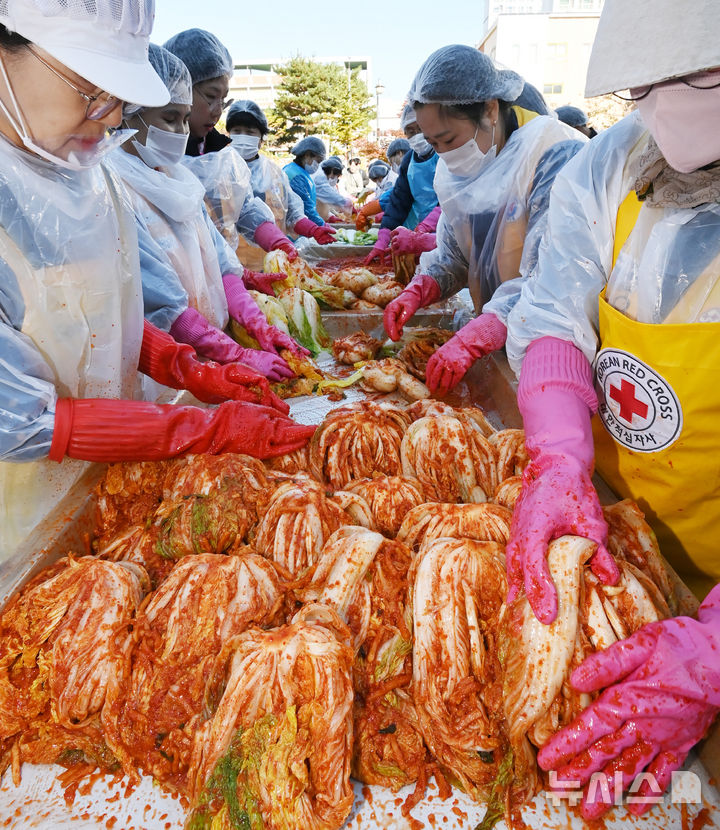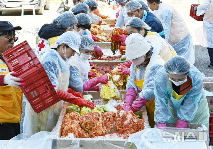 【NEWSIS】6日、京畿道華城市のボランティアセンターで、越冬用のキムチを漬ける「愛のキムジャン キムチ分かち合い」が行われた。写真は恵まれない人々に渡すキムチを漬ける大韓赤十字社のボランティアたち。