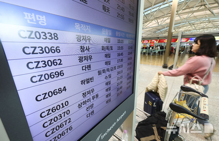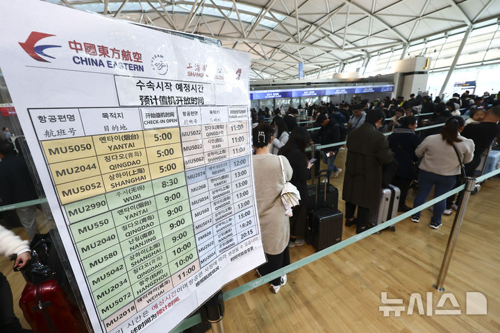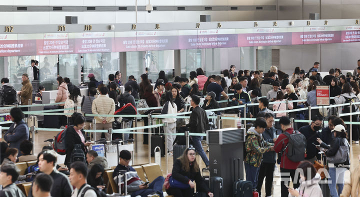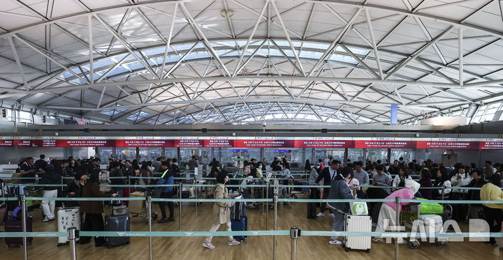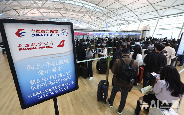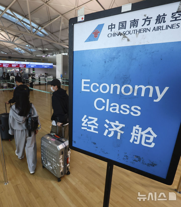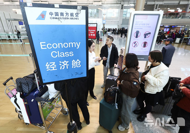 【NEWSIS】韓国人に対する中国の査証(ビザ)なし(ノービザ)入国施行初日となった8日、仁川市中区の仁川国際空港第1ターミナル出国フロアで、中国行きの飛行機に搭乗するための手続きを待つ韓国人観光客たち。