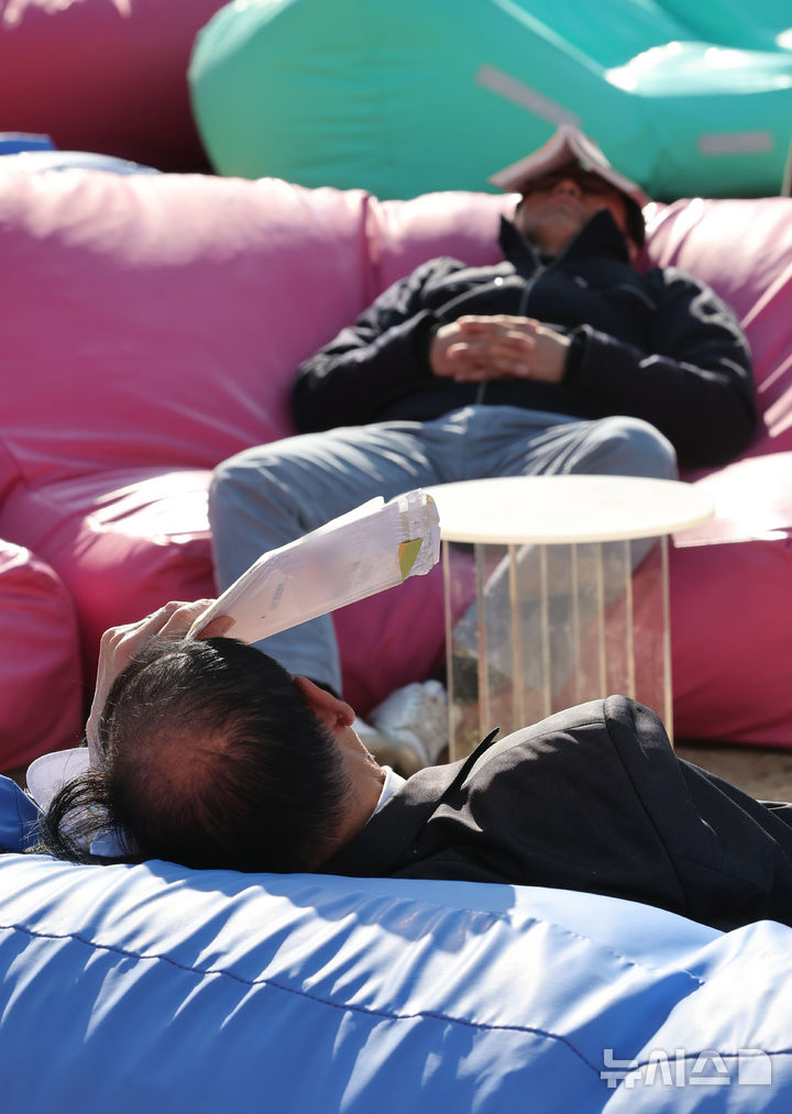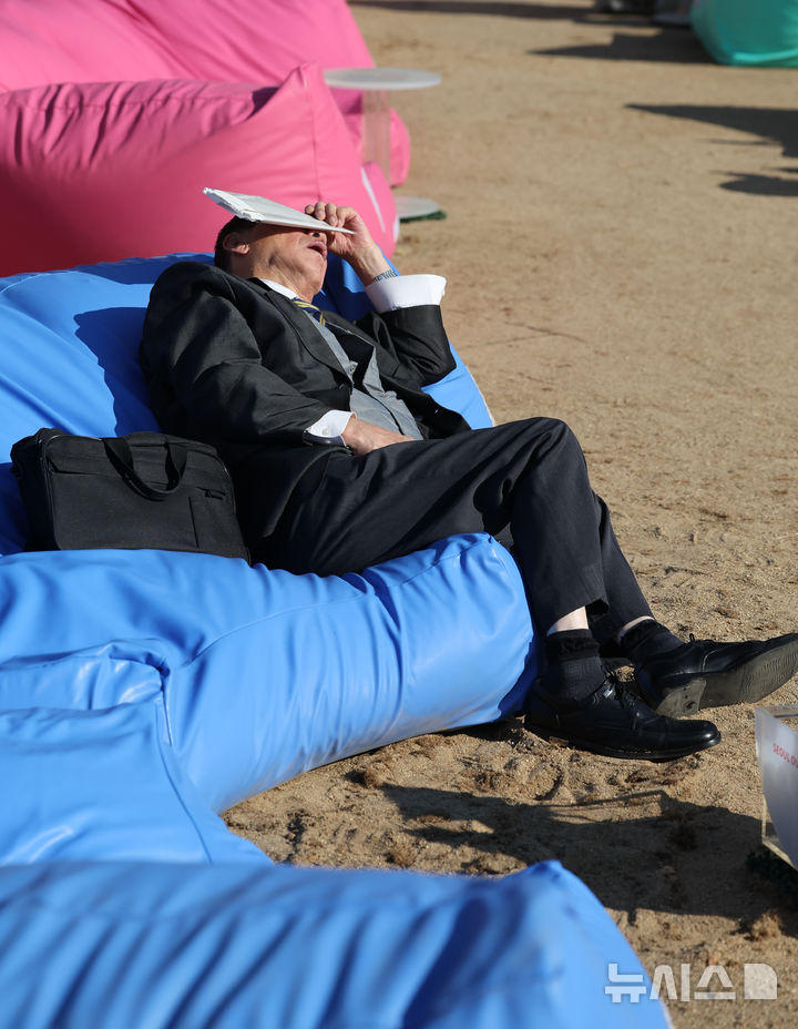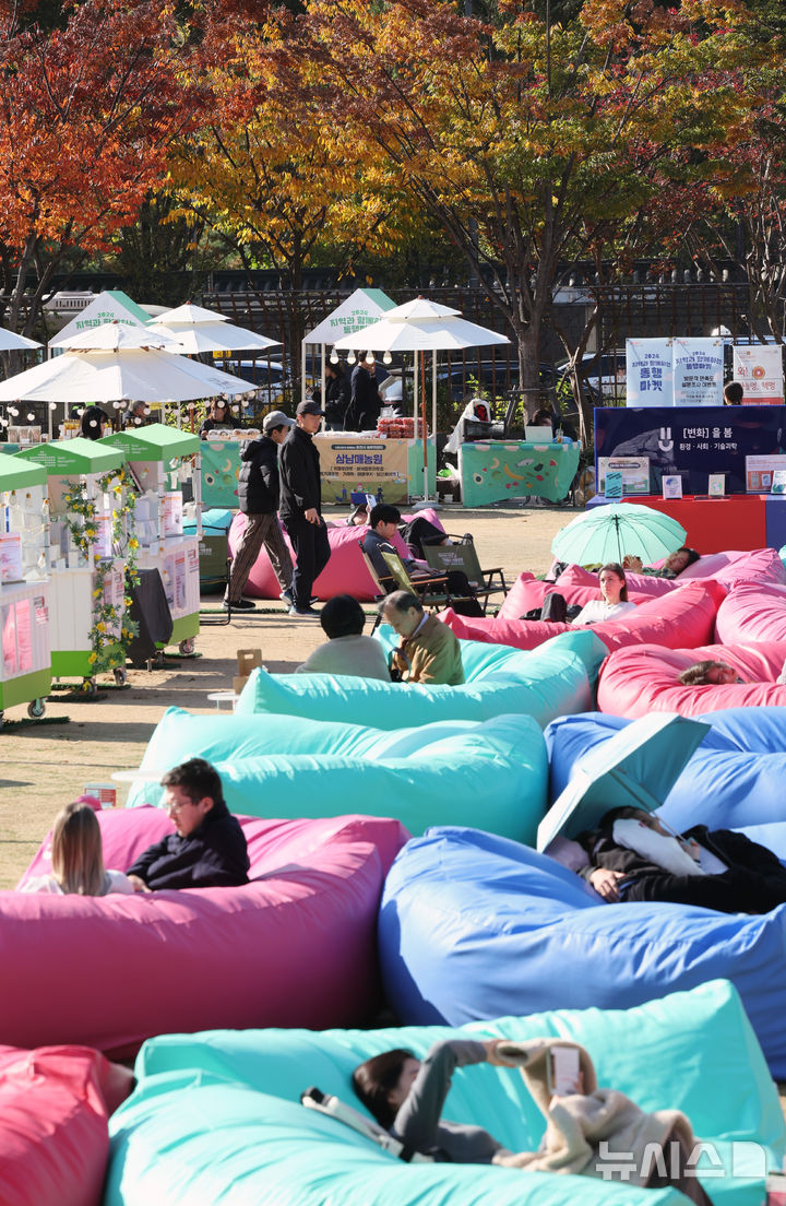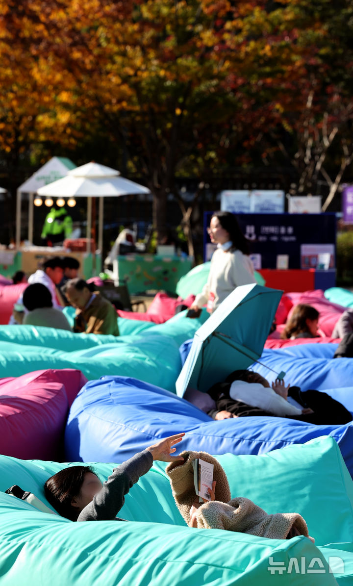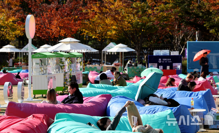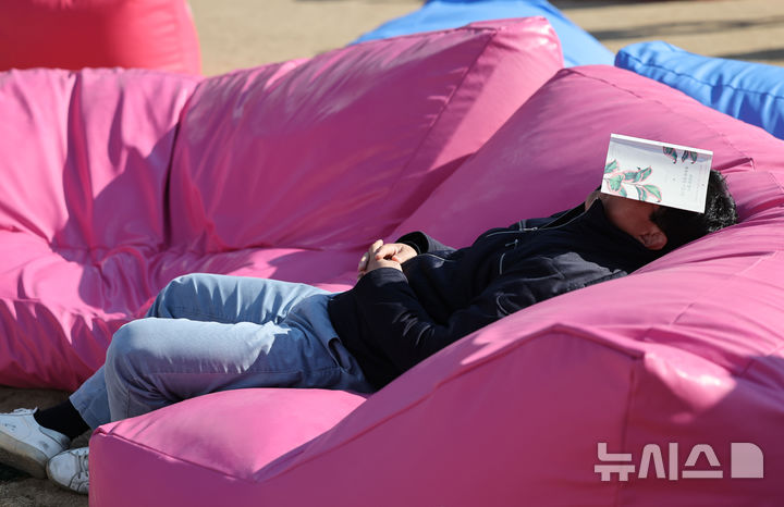 【NEWSIS】ソウルの昼間の気温が17度まで上がって温かい晩秋の一日となった8日、ソウル市中区の「本を読むソウル広場」では、訪れた市民が秋の日差しの中で読書をしつつ一休みしていた。