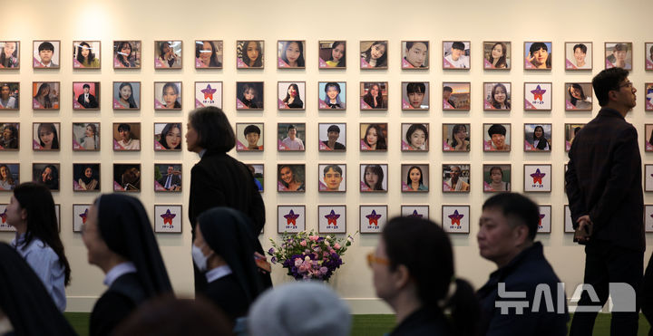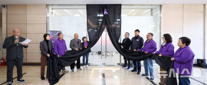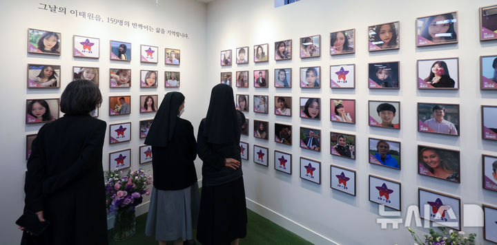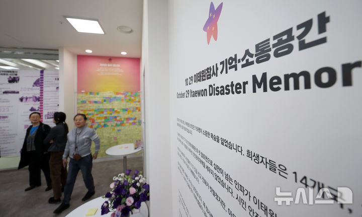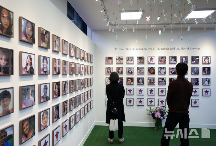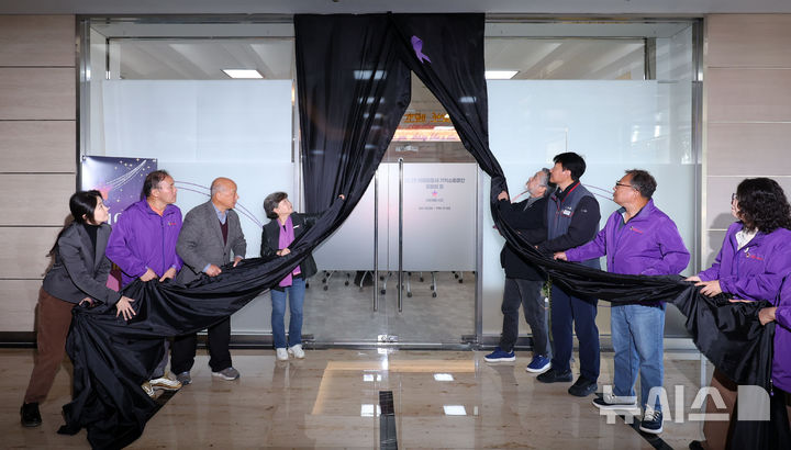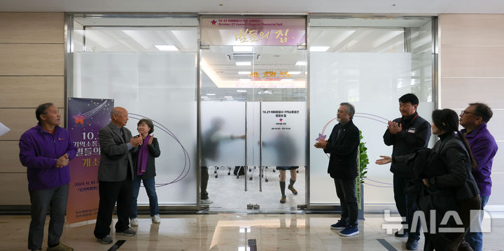【NEWSIS】10日、ソウル市鍾路区の積善現代ビルに、ソウル梨泰院雑踏事故を忘れないための追悼スペース「星たちの家」の開所式が行われた。写真は序幕式を行ったイ・ジョンミン遺族協議会運営委員長=写真右から4人目=ら出席者たち。