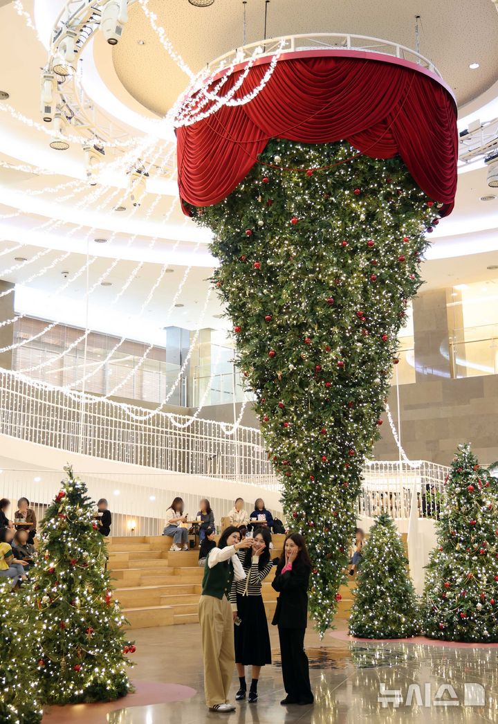 【NEWSIS】ロッテデパート釜山本店(釜山市釜山鎮区)9階のel ARENA広場に12日、高さ7メートルの大型「逆さまツリー」が設置され、市民の注目を集めている。